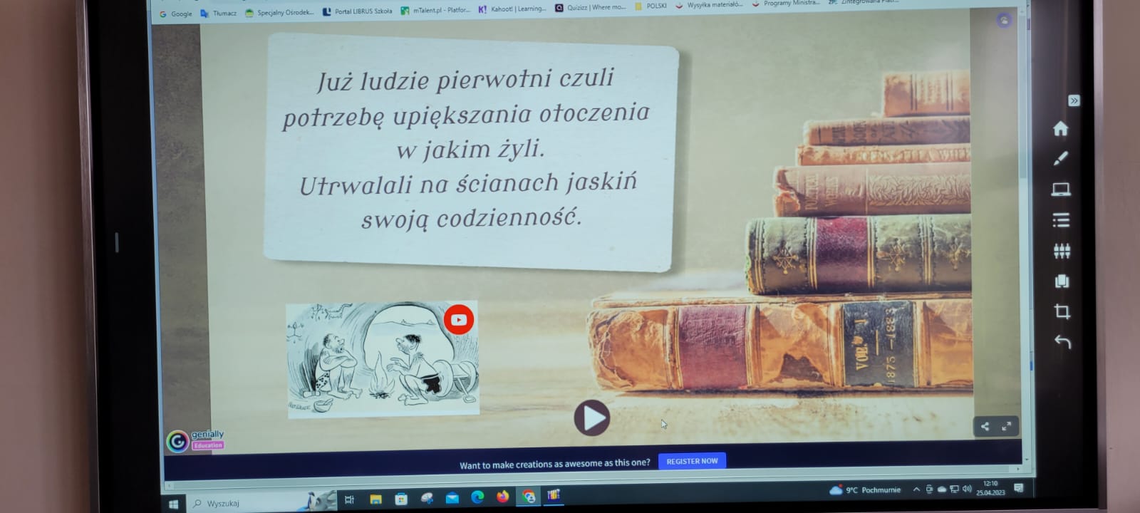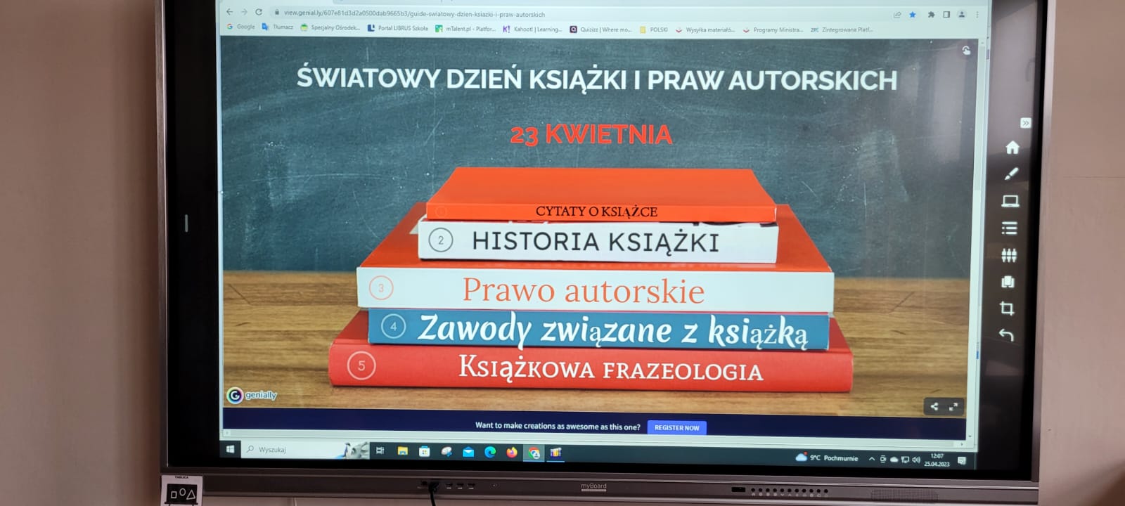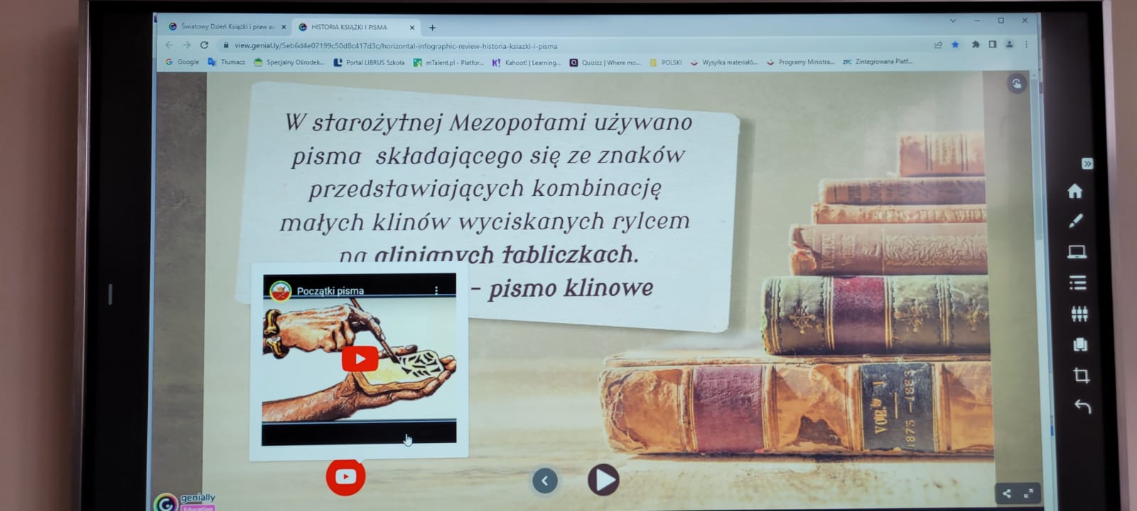 Wyjątkową przygodę z historią książki w tle odbyli uczniowie klasy 5a i 8b SP. Z okazji Światowego Dnia Książki i Praw Autorskich biblioteka szkolna zamieniła się w wehikuł czasu. Pani Magdalena Janiak prowadziła uczniów przez różne epoki i kraje, pokazując, że historia rozwoju książki  jest nie tylko bardzo długa, ale też niezwykle ciekawa. Uczniowie podczas prezentacji na temat „Historii książki” zapoznali się z etapami powstawania książki od czasów najdawniejszych do współczesnych. Już na samym początku dowiedzieli się, czym było pismo obrazkowe. Mogli też przyjrzeć się pierwszym książkom, które pisane były na rozmaitych materiałach: tabliczkach z gliny, jedwabiu, papirusie (wykonanym z trzciny), pergaminie (skórach zwierzęcych) i papierze (z rozdrobnionych szmat). Następnie uczniowie przenieśli się do starożytnej Grecji i Rzymu, gdzie poznali takie pojęcia jak: tabliczka woskowa i zwój.  Kolejnym „przystankiem” w podróży było średniowiecze. Tu nie mogło zabraknąć historii o pięknie zdobionych rękopisach i kodeksach. Z epoki średniowiecza uczniowie przenieśli się do czasów książki drukowanej. Dowiedzieli się, że przełomem w historii książki było wynalezienie druku przez Gutenberga. Dalsza część zajęć przedstawiała historię powstania książek drukowanych od  XVIII  do XX wieku. Podróż po historii książki zakończyła się w czasach współczesnych. Uczniowie poznali popularne obecnie formy książek, czyli audiobooki oraz książki elektroniczne (e-booki).