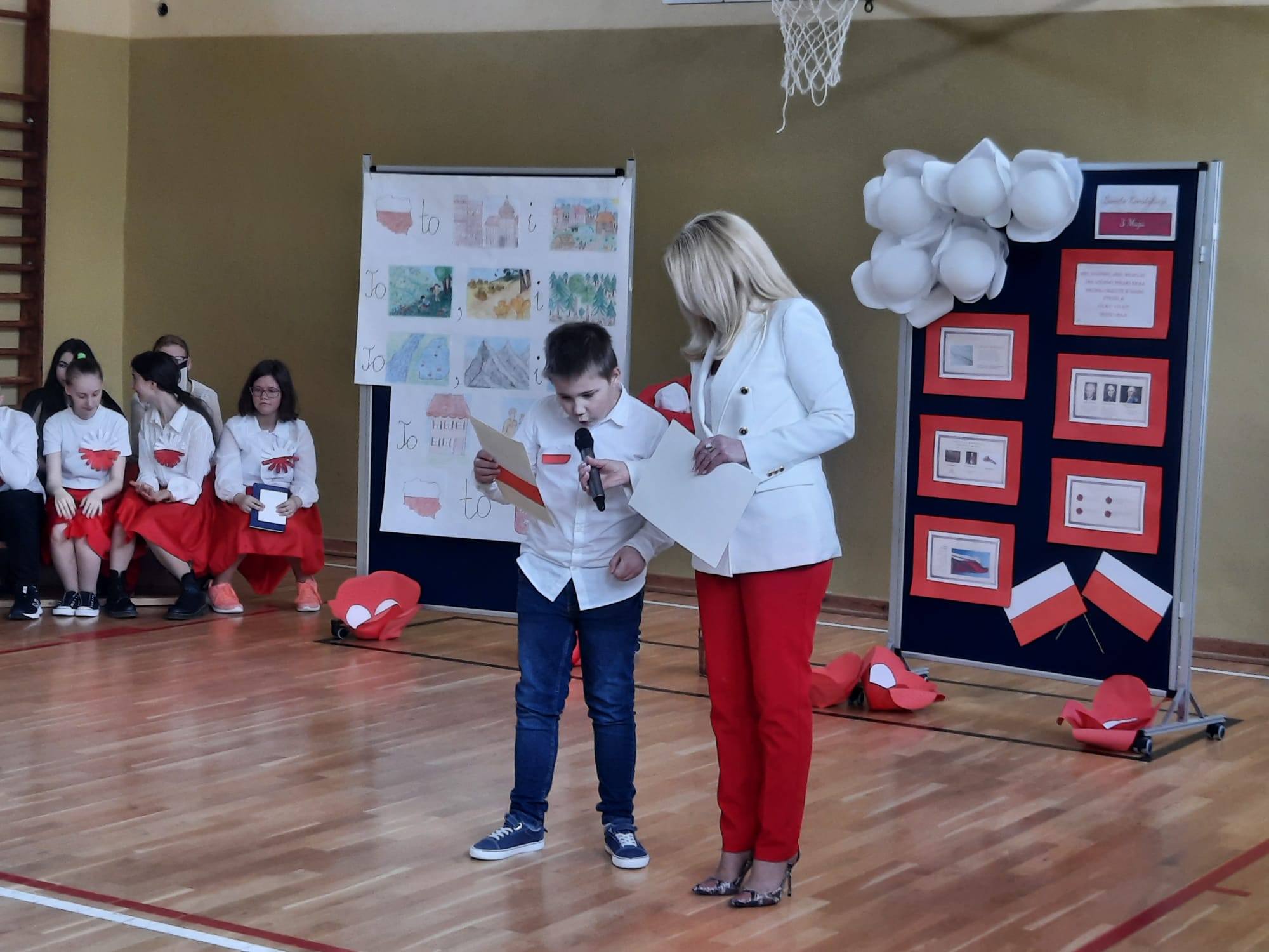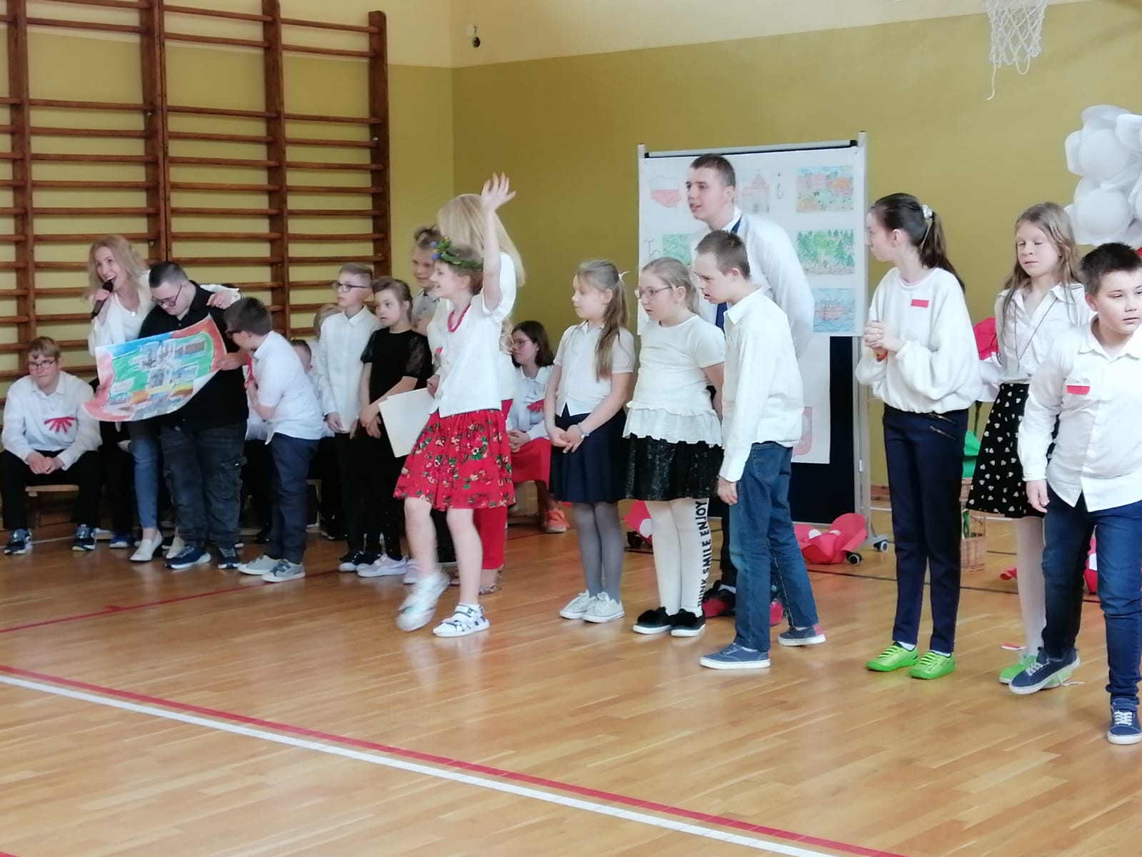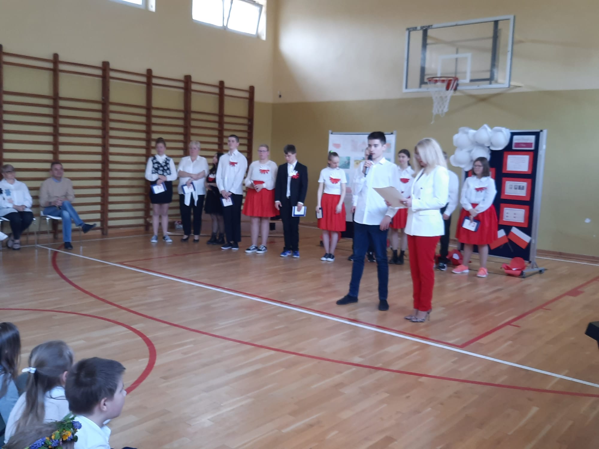 Podczas uroczystości uczniom przybliżono w dostępnej i zrozumiałej formie znaczenie obchodów Święta Konstytucji 3 Maja. Dzieci i młodzież wysłuchali krótkiego rysu historycznego w formie dialogu oraz obejrzeli krótki film tematyczny z Muzeum Narodowego w Warszawie. Uroczystość uświetniły występy i tych młodszych i tych starszych artystów naszej szkoły, którzy z ogromnym zaangażowaniem tańczyli, recytowali, czytali i przedstawiali swoje prace plastyczne dotyczące szacunku i więzi z Ojczyzną.