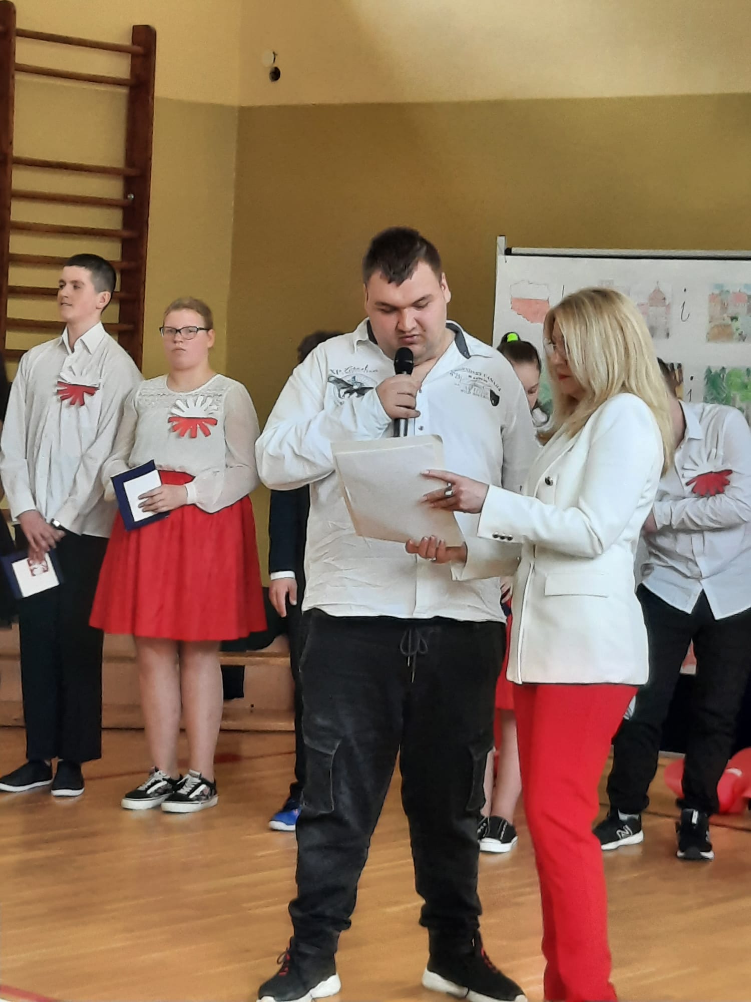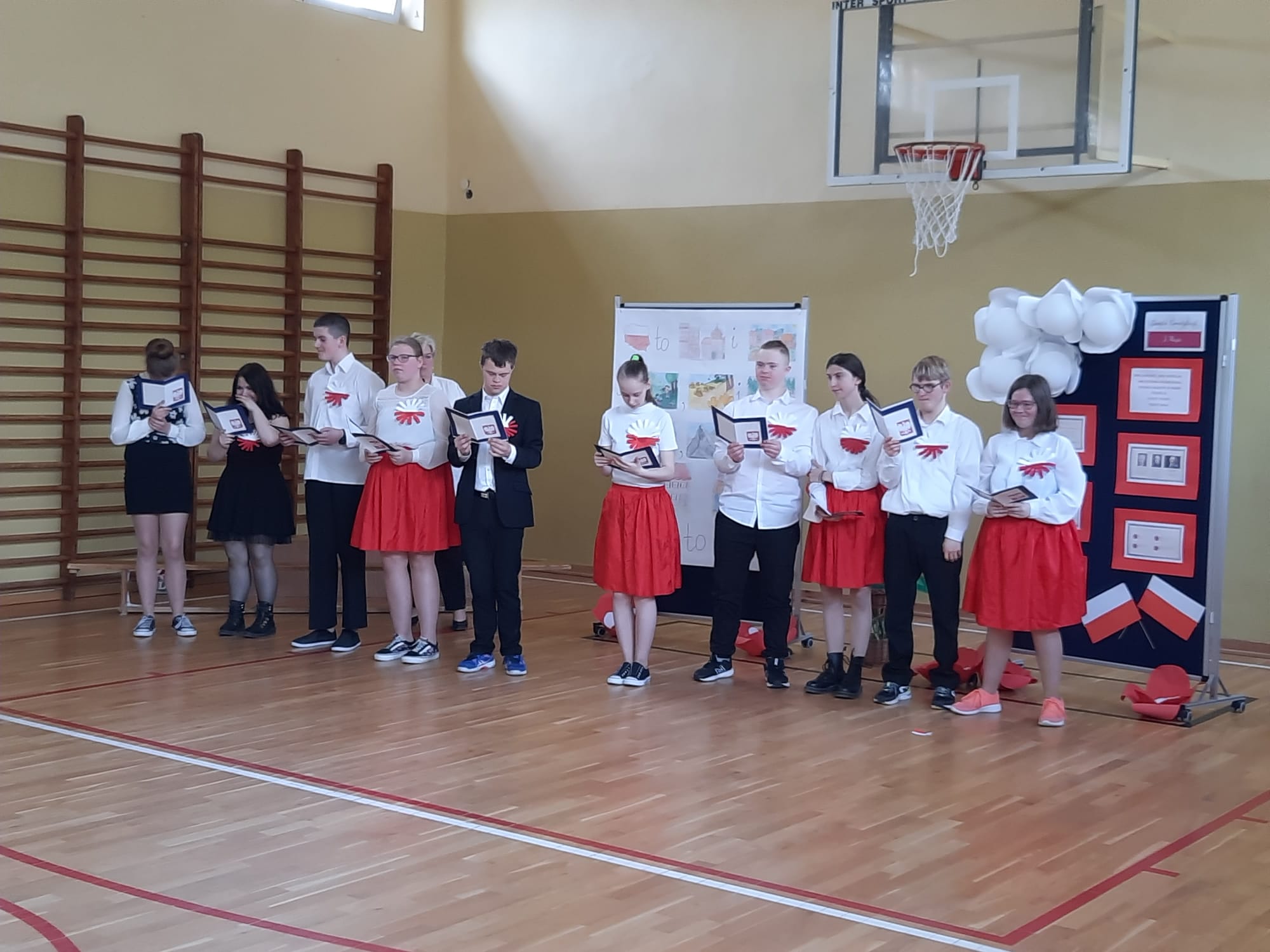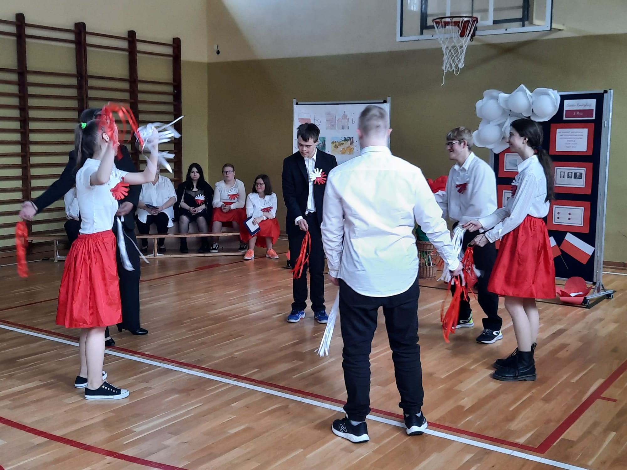 Podczas uroczystości uczniom przybliżono w dostępnej i zrozumiałej formie znaczenie obchodów Święta Konstytucji 3 Maja. Dzieci i młodzież wysłuchali krótkiego rysu historycznego w formie dialogu oraz obejrzeli krótki film tematyczny z Muzeum Narodowego w Warszawie. Uroczystość uświetniły występy i tych młodszych i tych starszych artystów naszej szkoły, którzy z ogromnym zaangażowaniem tańczyli, recytowali, czytali i przedstawiali swoje prace plastyczne dotyczące szacunku i więzi z Ojczyzną.