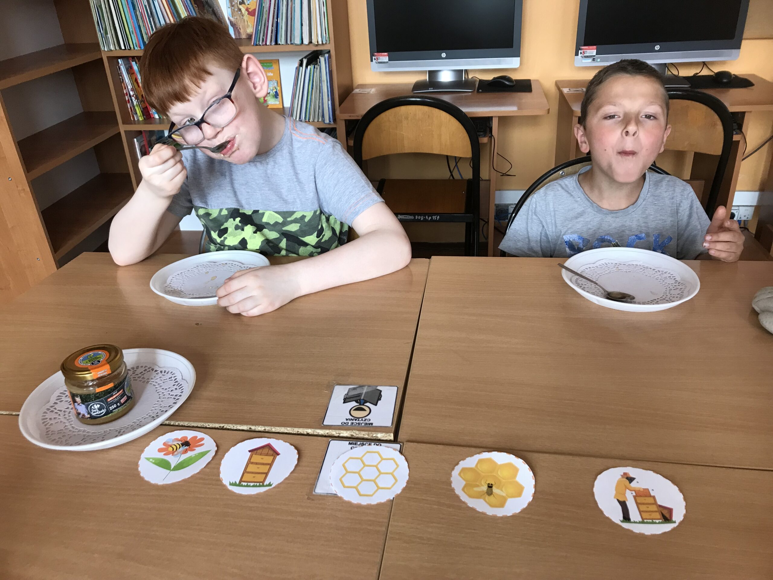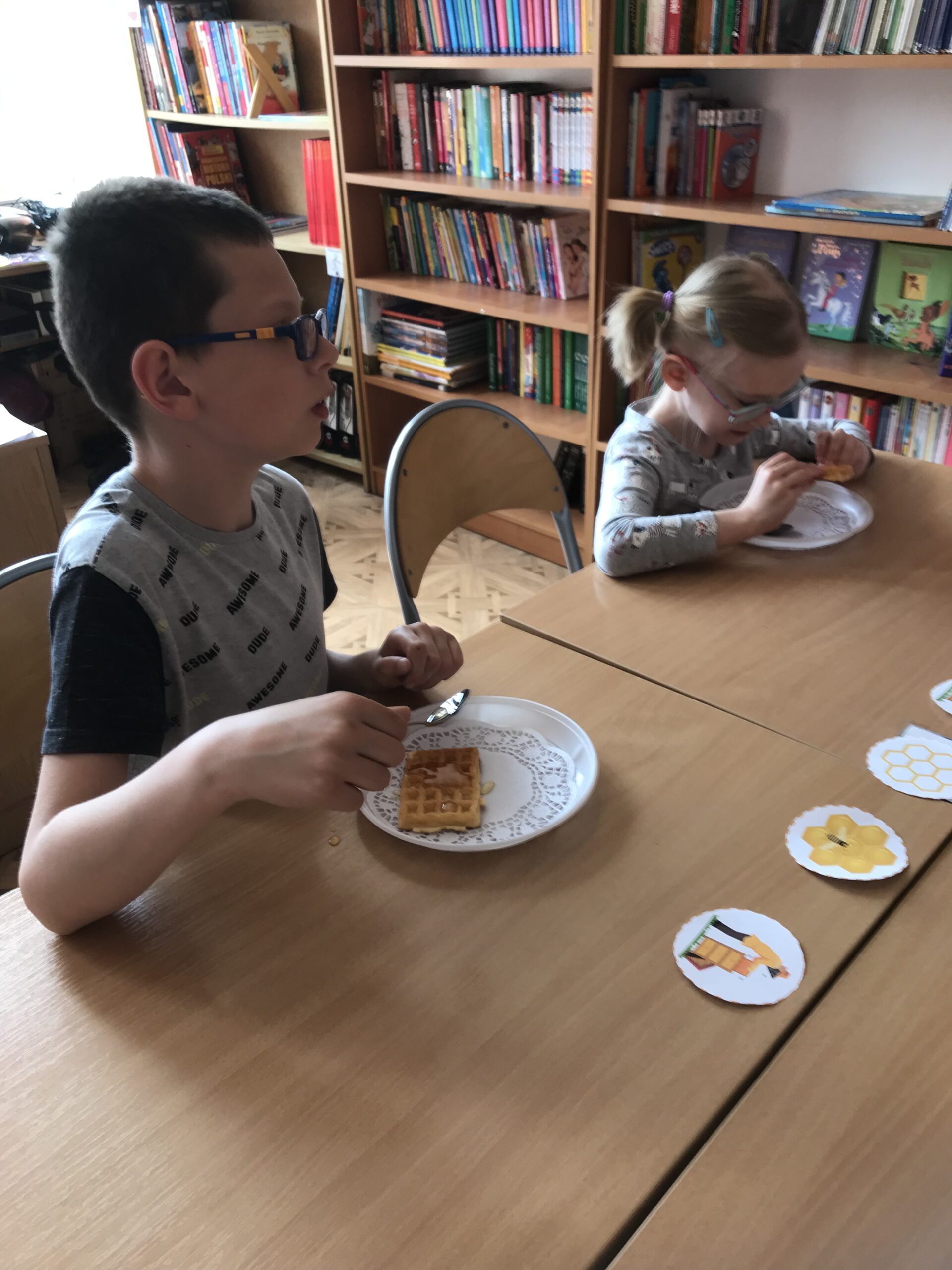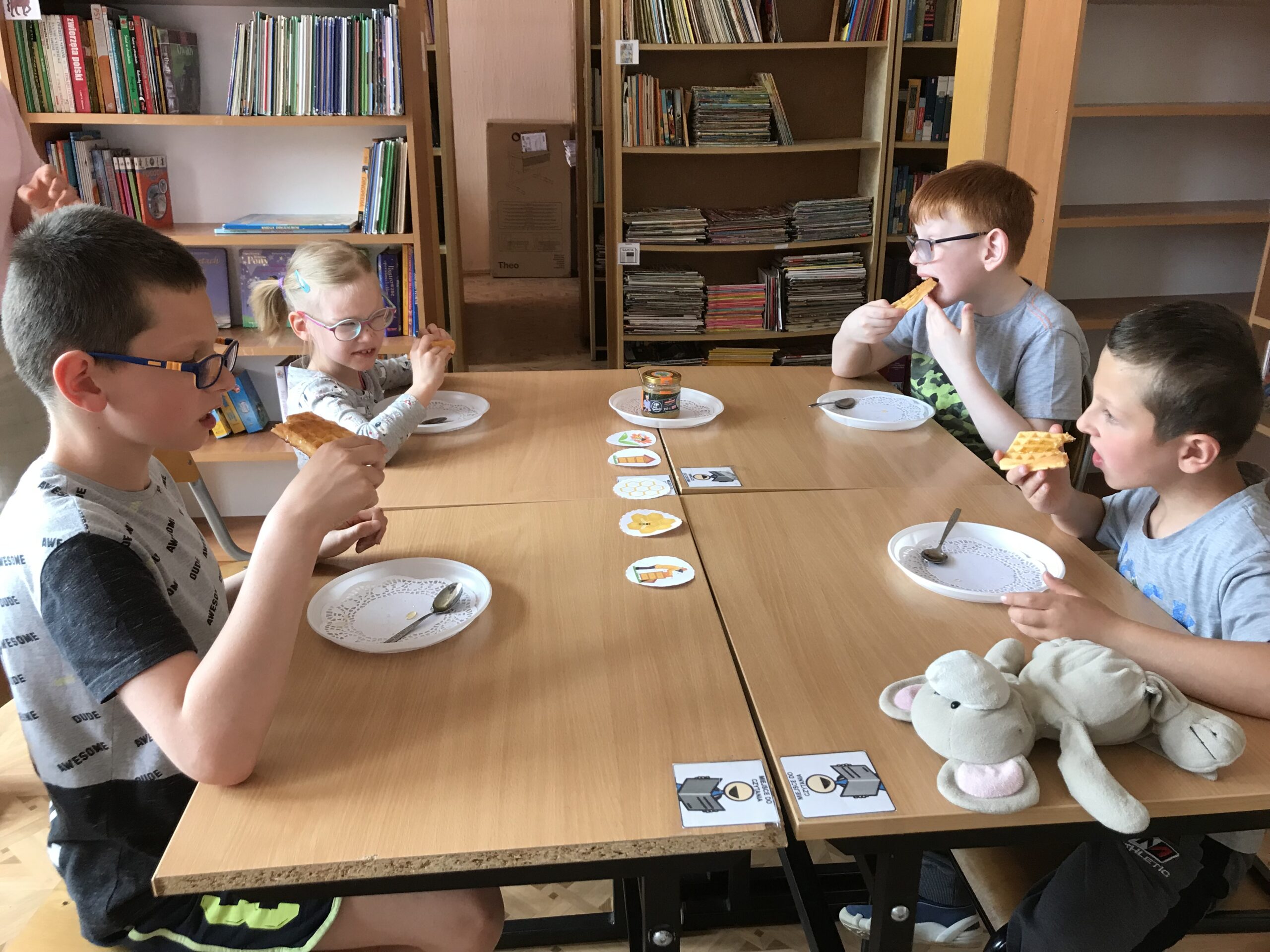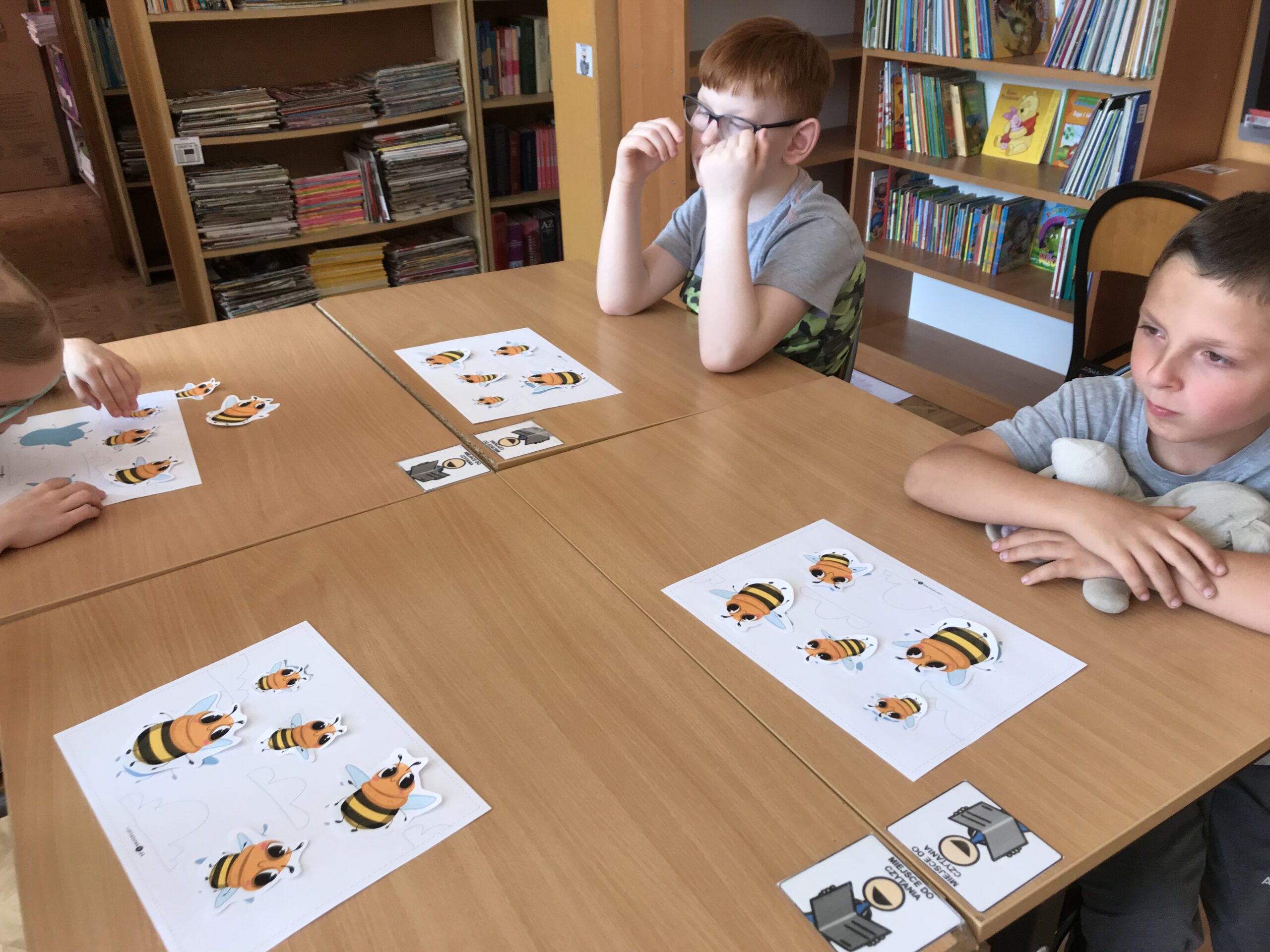 Mali Agenci trafili do szkółki dla pszczółek. Lekcja biblioteczna „Na ratunek pszczołom!” odbyła się z okazji Światowego Dnia Pszczół. Tym razem w bibliotece szkolnej zakwitła wiosenna łąka, na której uczniowie klasy 1/2 c ZET szukali kwiatów, z których zbierali pyłek i… zadania do wykonania. Mali Agenci rozpoczęli misję od wspólnego zaśpiewania piosenki „Leci pszczoła”. Następnie wykonali tajne zadania; m.in. przeprowadzili małą pszczółkę przez labirynt, ułożyli puzzle, czy odnaleźli kolorowe ule. Uczniowie dowiedzieli się także, w jaki sposób pracują pszczoły miodne. Po wykonaniu wszystkich zadań Mali Agenci zjedli gofry z przepysznym, złotym miodem.