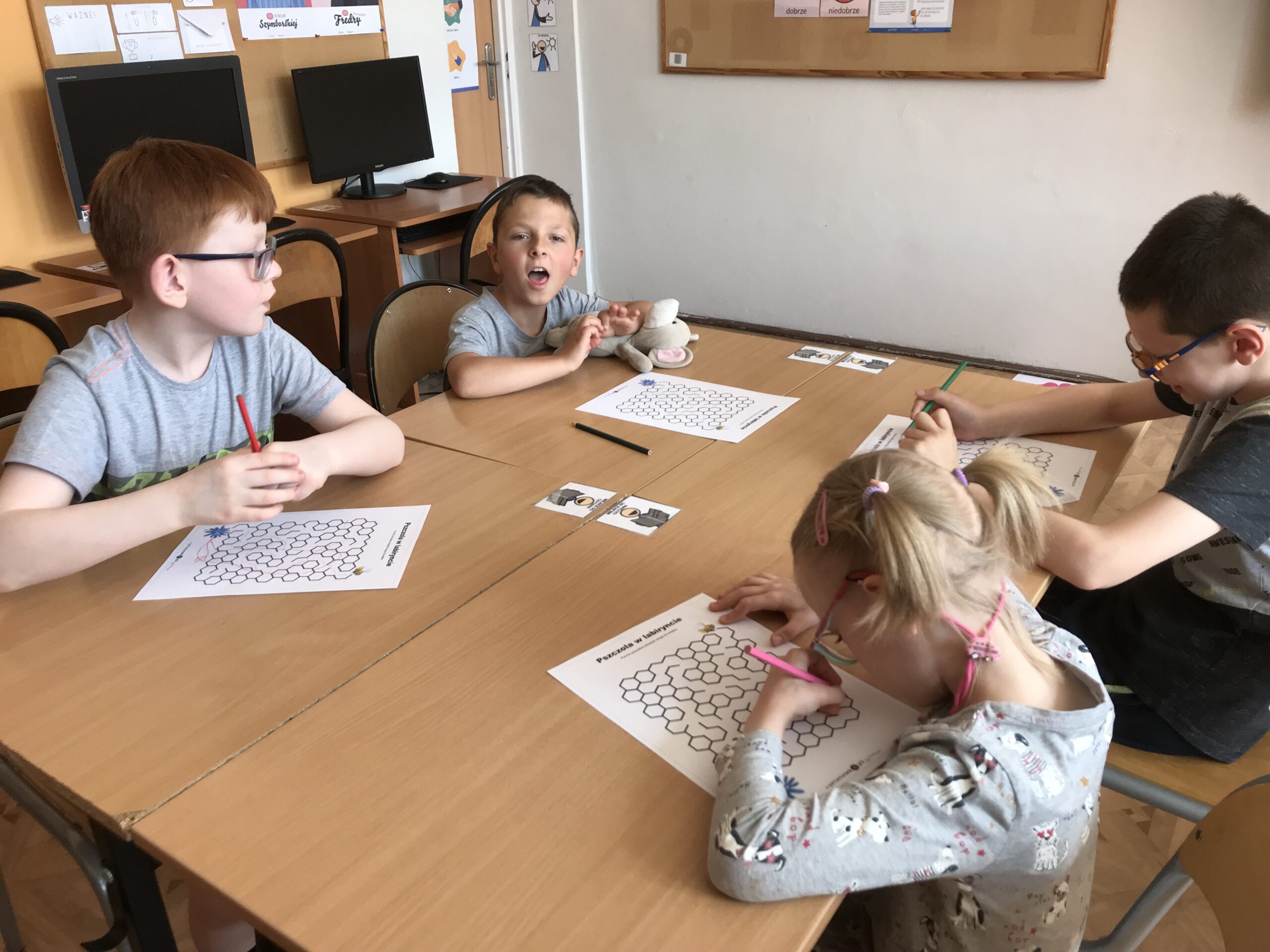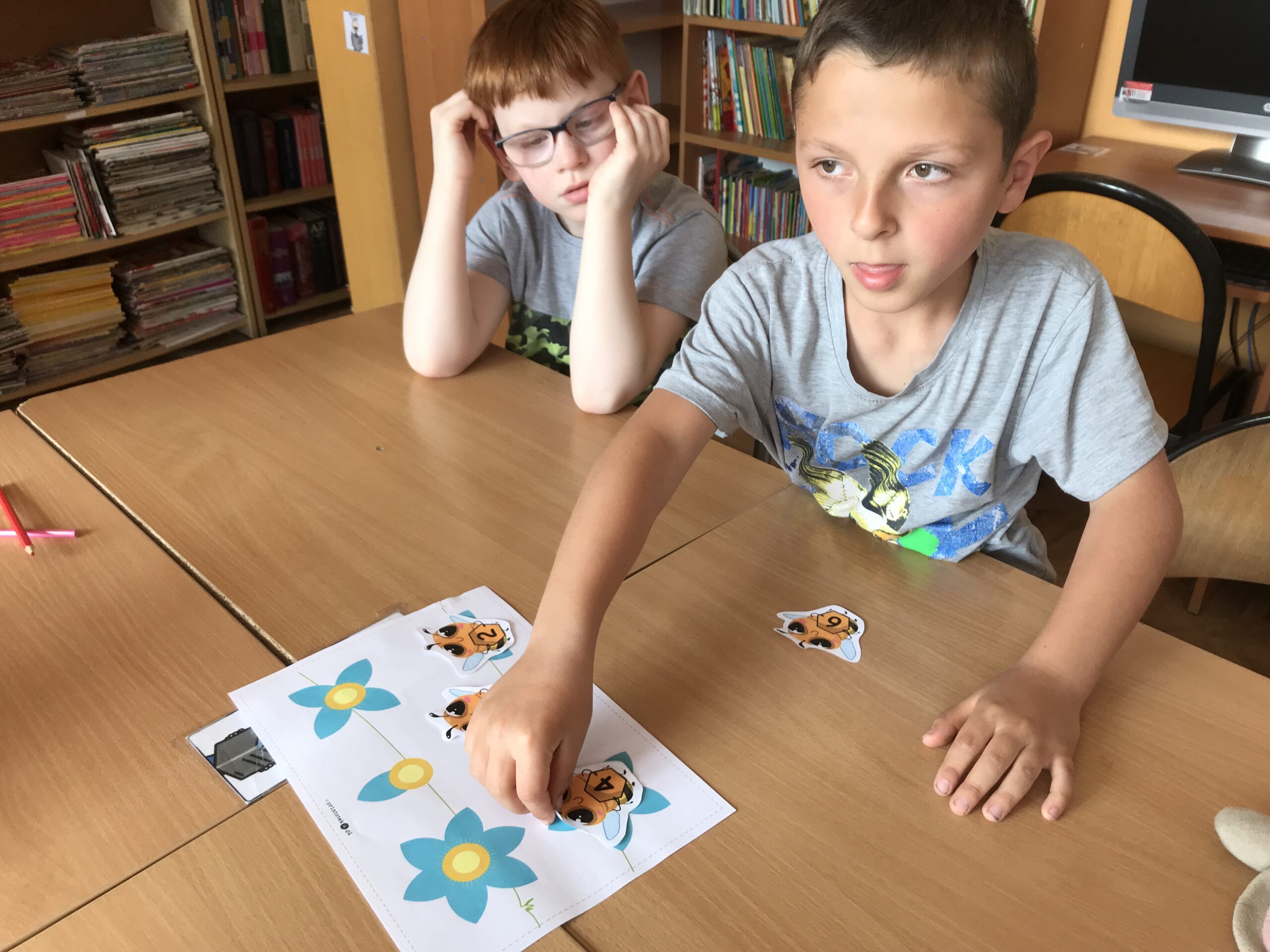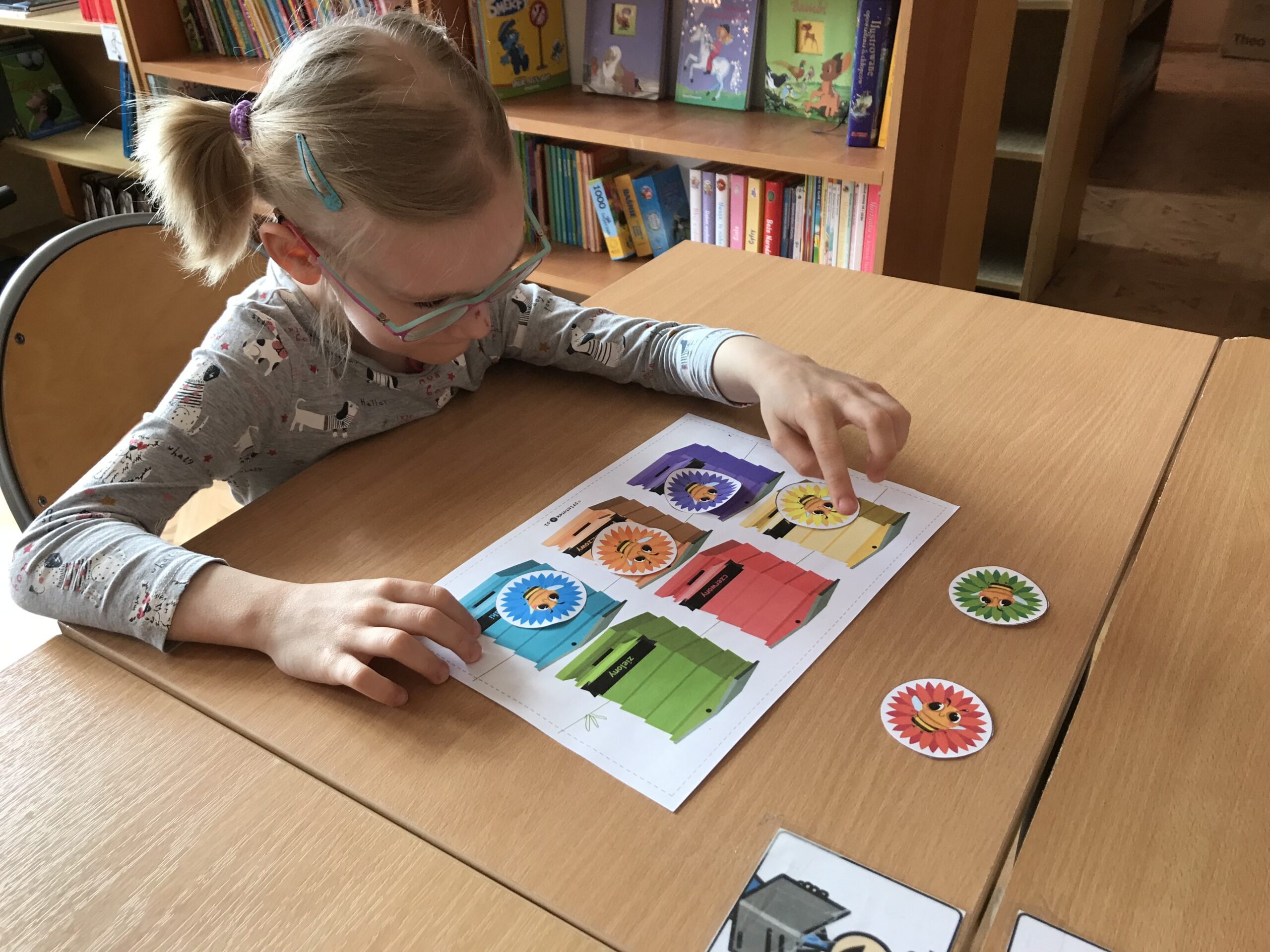 Mali Agenci trafili do szkółki dla pszczółek. Lekcja biblioteczna „Na ratunek pszczołom!” odbyła się z okazji Światowego Dnia Pszczół. Tym razem w bibliotece szkolnej zakwitła wiosenna łąka, na której uczniowie klasy 1/2 c ZET szukali kwiatów, z których zbierali pyłek i… zadania do wykonania. Mali Agenci rozpoczęli misję od wspólnego zaśpiewania piosenki „Leci pszczoła”. Następnie wykonali tajne zadania; m.in. przeprowadzili małą pszczółkę przez labirynt, ułożyli puzzle, czy odnaleźli kolorowe ule. Uczniowie dowiedzieli się także, w jaki sposób pracują pszczoły miodne. Po wykonaniu wszystkich zadań Mali Agenci zjedli gofry z przepysznym, złotym miodem.