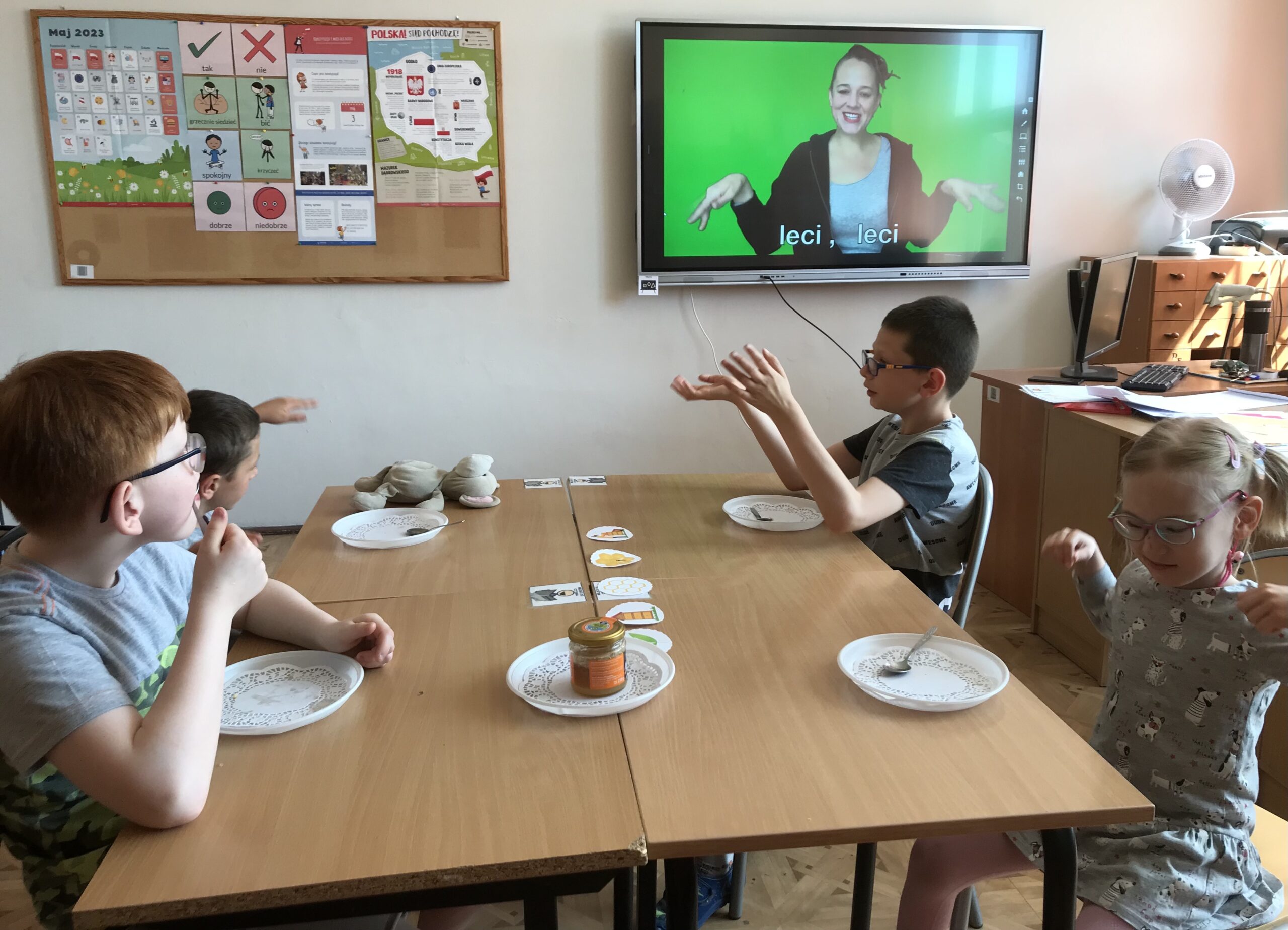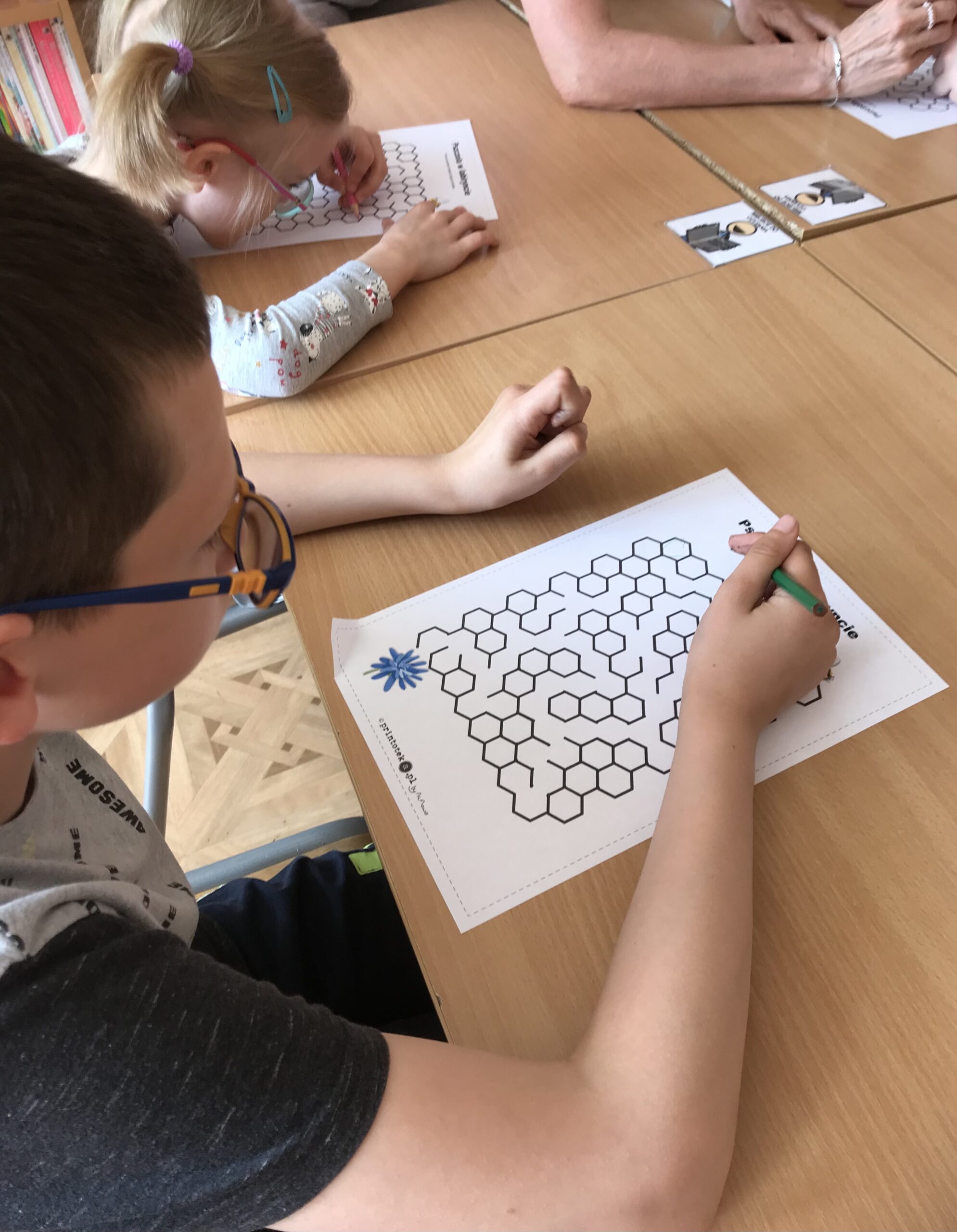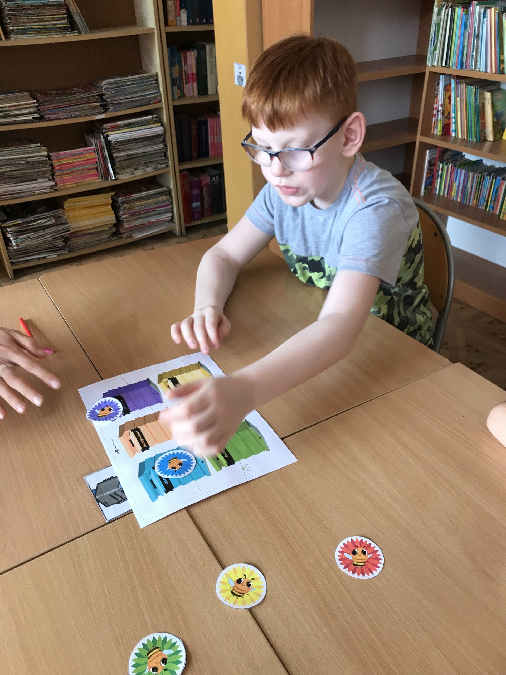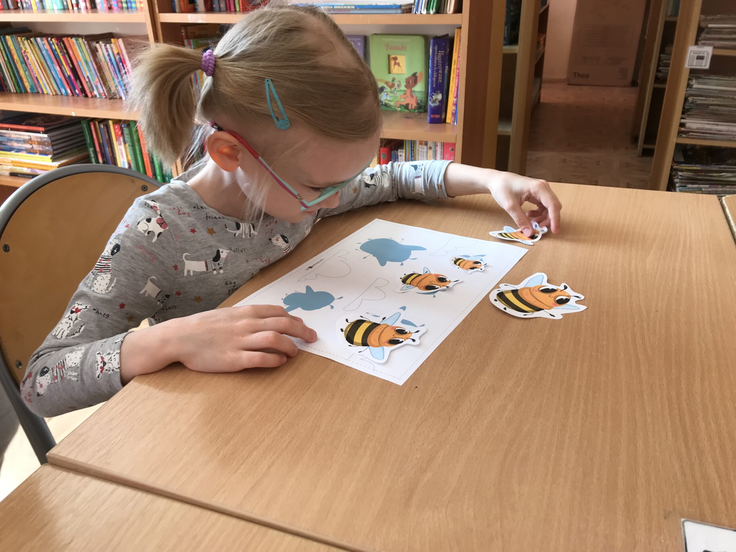 Mali Agenci trafili do szkółki dla pszczółek. Lekcja biblioteczna „Na ratunek pszczołom!” odbyła się z okazji Światowego Dnia Pszczół. Tym razem w bibliotece szkolnej zakwitła wiosenna łąka, na której uczniowie klasy 1/2 c ZET szukali kwiatów, z których zbierali pyłek i… zadania do wykonania. Mali Agenci rozpoczęli misję od wspólnego zaśpiewania piosenki „Leci pszczoła”. Następnie wykonali tajne zadania; m.in. przeprowadzili małą pszczółkę przez labirynt, ułożyli puzzle, czy odnaleźli kolorowe ule. Uczniowie dowiedzieli się także, w jaki sposób pracują pszczoły miodne. Po wykonaniu wszystkich zadań Mali Agenci zjedli gofry z przepysznym, złotym miodem.