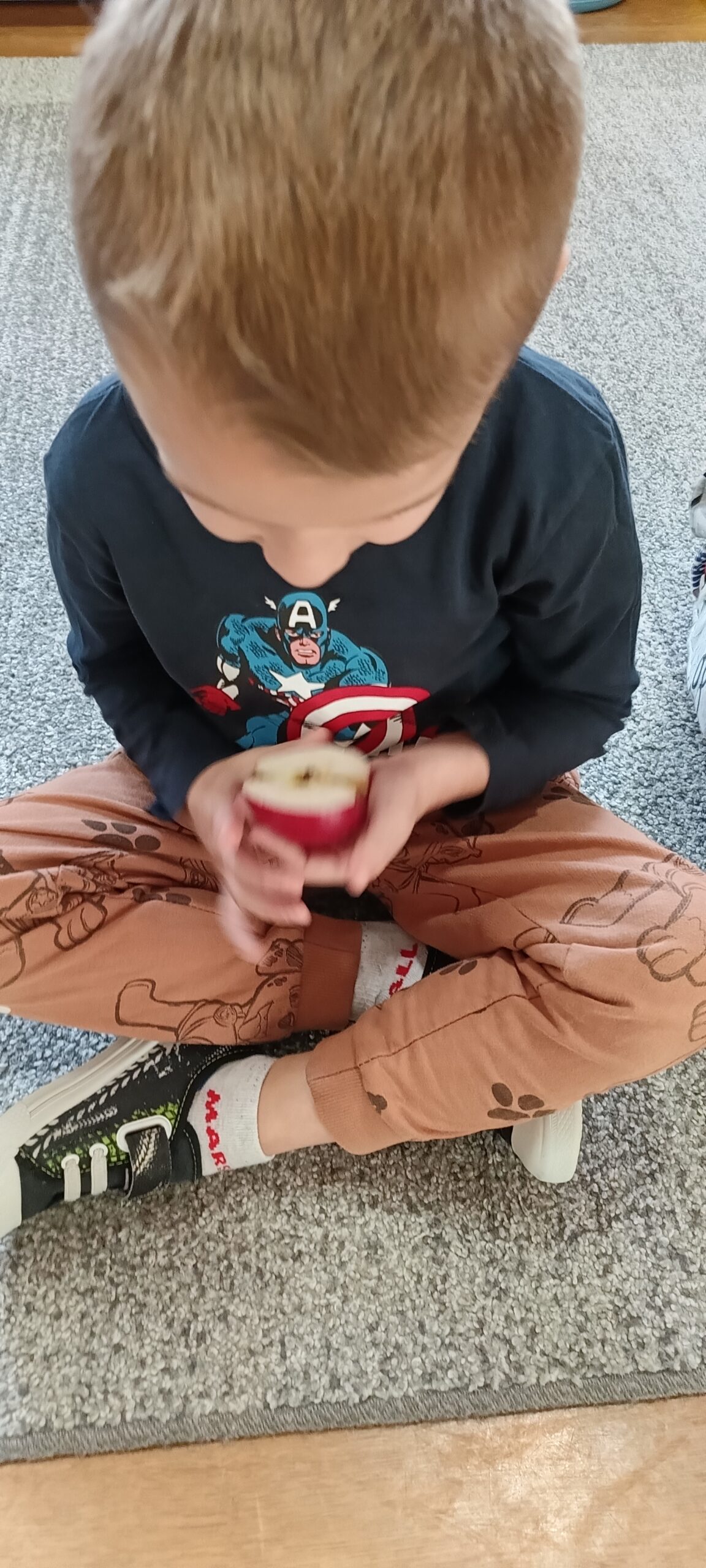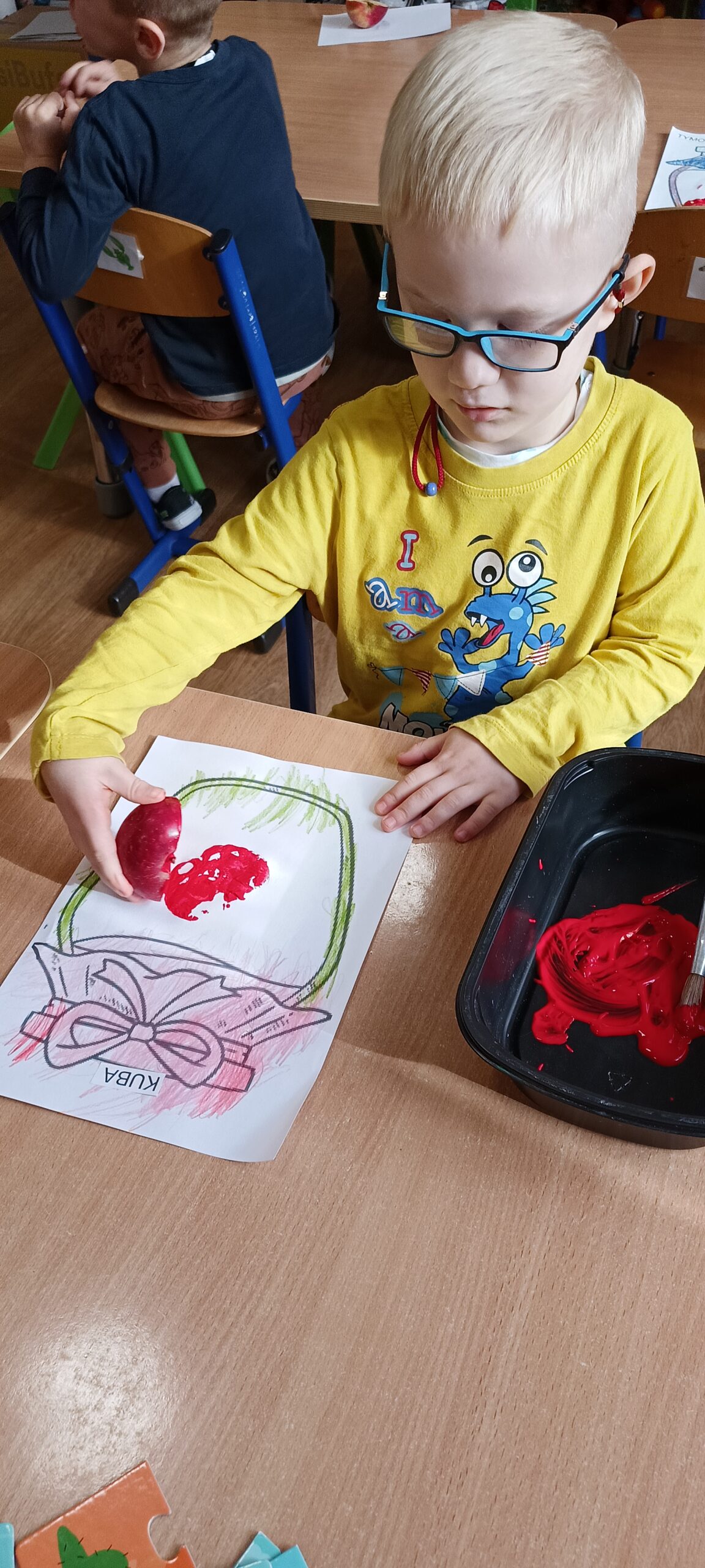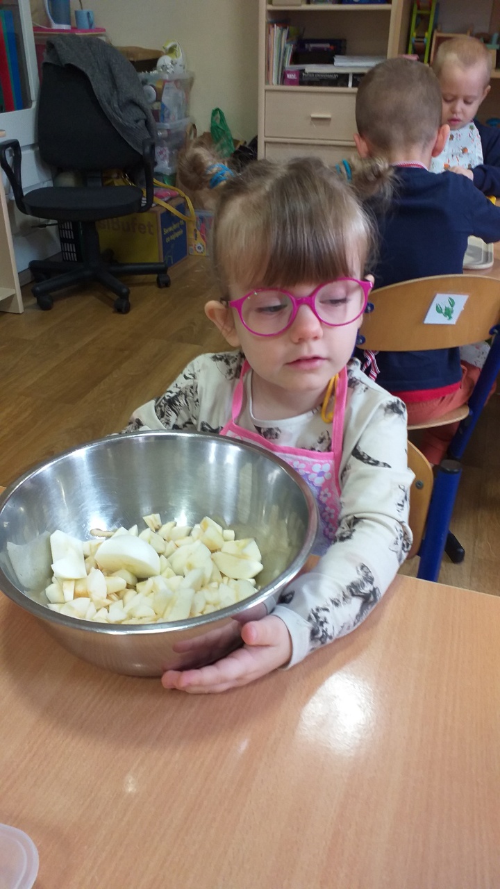 W minionym tygodniu rozmawialiśmy o owocach – poznaliśmy ich nazwy, smak, kształt. Z jabłek zrobiliśmy pyszne ciasto. Nauczyliśmy się wiersza Wpadła gruszka do fartuszka. Wykonaliśmy pracę plastyczną – kompot z jabłek.
