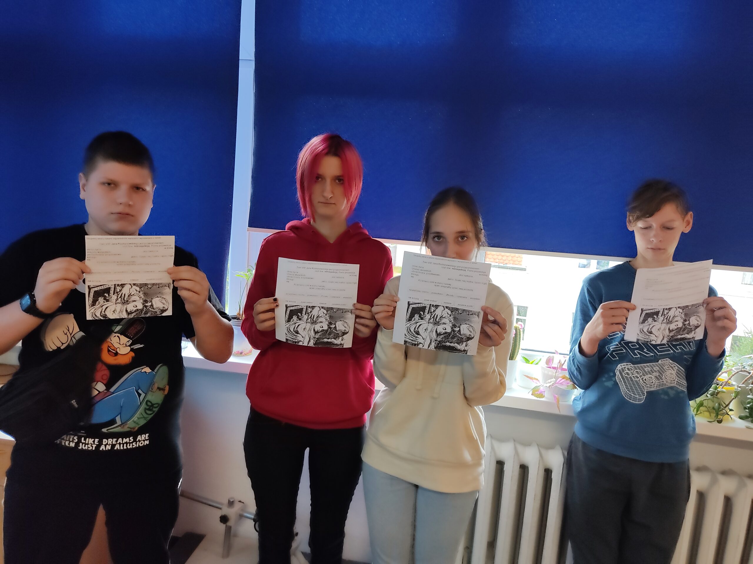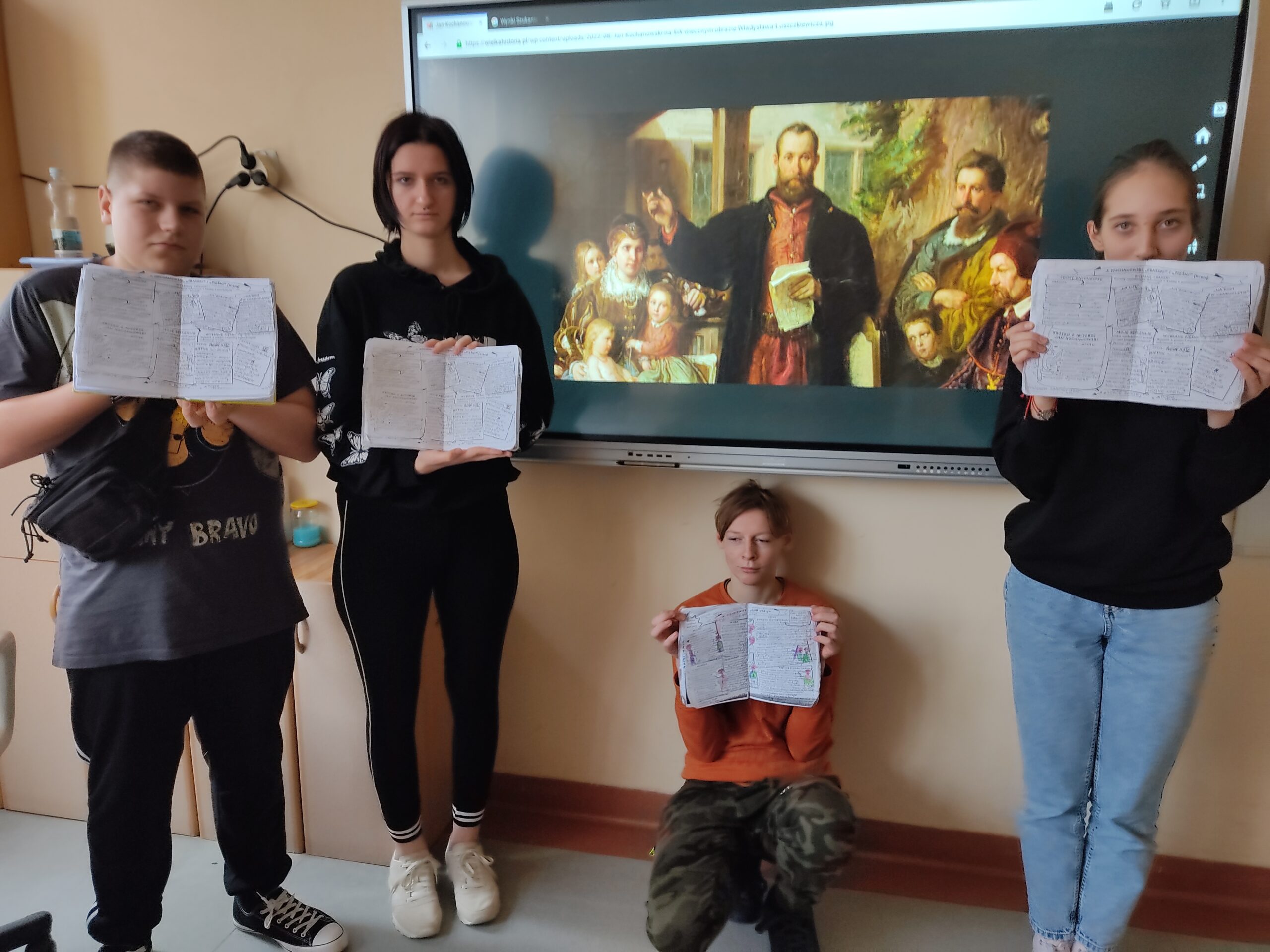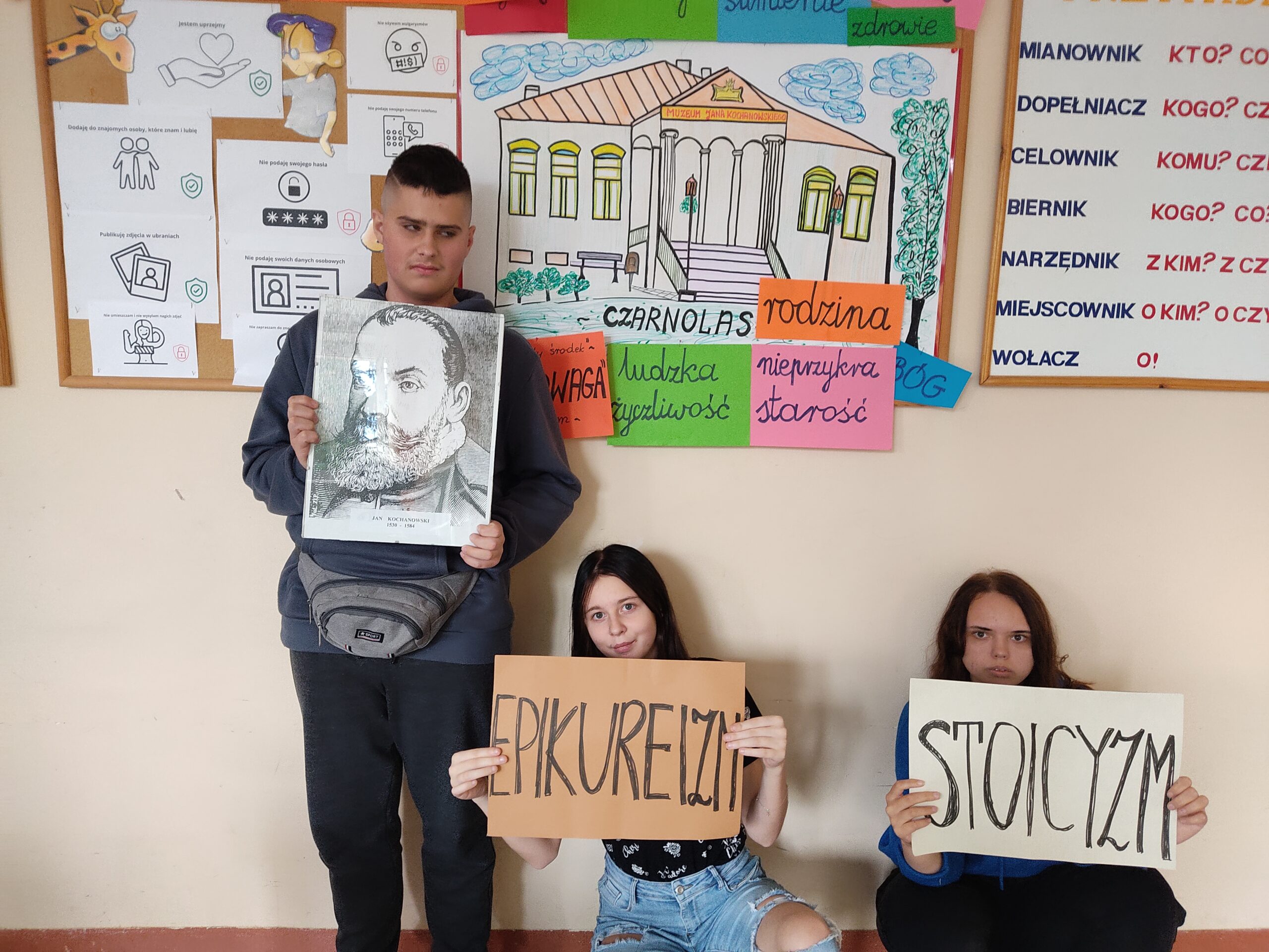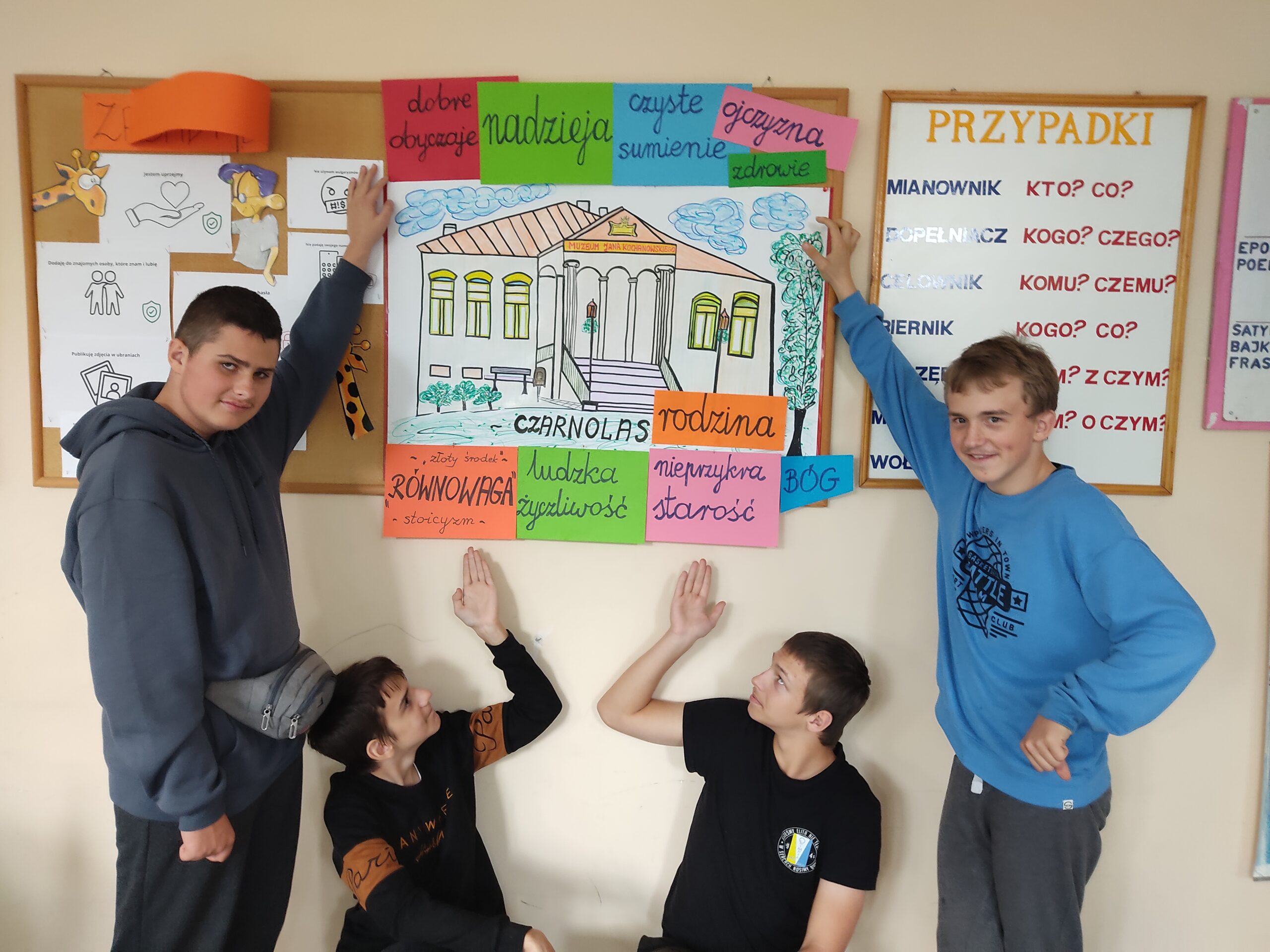 Związek fraszek Jana Kochanowskiego z jego życiem i pracą łatwiej było uczniom przedstawić w formie graficznej. Na rysunki korespondujące z fraszką „Na dom w Czarnolesie” ósmoklasiści – w myśl przekazu poety- nanosili etykiety w odpowiedzi na pytanie, co w życiu jest najważniejsze. Słowa klucze: zdrowie, rodzina, czyste sumienie, życzliwość ludzi, „znośne obyczaje”, „nieprzykra starość”, pokój w sercu i ojczyźnie to przecież to, co i współcześnie zbliża nas do szczęścia.