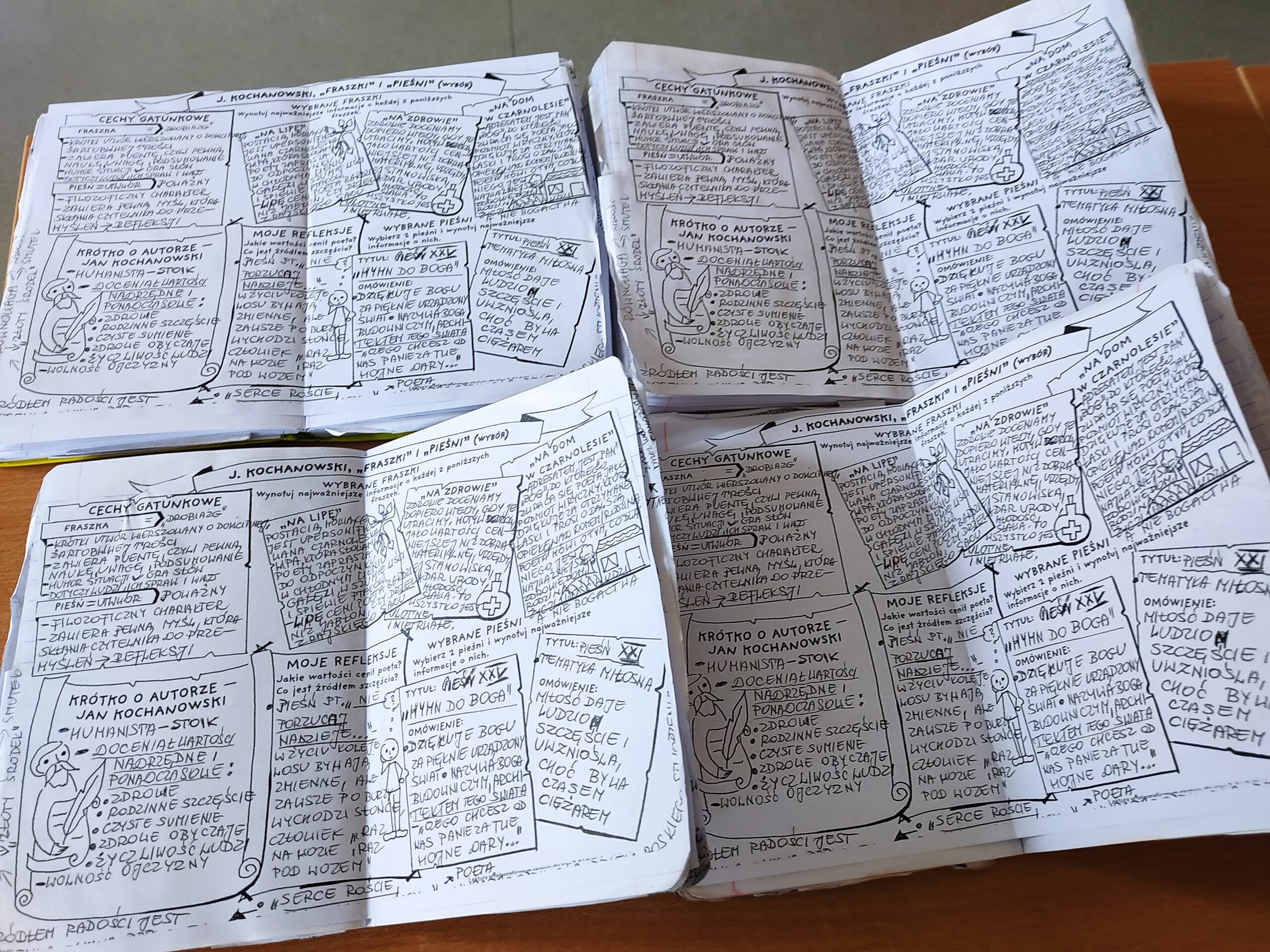 Sketchnoting okazał się dla tegorocznych ósmoklasistów doskonałą metodą poznania wartości nadrzędnych, uniwersalnych i ponadczasowych, o których prosto, a zarazem niezwykle przekonywająco pisze mistrz słowa- Jan Kochanowski. Za sprawą treści zawartej w rysnotkach uczniowie zgłębiali tajniki ludzkiej natury, dowiadując się, jak żyć, by być szczęśliwym i spełnionym. Renesansowy stoik apeluje, aby nie porzucać nadziei w chwilach zwątpienia, bo „złotym środkiem” jest równowaga, której i nam współcześnie niejednokrotnie brakuje.