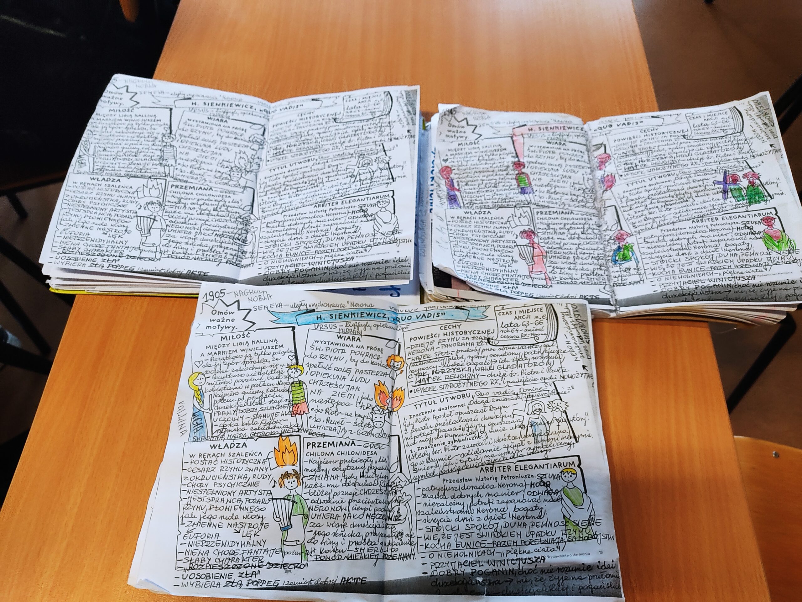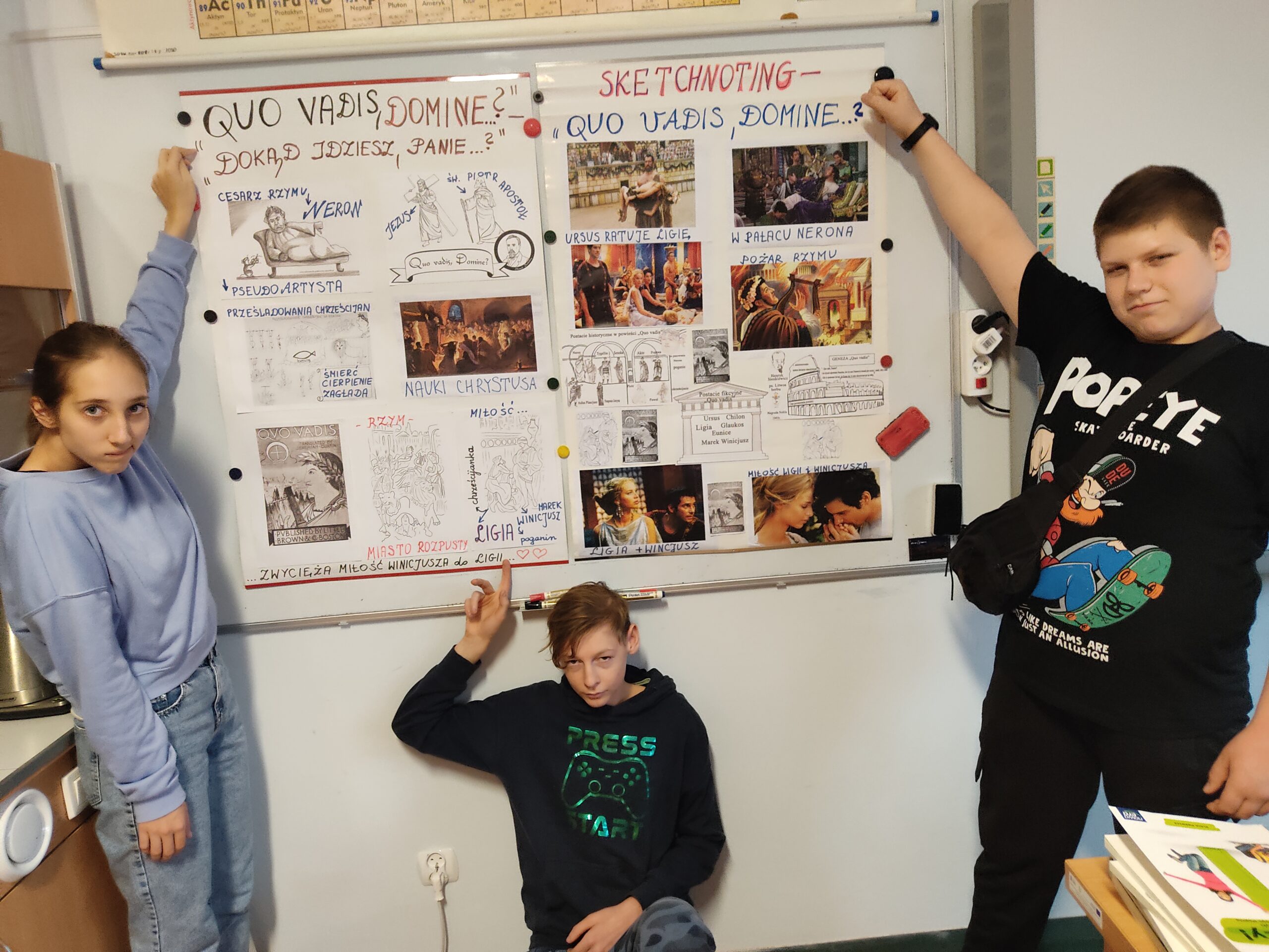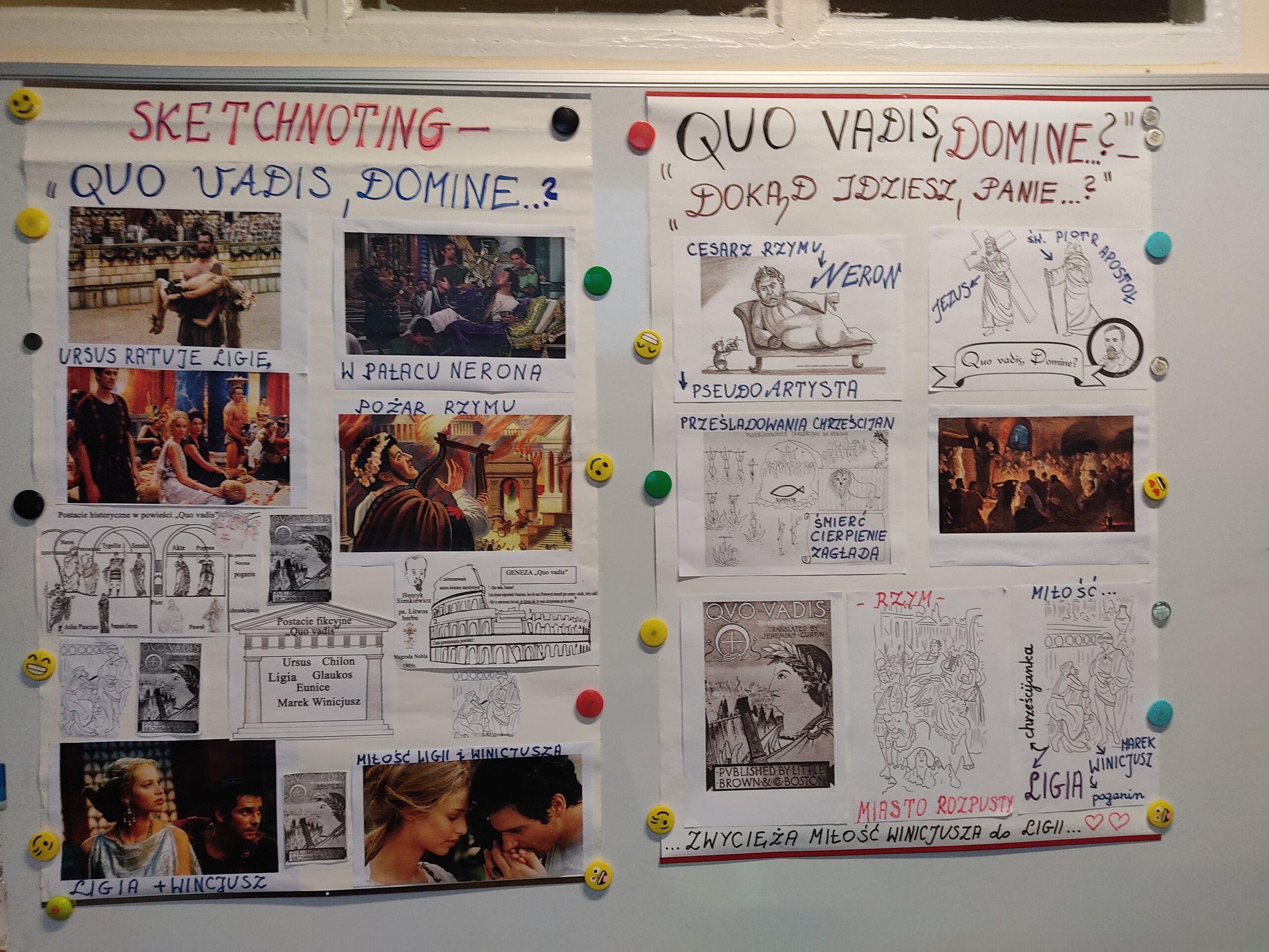Powieść historyczna ukazuje zderzenie dwóch przeciwstawnych światów: upadającego Rzymu i nadchodzącej epoki nowożytnej oraz konflikt dwóch środowisk: pogan i chrześcijan. Jako że bohaterem „Quo vadis” jest cały Rzym, a sama powieść zawiera kilka wątków: historyczny, miłosny, religijny, obyczajowy, społeczny- utwór może okazać się dla młodego odbiorcy nader trudny w przekazie. I tu z pomocą przychodzi nowatorska metoda sketchnotingu, za sprawą której treść jest bardziej zrozumiała dzięki notatkom myślograficznym.