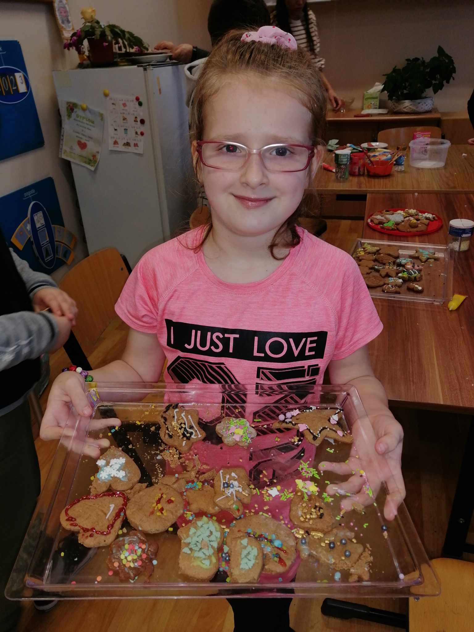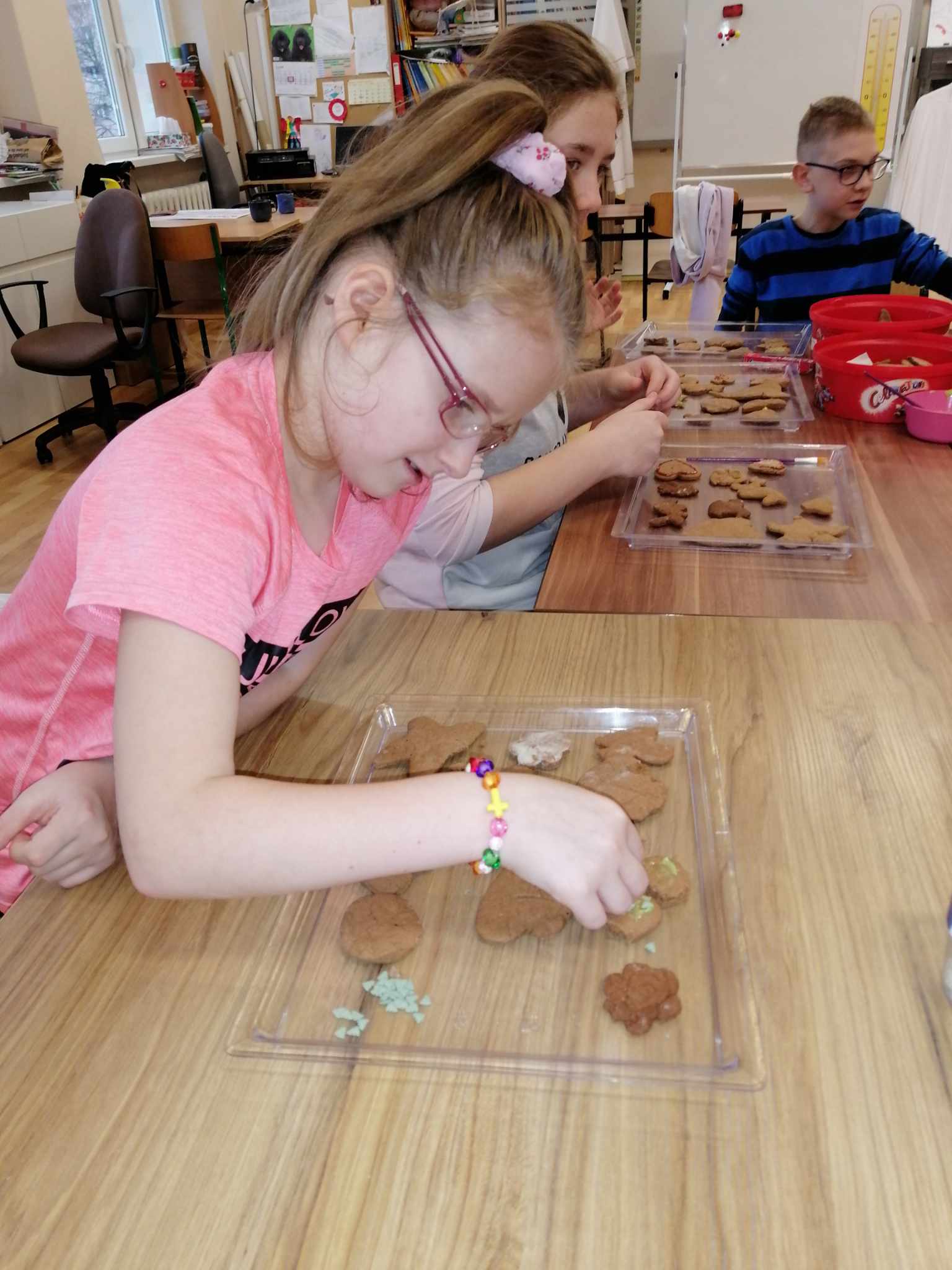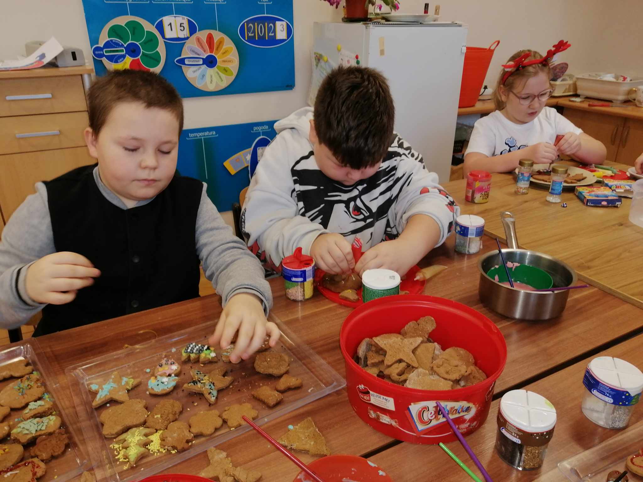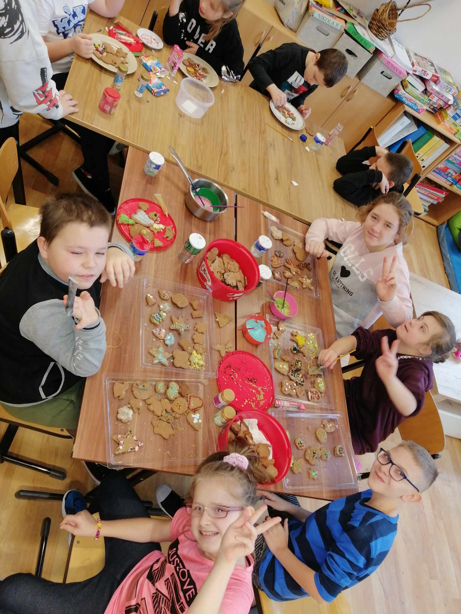 Na piątkowym spotkaniu klas SP powstały prawdziwe dzieła sztuki. Nasi młodzi cukiernicy, wykorzystując kolorowe ozdoby i lukry, dekorowali samodzielnie upieczone pierniczki, wykazując się pomysłowością i kreatywnością.  Pięknie udekorowane pierniki, czekają już na Jasełka i Wigilię.