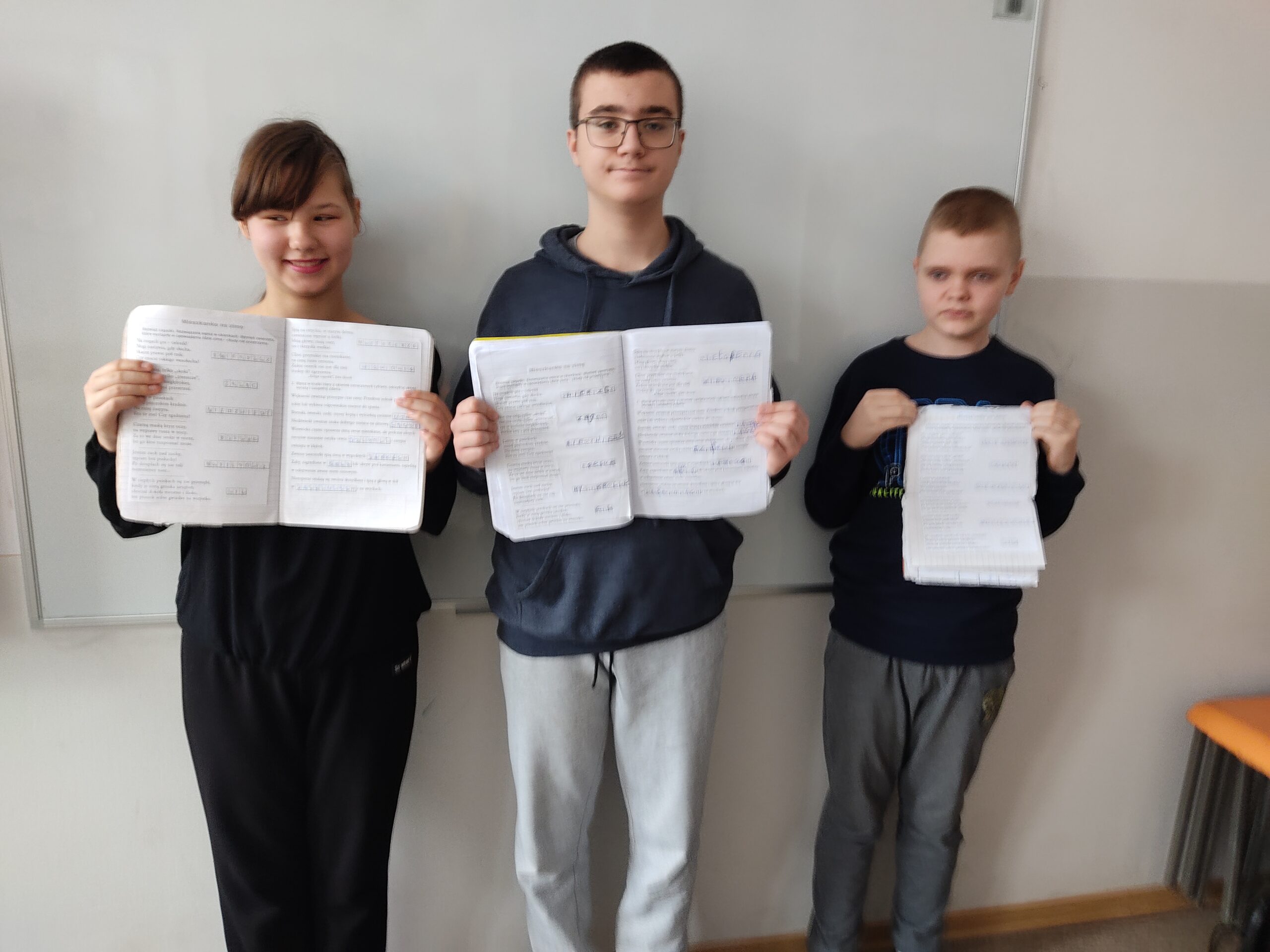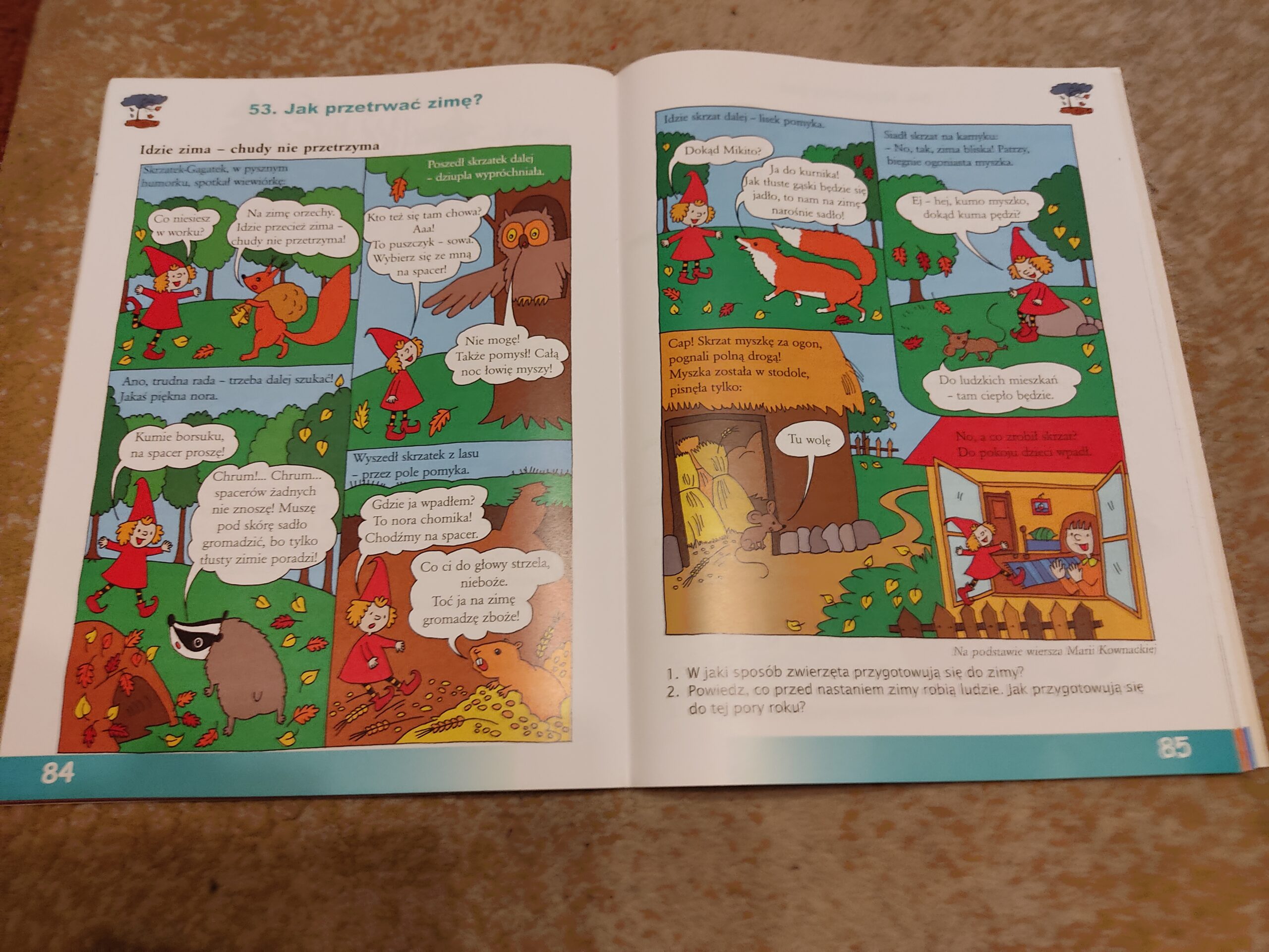 Dalsze rozważania skupione były wokół opowiadania „Idzie zima- chudy nie przetrzyma”. O przygotowaniach zwierząt do zimy przekonali się uczniowie, śledząc losy bohaterów komiksu o tym samym tytule. Szóstoklasiści w myśl hasła „Mieszkanko na zimę” kojarzyli zwierzęta z odpowiednim miejscem- bezpiecznym domem na zimę. Zadaniem młodych ekologów było odgadnięcie nazw zwierząt, o których mowa w zagadce zaczerpniętej z „Księgi zagadek”. Po krótkiej naradzie padły nazwy: świerszcz, zając, niedźwiedź, borsuk, mysikrólik, gil, nietoperz, wiewiórka.