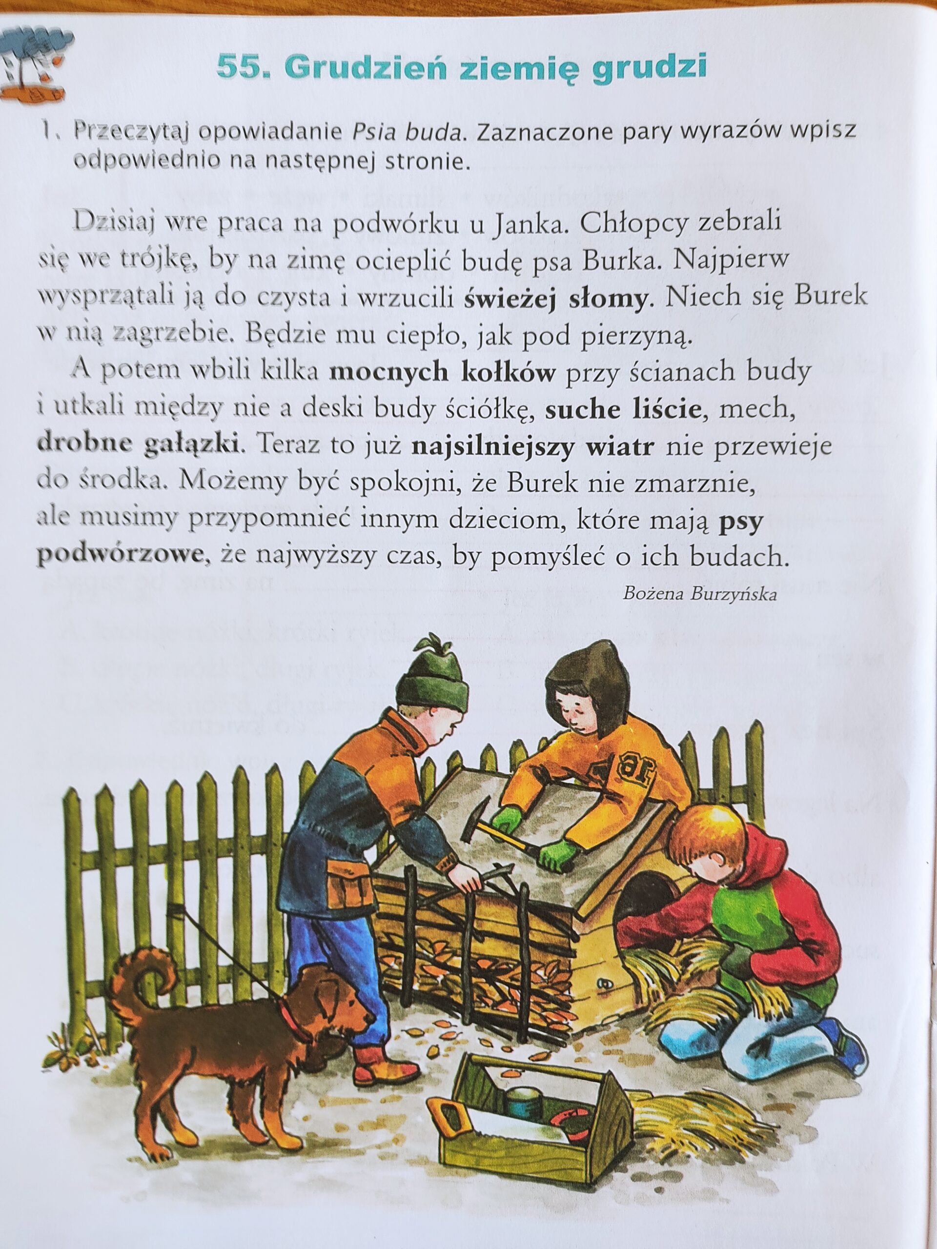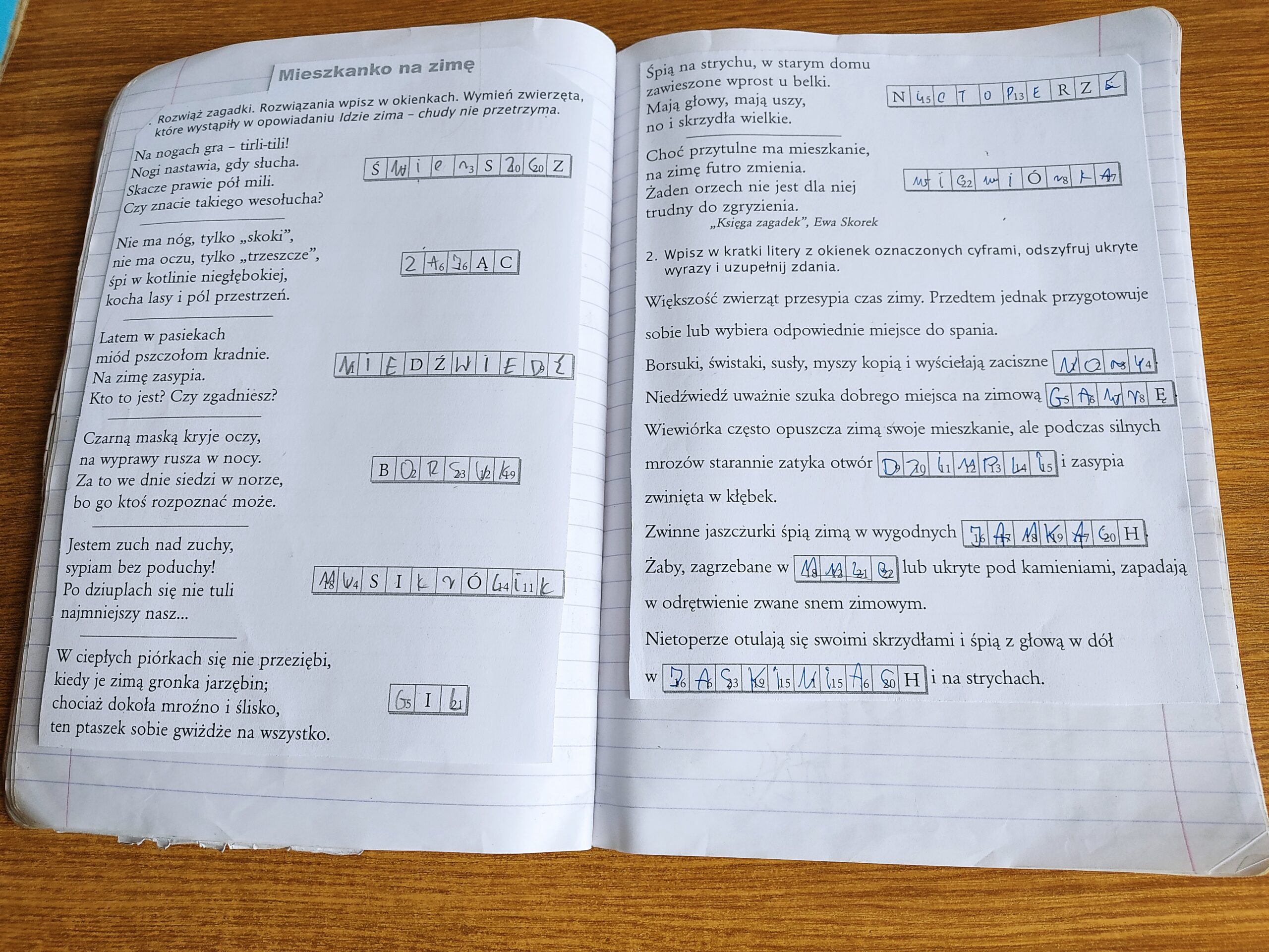 Podsumowaniu wiadomości służył tekst z luką, w którym w miejsce kratek należało wpisać odpowiedni wyraz. Dowiedzieliśmy się, że borsuki, świstaki, susły, myszy kopią i wyściełają zaciszne jamy. Niedźwiedź uważnie szuka dobrego miejsca na zimową gawrę. Wiewiórka często opuszcza zimą swoje mieszkanie, ale podczas silnych mrozów starannie zatyka otwór dziupli i zasypia zwinięta w kłębek. Zwinne jaszczurki śpią zimą w wygodnych jamkach. Żaby, zagrzebane w mule lub ukryte pod kamieniami, zapadają w odrętwienie zwane snem zimowym. Nietoperze otulają się swoimi skrzydłami i śpią głową w dół w jaskiniach i na strychach.