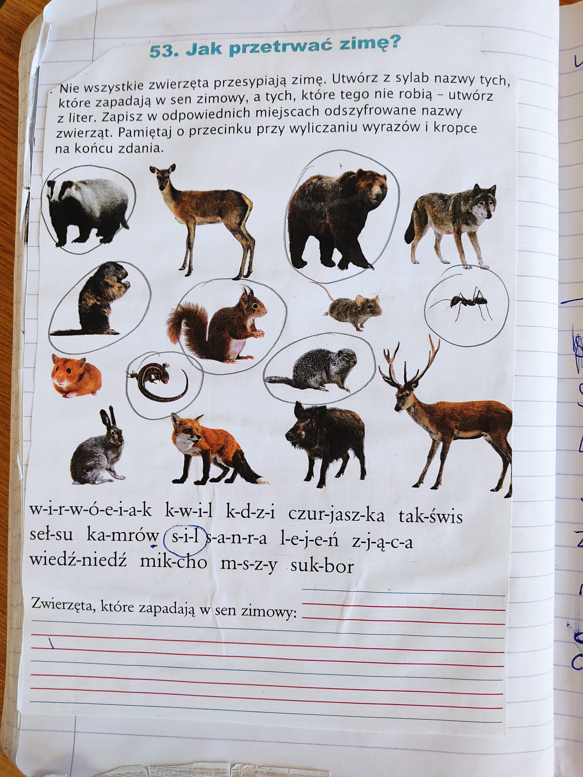 Poszukując odpowiedzi na pytanie: Jak przetrwać zimę?- szóstoklasiści ustalali, które zwierzęta zasypiają na zimę, a którym trzeba pomóc. Służyła temu karta pracy przedstawiająca ilustracje zwierząt oraz rozsypanka literowa z ich nazwami. Kolejnym zadaniem było sformułowanie odpowiedzi na pytanie: Dlaczego zwierzęta gromadzą zapasy na zimę? Niezbędna okazała się rozsypanka wyrazowa, która rozwiała wszelkie wątpliwości. Okazało się, że zwierzęta gromadzą na zimę zapasy pokarmu, ponieważ wtedy jest go bardzo mało i trudno go zdobyć. Sadło chroni zwierzęta przed mrozem i jest „spiżarnią” w czasie zimowego snu.