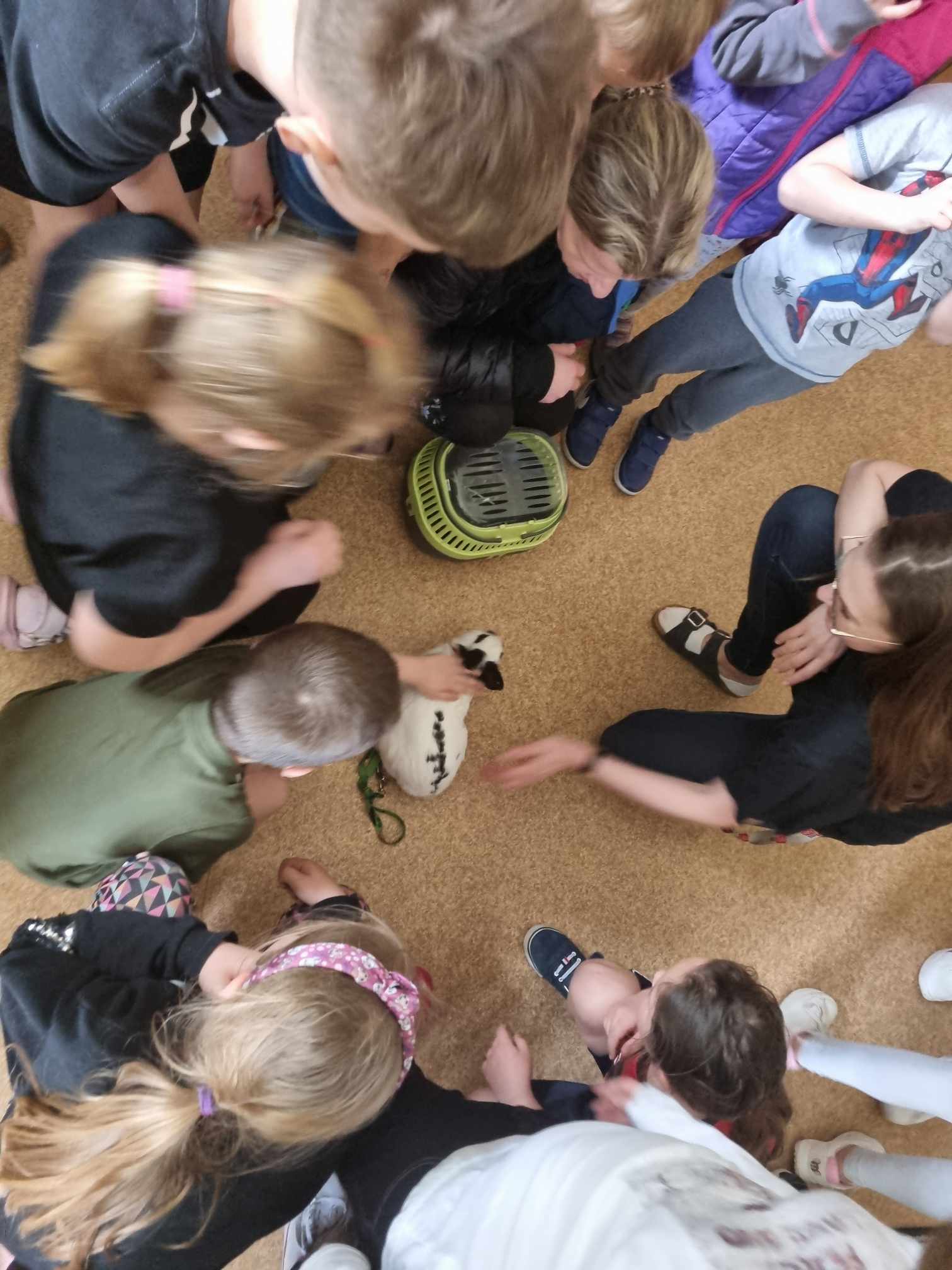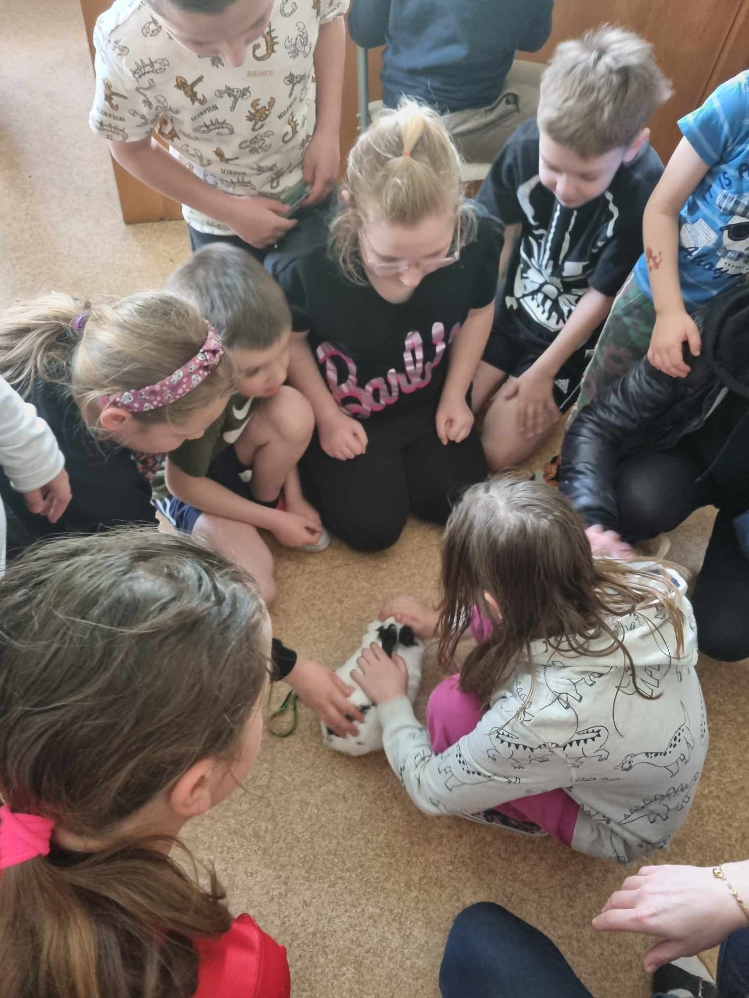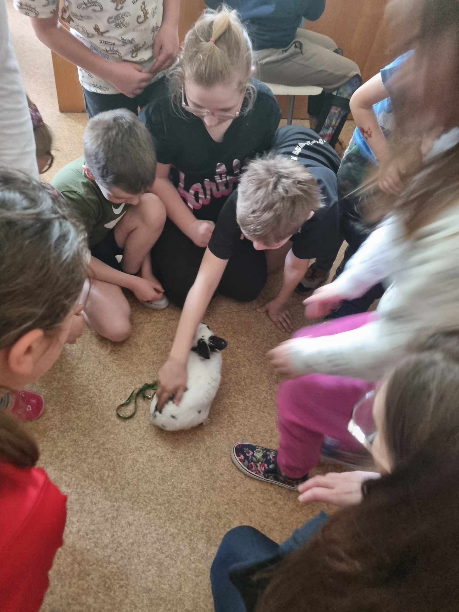 Wczoraj odwiedził świetlicę szkolną niespotykany gość- królik Bobuś i także skradł nasze serca. Ten puchaty pupil należy do uczennicy Zuzi. Jego wizyta, choć już po Świętach, przyniosła wszystkim wiele radości.  Dzieciom bardzo spodobały się te odwiedziny. Gościa otoczyły radosnym kręgiem, właścicielom zadawały mnóstwo pytań i mogły go pogłaskać. Zaskoczone dzieci dziękują za miłą niespodziankę.