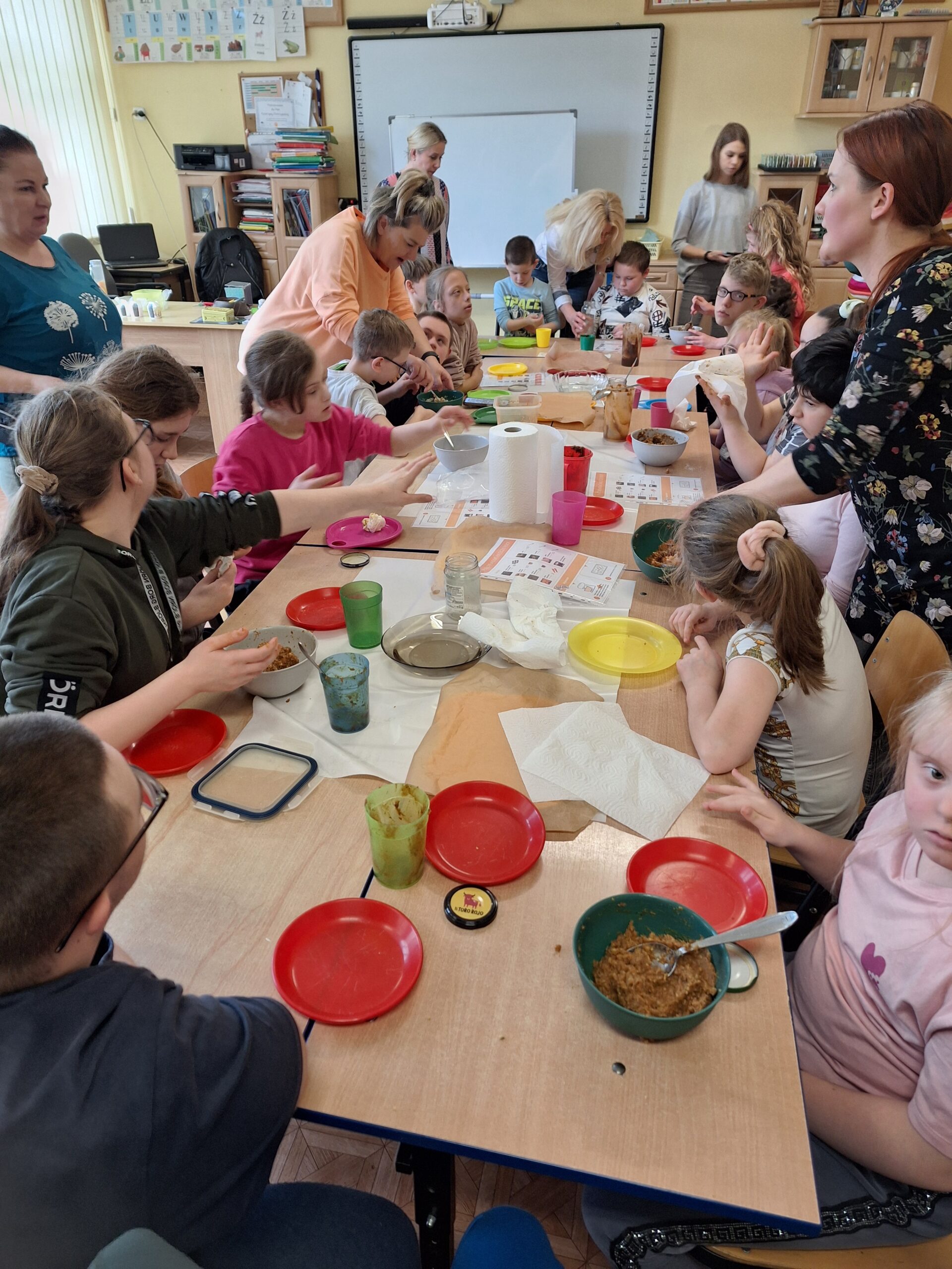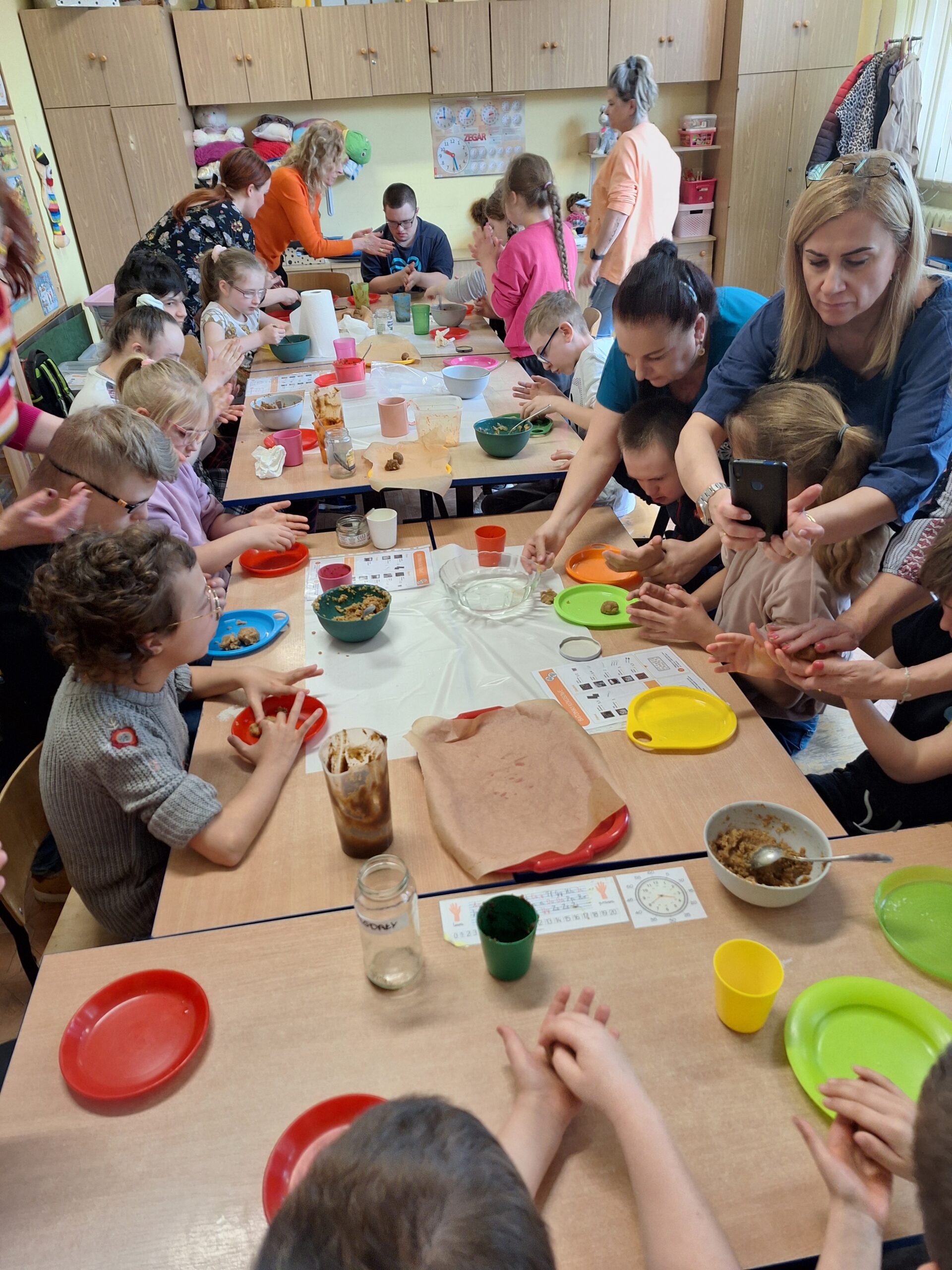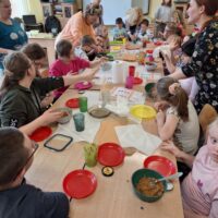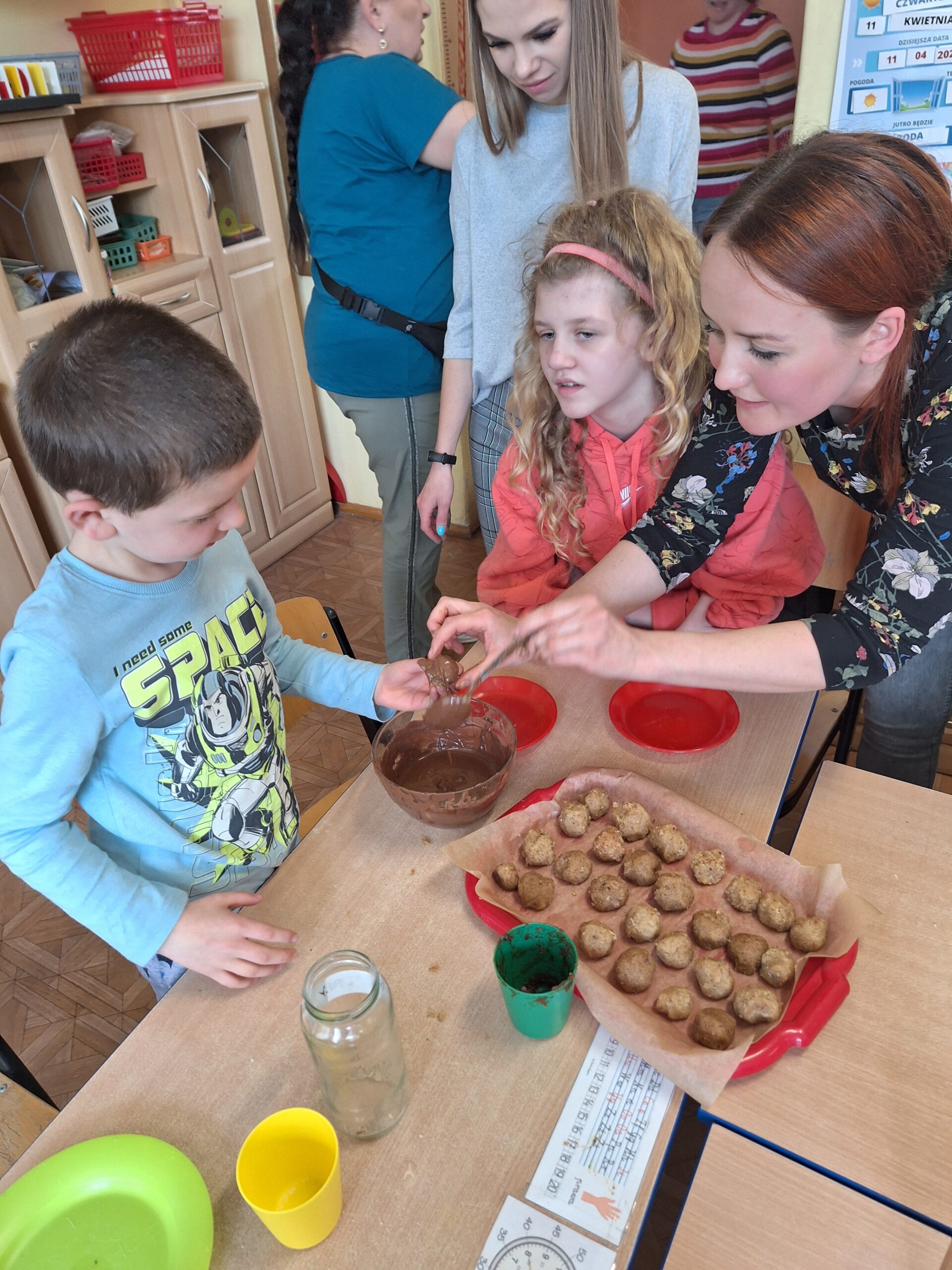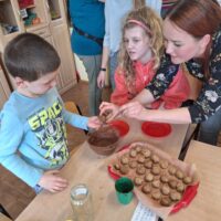 Słodko i wesoło, pysznie i radośnie, a przede wszystkim zdrowo się działo w zespołach pracujących w ramach programu ” Każdy inny – wszyscy równi”. Dnia 12 kwietnia, z inicjatywy pań studentek Pedagogiki Opiekuńczo- Wychowawczej ANS, odbyły się zajęcia Ciastoterapii, czyli wielozmysłowe doświadczenia kulinarne. Podczas zajęć dzieci poznawały jednostki miary, doskonaliły umiejętności motoryki małej, ale przede wszystkim miały możliwość doświadczania nowych smaków i zapachów. Dziełem kulinarnym były słodziutkie kulki mocy, które w swoim składzie nie zawierały cukru, pomijając bohatera dnia – CZEKOLADY.