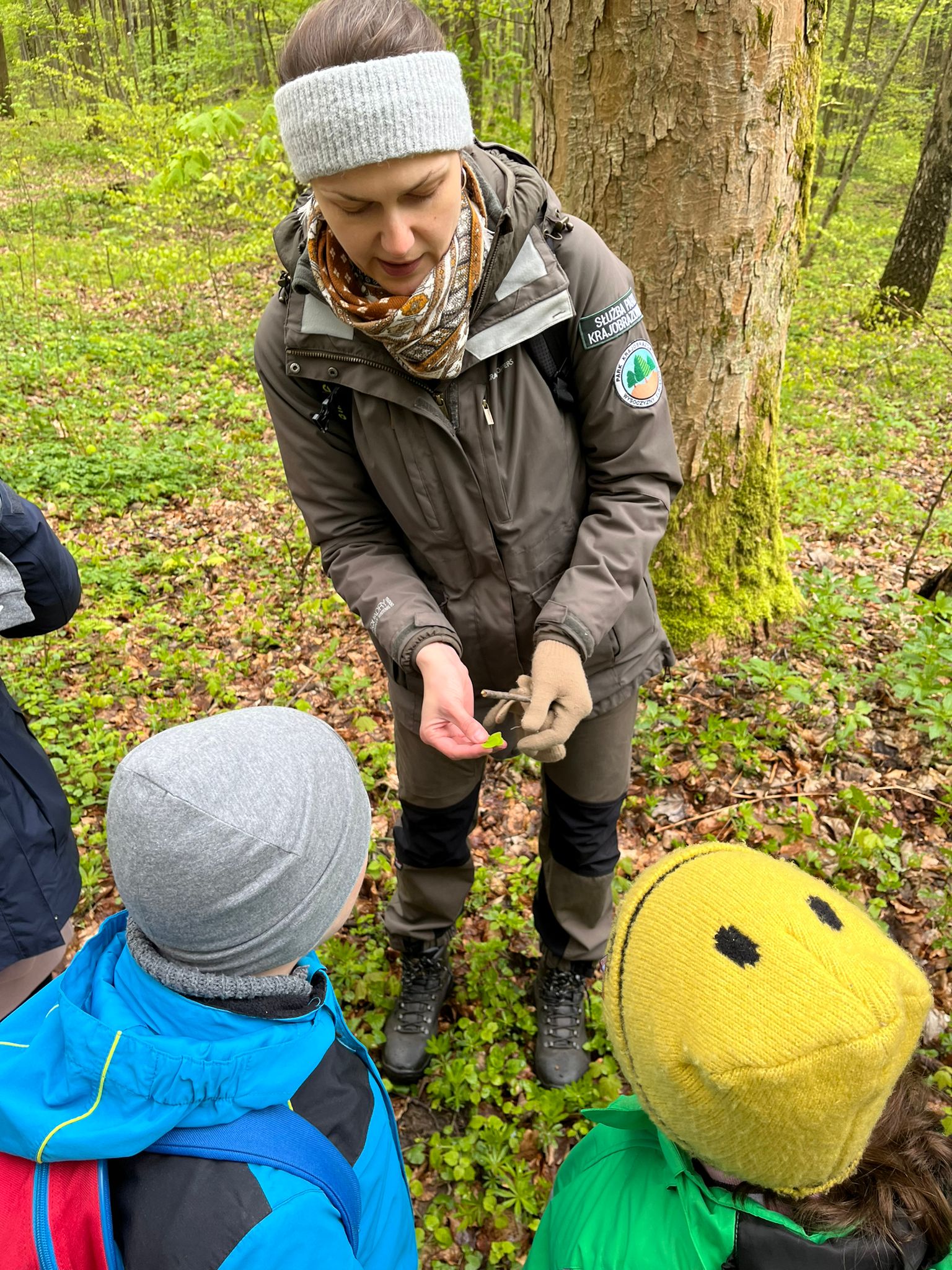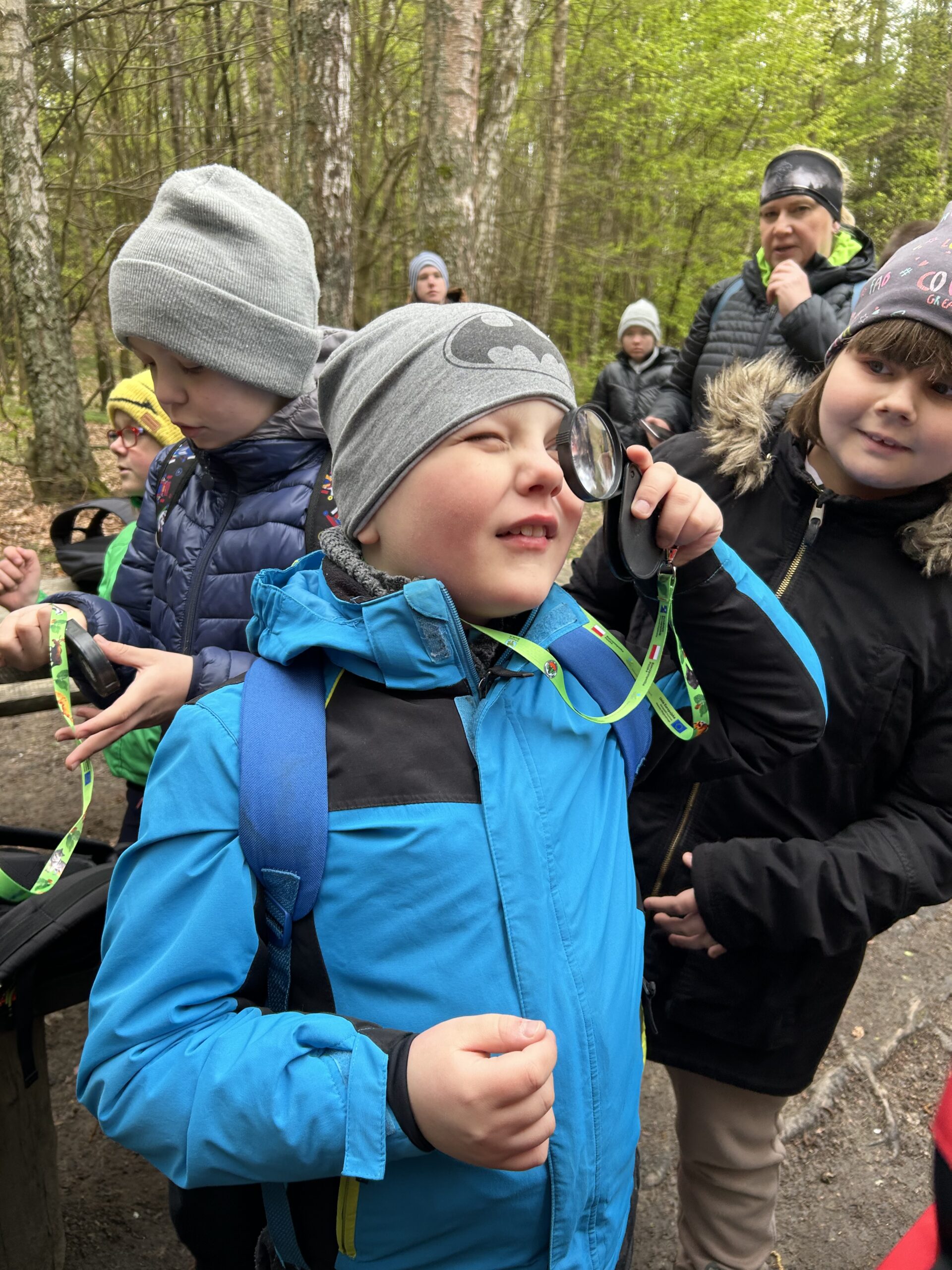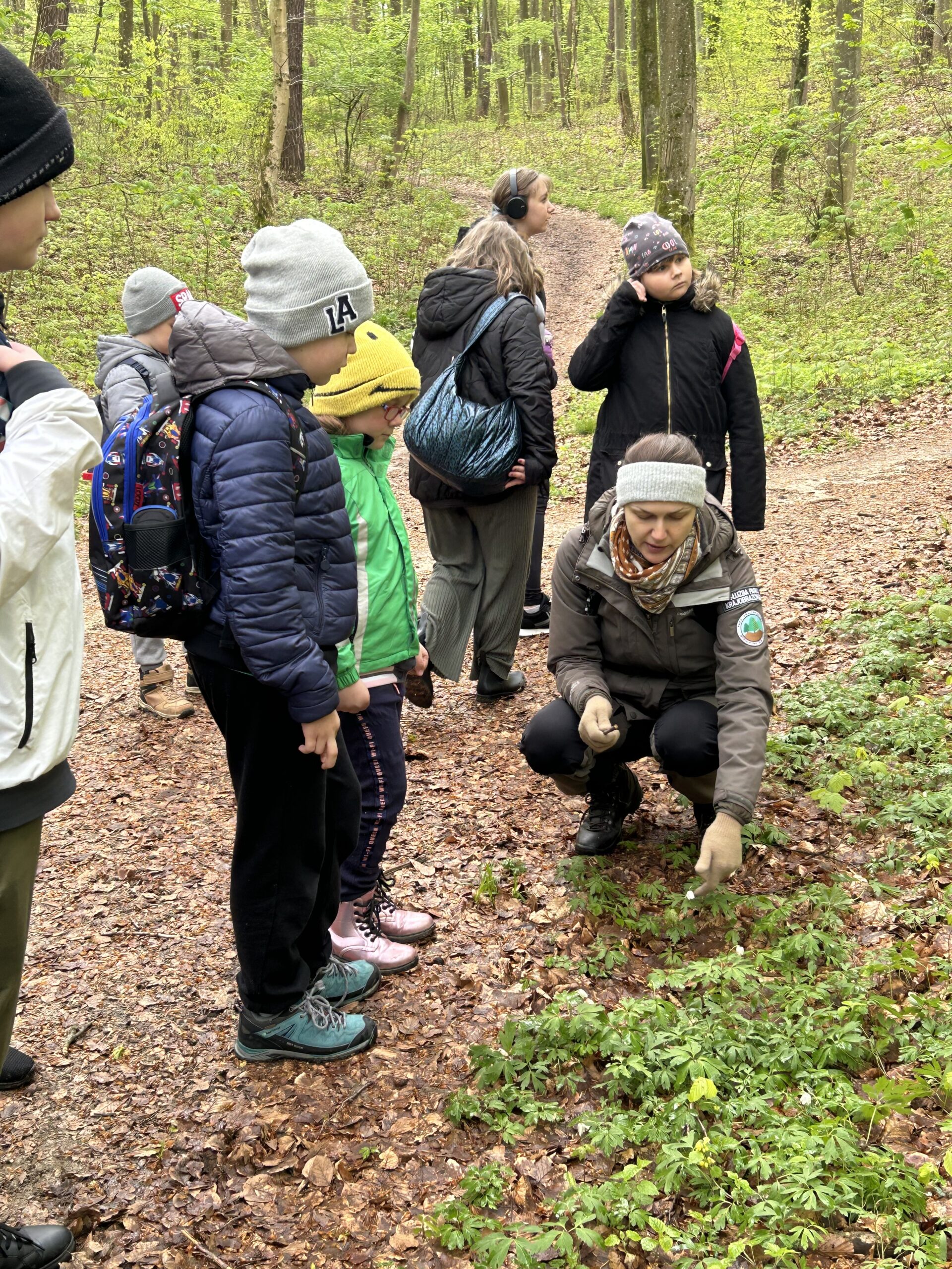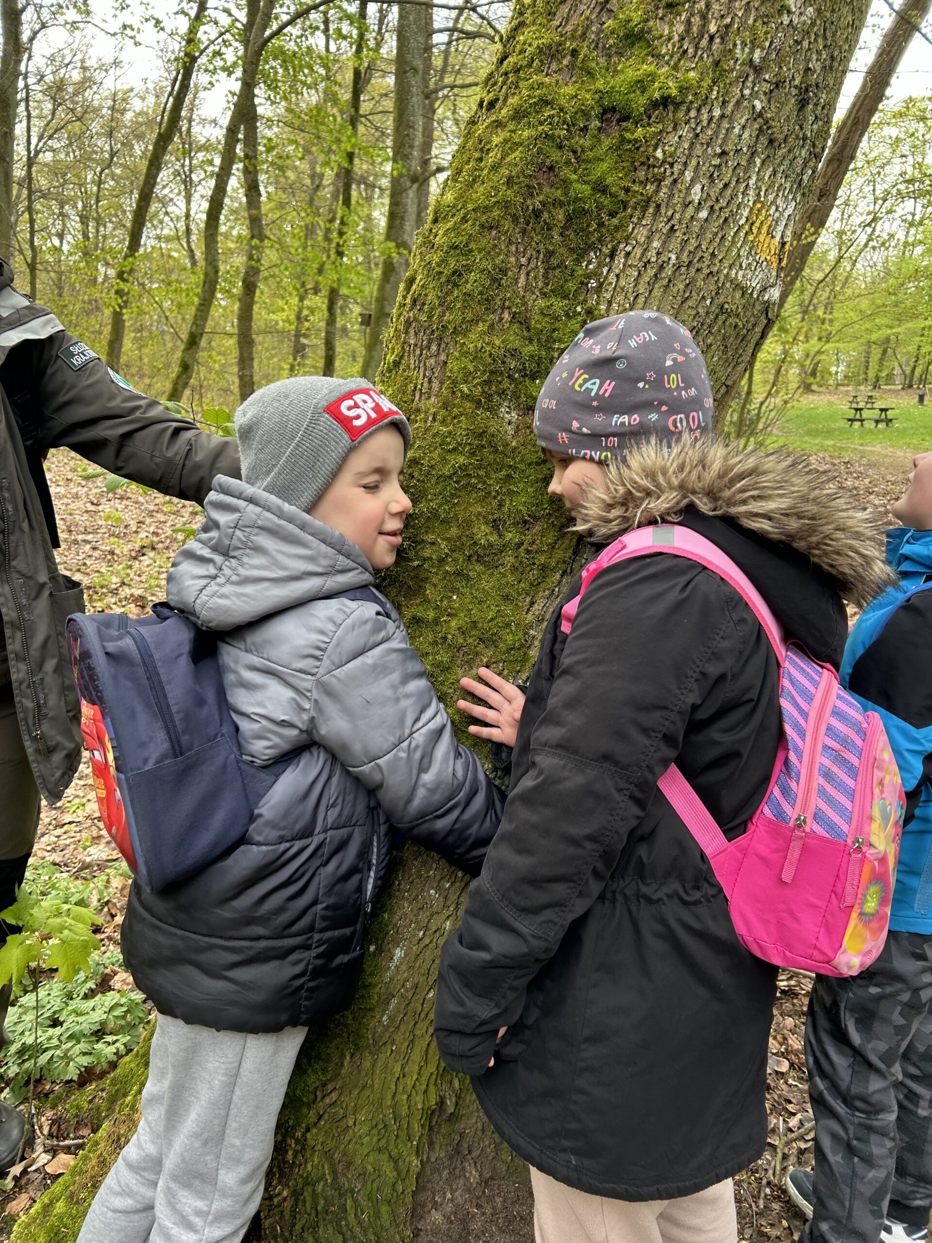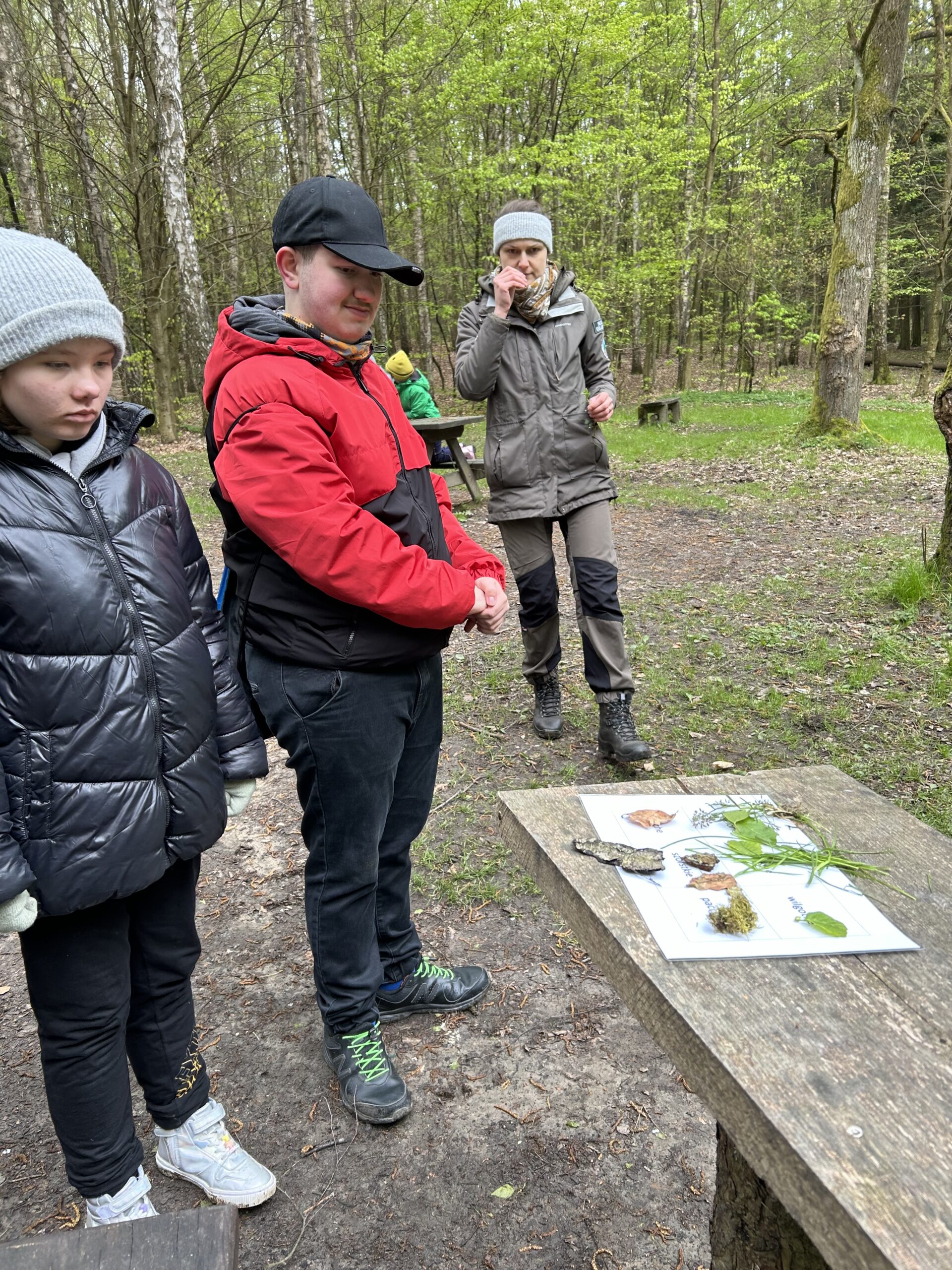 Pani Marta, znawczyni terenu i pasjonatka ochrony przyrody, poprowadziła uczniów przez gąszcz lasu, zwracając uwagę na jego różnorodność. Podczas tej niezwykłej wędrówki, uczniowie mieli okazję doświadczyć lasu we wszystkich możliwych wymiarach, korzystając ze swoich zmysłów. Słuchając śpiewu ptaków, dotykając korzeni drzew, prowadząc uważne obserwacje – każde zmysłowe doświadczenie wprowadzało ich coraz głębiej w świat otaczającej przyrody.