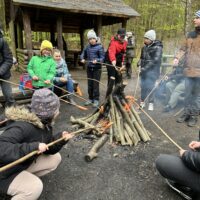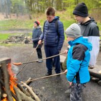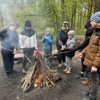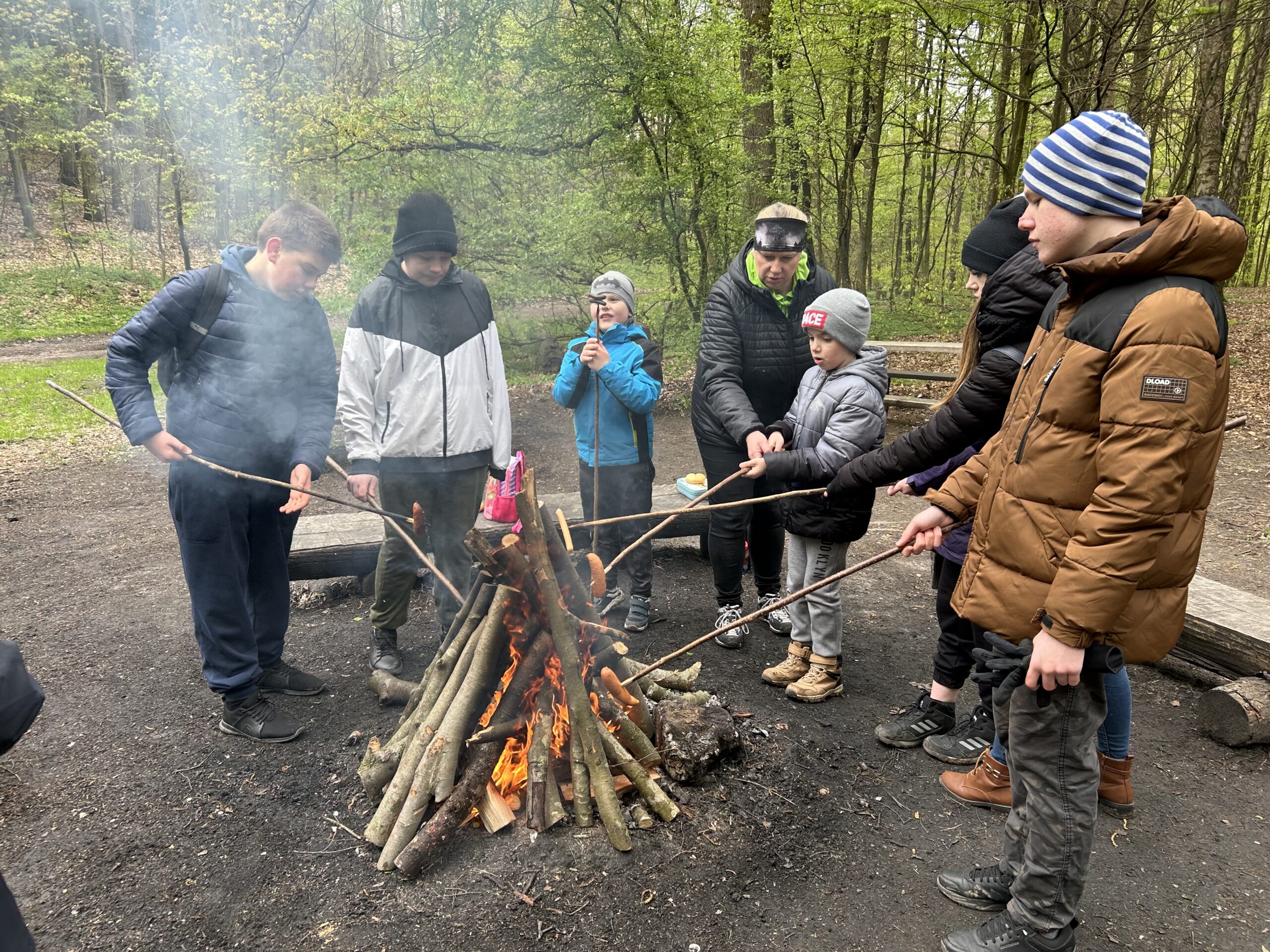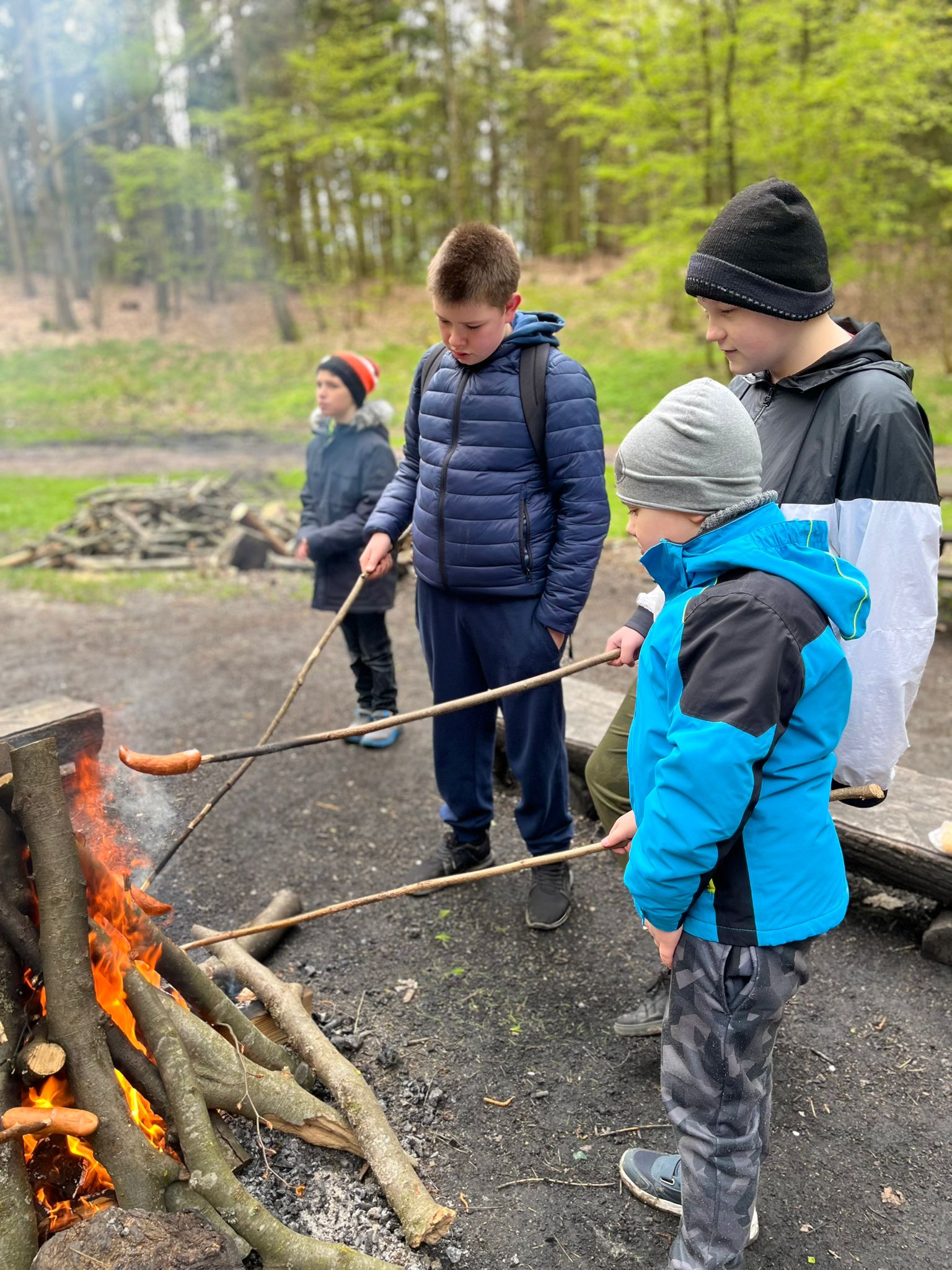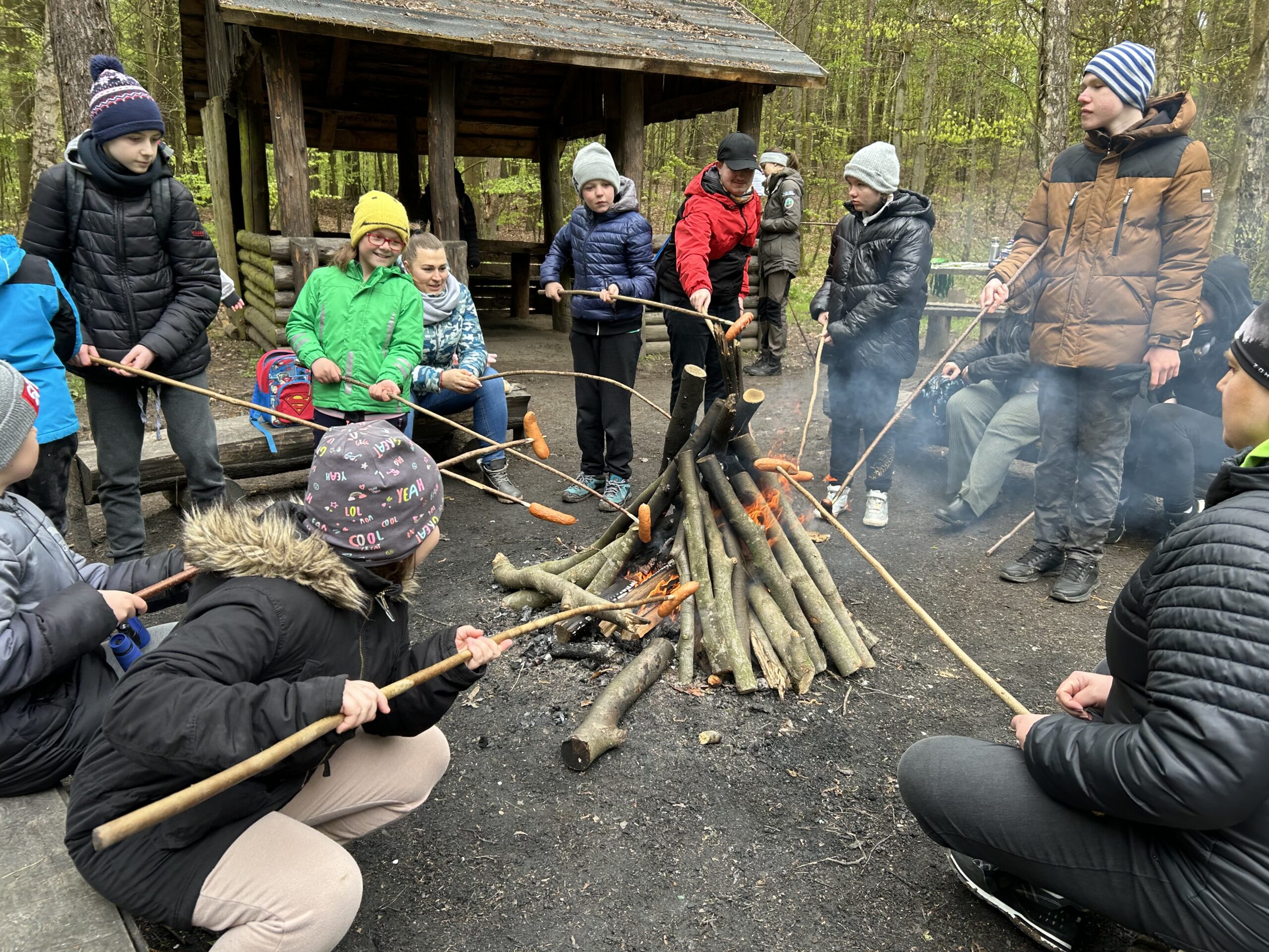 Po zakończeniu leśnej eksploracji, uczniowie zebrali się w wiacie Wiktorówka, gdzie czekało na nich przygotowane ognisko. To był moment na wykorzystanie zmysłu smaku, gdyż uczestnicy mogli cieszyć się smakiem soczystych kiełbasek pieczonych nad ogniskiem, delektując się chwilą spędzoną wśród przyjaciół i natury.