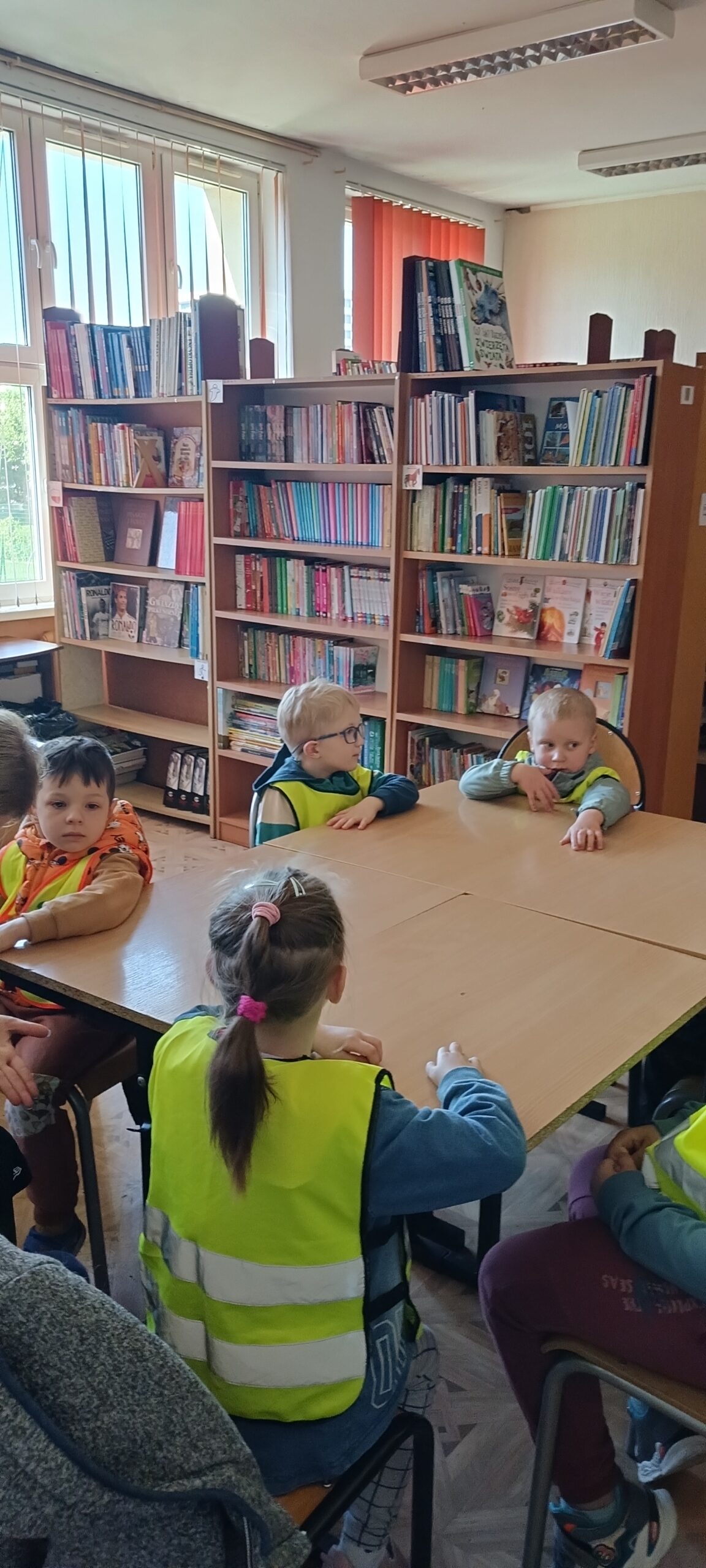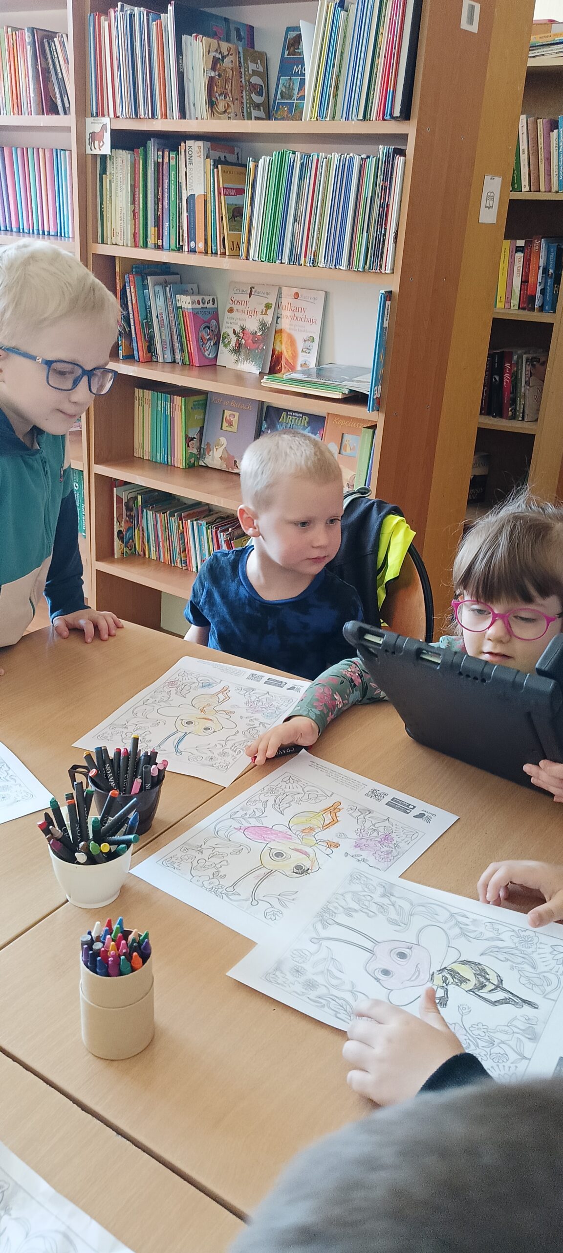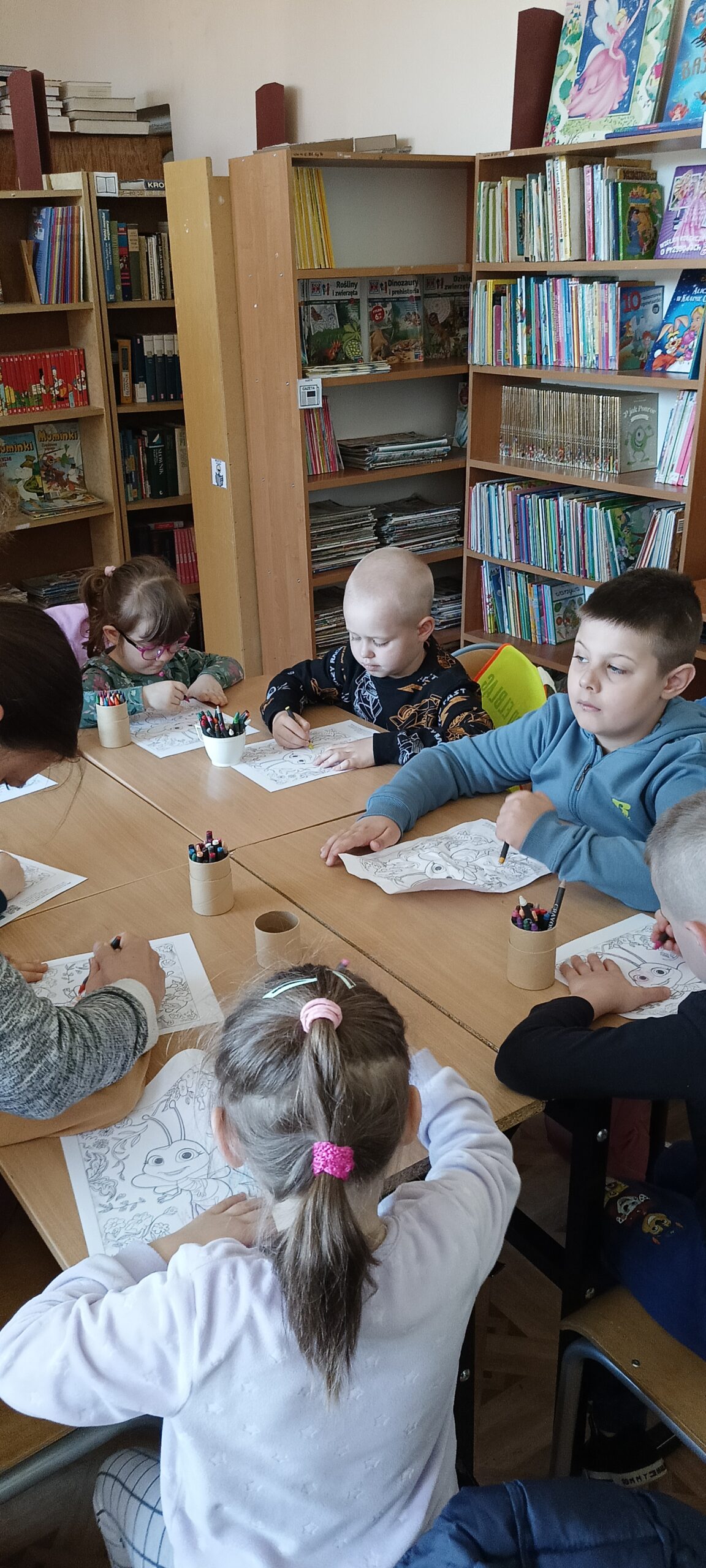 Przedszkolaki z grupy Waleczne pszczółki odwiedziły we wtorek bibliotekę szkolną. Podczas spotkania Pani Magda pokazała książki, opowiedziała jak należy o nie dbać, po co służą zakładki do książek. Przedszkolaki wysłuchały opowiadania „Urodziny pszczółki” oraz wykonały ilustracje oraz zatańczyły taniec pszczółki.