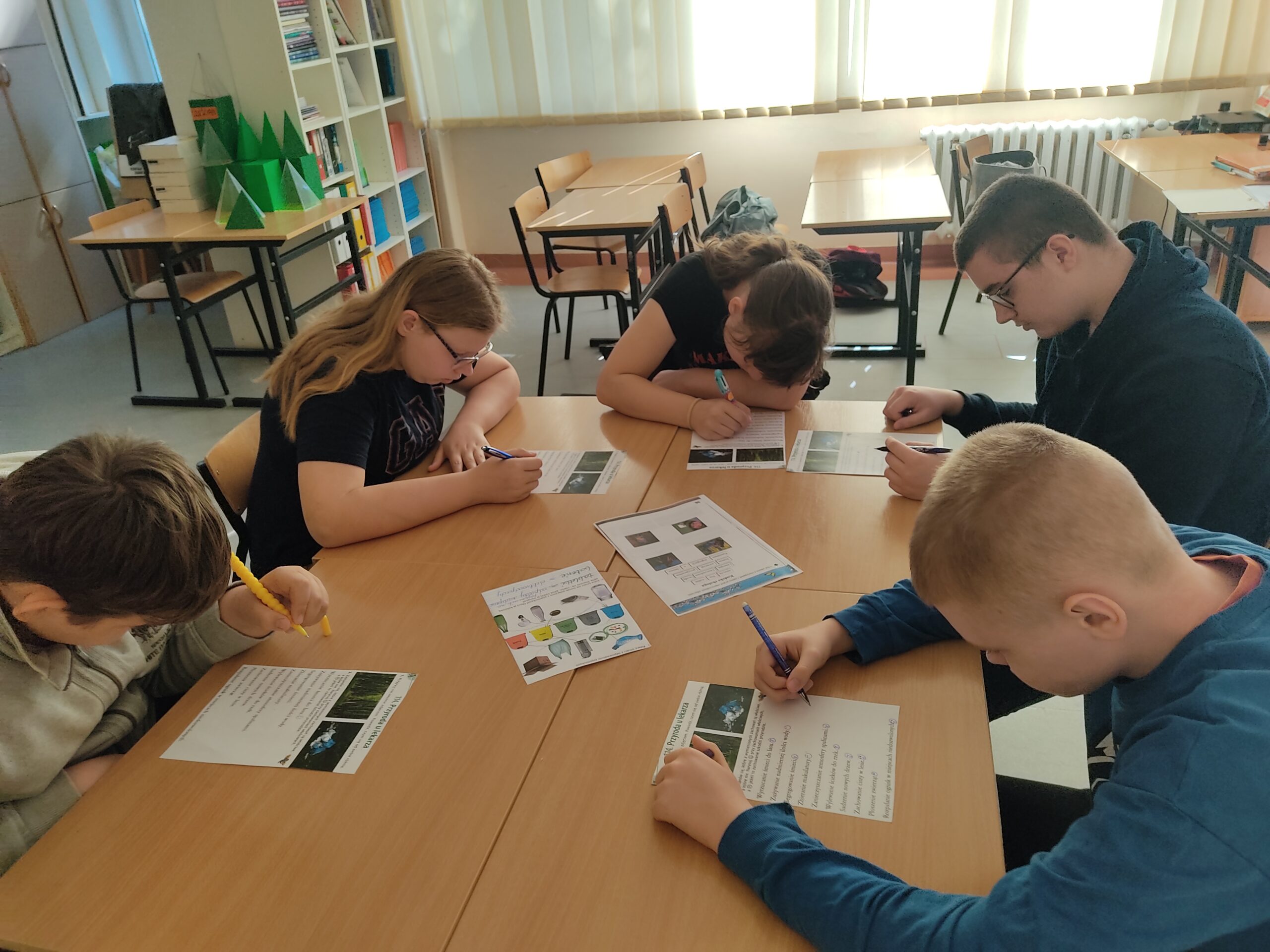 Zwieńczeniem zajęć było wysłuchanie piosenki „Zostań przyjacielem Ziemi” oraz odszukanie w diagramie literowym wyrazów, które mówią, o co powinniśmy dbać, co należy chronić i co oszczędzać na naszej planecie. Uczniowie w mig odczytali słowa- klucze: lasy, przyrodę, morza, ptaki, zwierzęta, rośliny, wodę, łąki, których wartość w ekosystemie i biocenozie jest niewątpliwa.