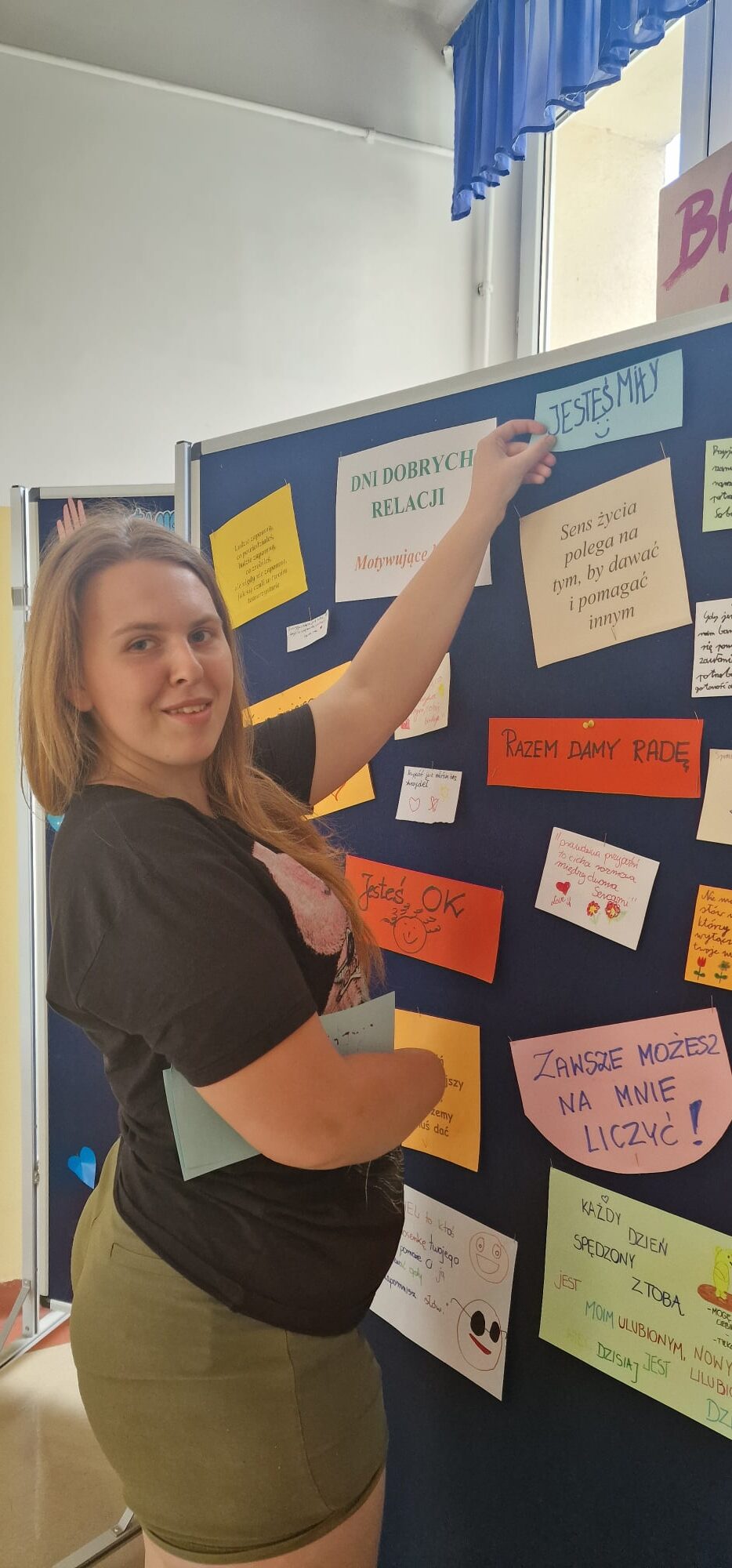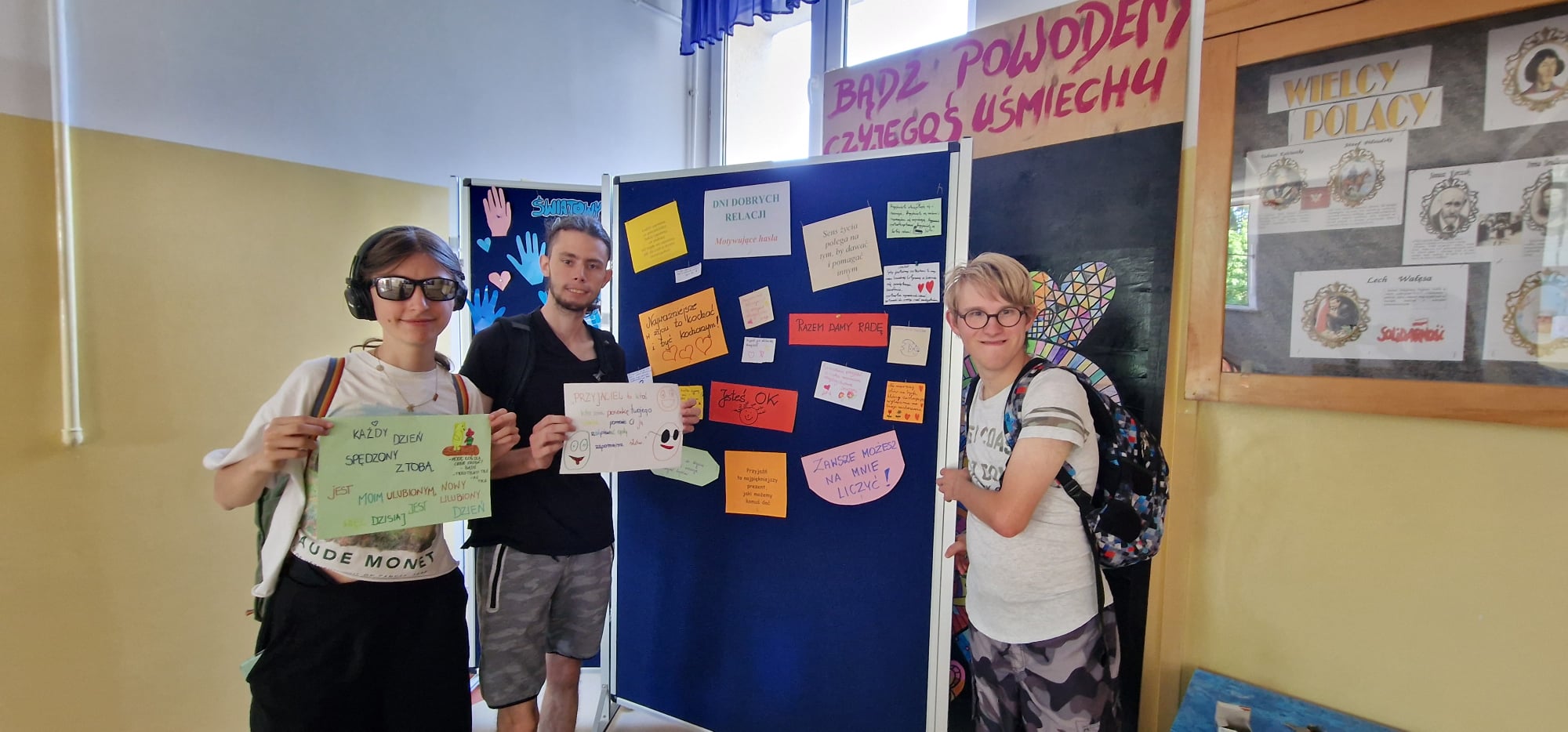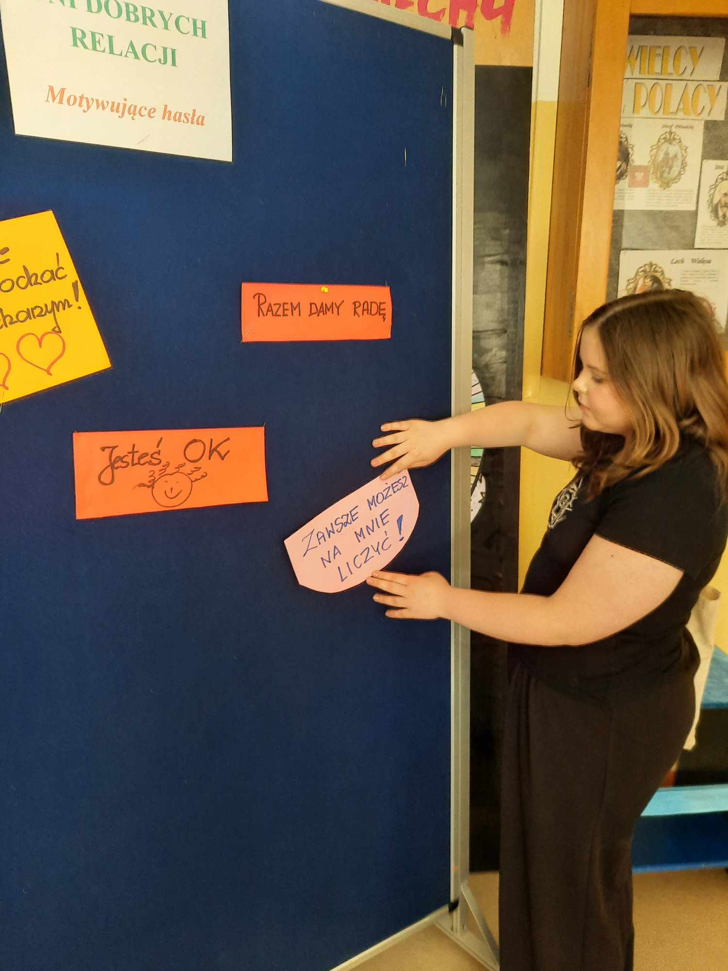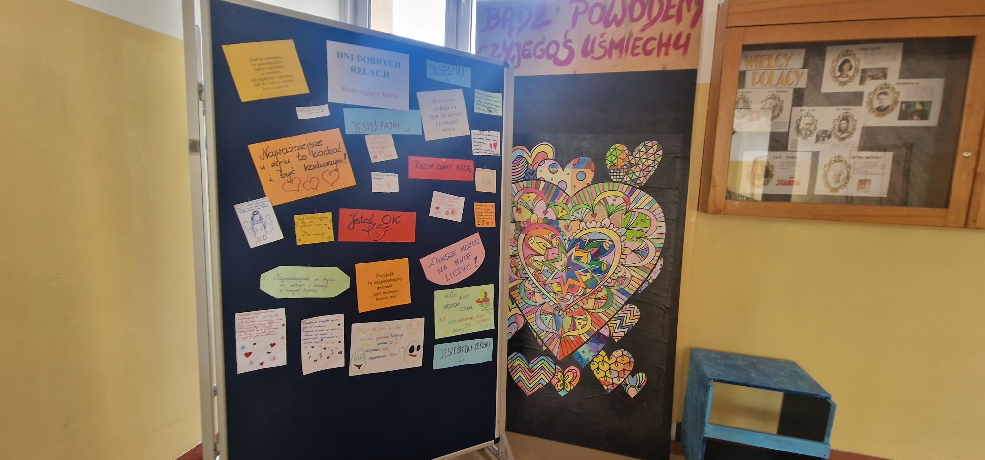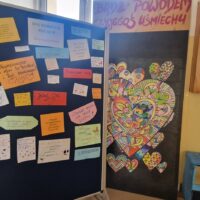 Na pierwszym piętrze ustawiona była tablica, na której każdy mógł zawiesić miłe, motywujące hasła dla innych. Ta inicjatywa okazała się wspaniałą okazją do dzielenia się dobrymi myślami i pozytywnymi życzeniami, co stworzyło atmosferę wzajemnego wsparcia i życzliwości.