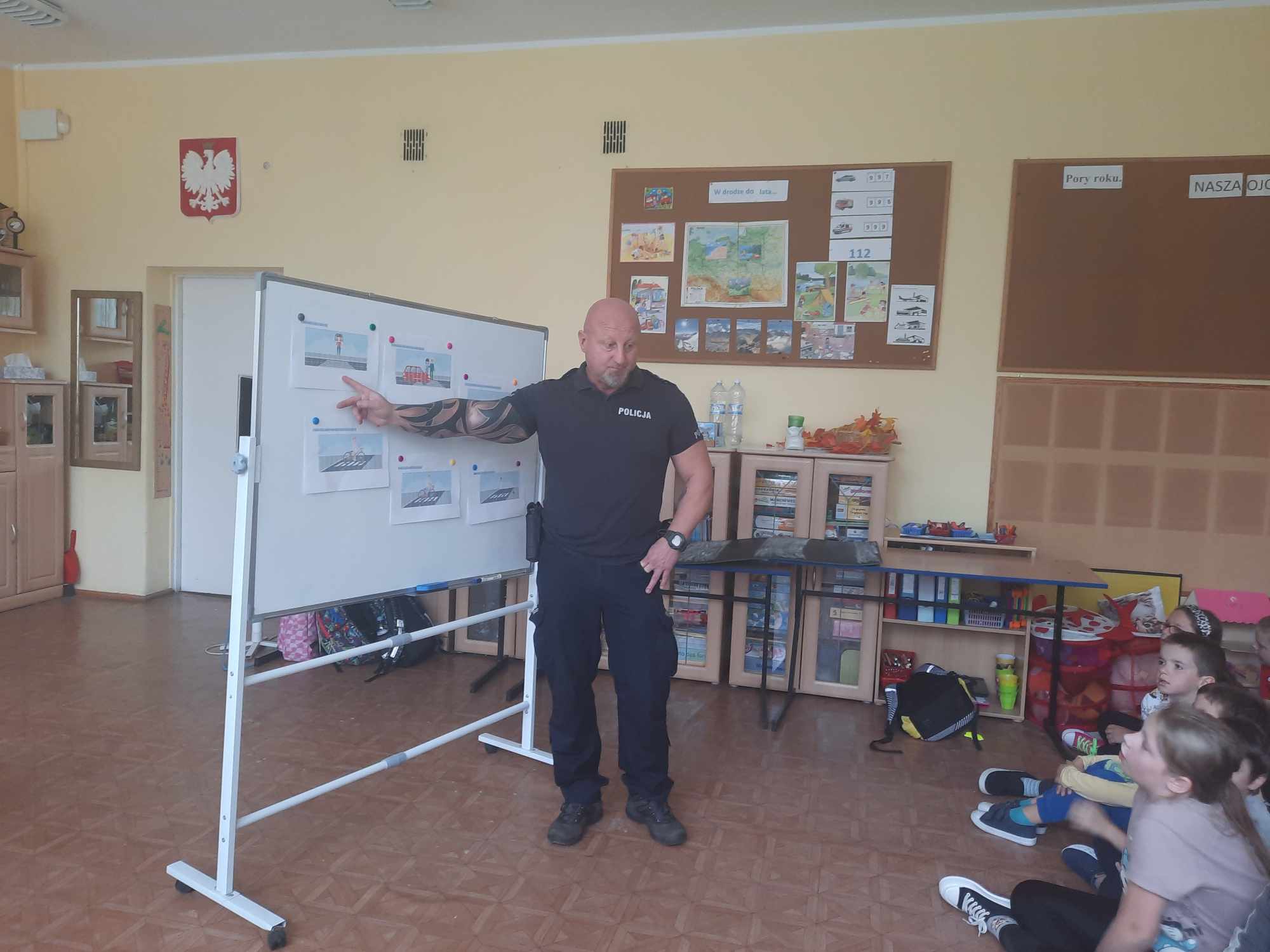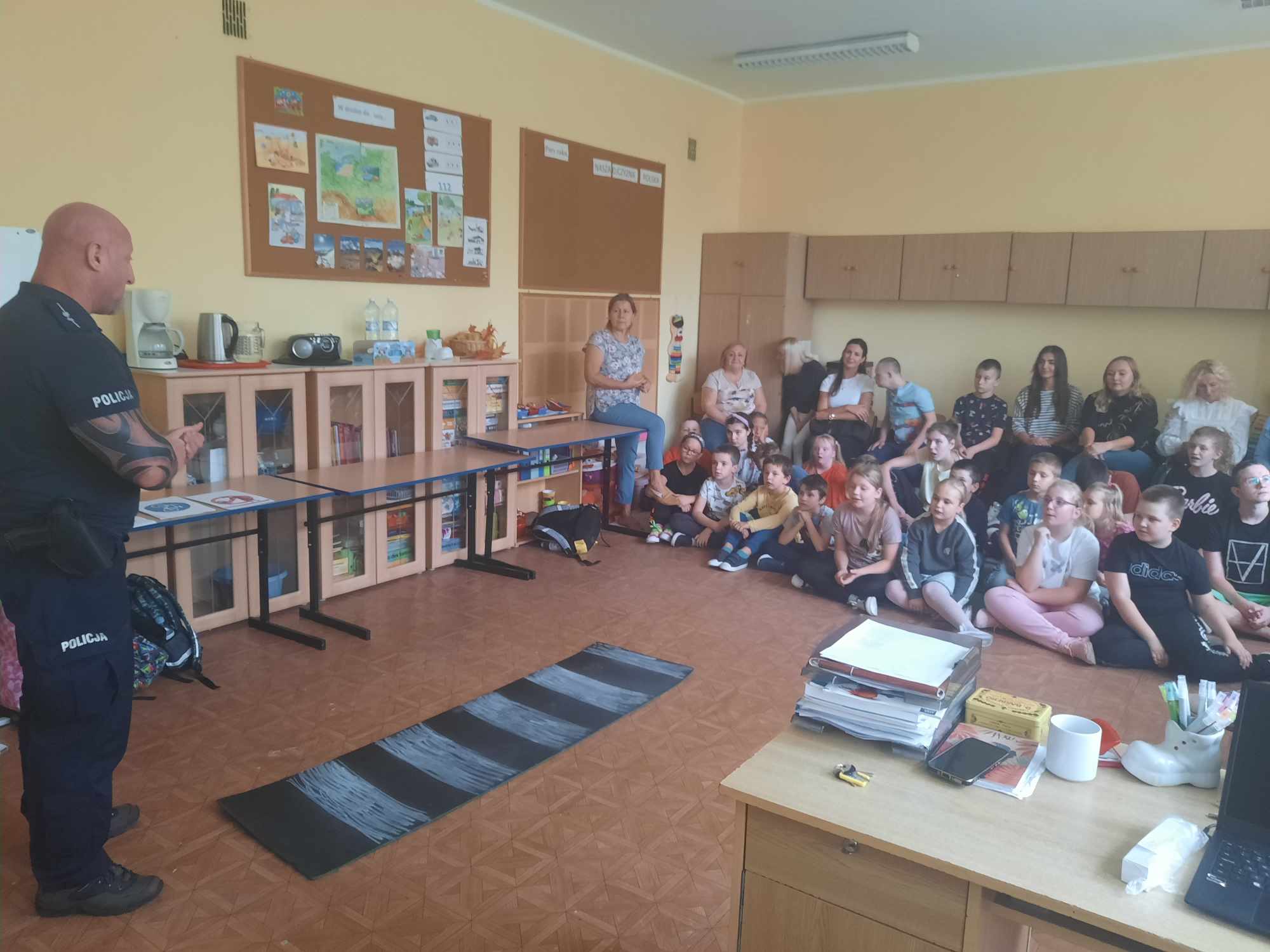 Dzisiaj w naszej szkole odbyło się spotkanie z policjantem na temat bezpiecznej drogi do i ze szkoły. Dzielnicowy asp. Krzysztof Jakubczyk przypomniał wszystkim zasady bezpieczeństwa na drodze. Omówił zasady poruszania się po ulicy, chodniku, podczas jazdy rowerem i samochodem. Przy aktywnym udziale uczniów przypomniał podstawowe znaki drogowe oraz omówił bezpieczne i nieprawidłowe sytuacje, jakie mogą zdarzyć się w ruchu drogowym z udziałem pieszych. Pierwszoklasiści w praktyczny sposób uczyli się bezpiecznego przejścia przez jezdnię po pasach z sygnalizatorem i bez. Na zakończenie Pan policjant omówił bezpieczeństwo w kontaktach z nieznajomymi.