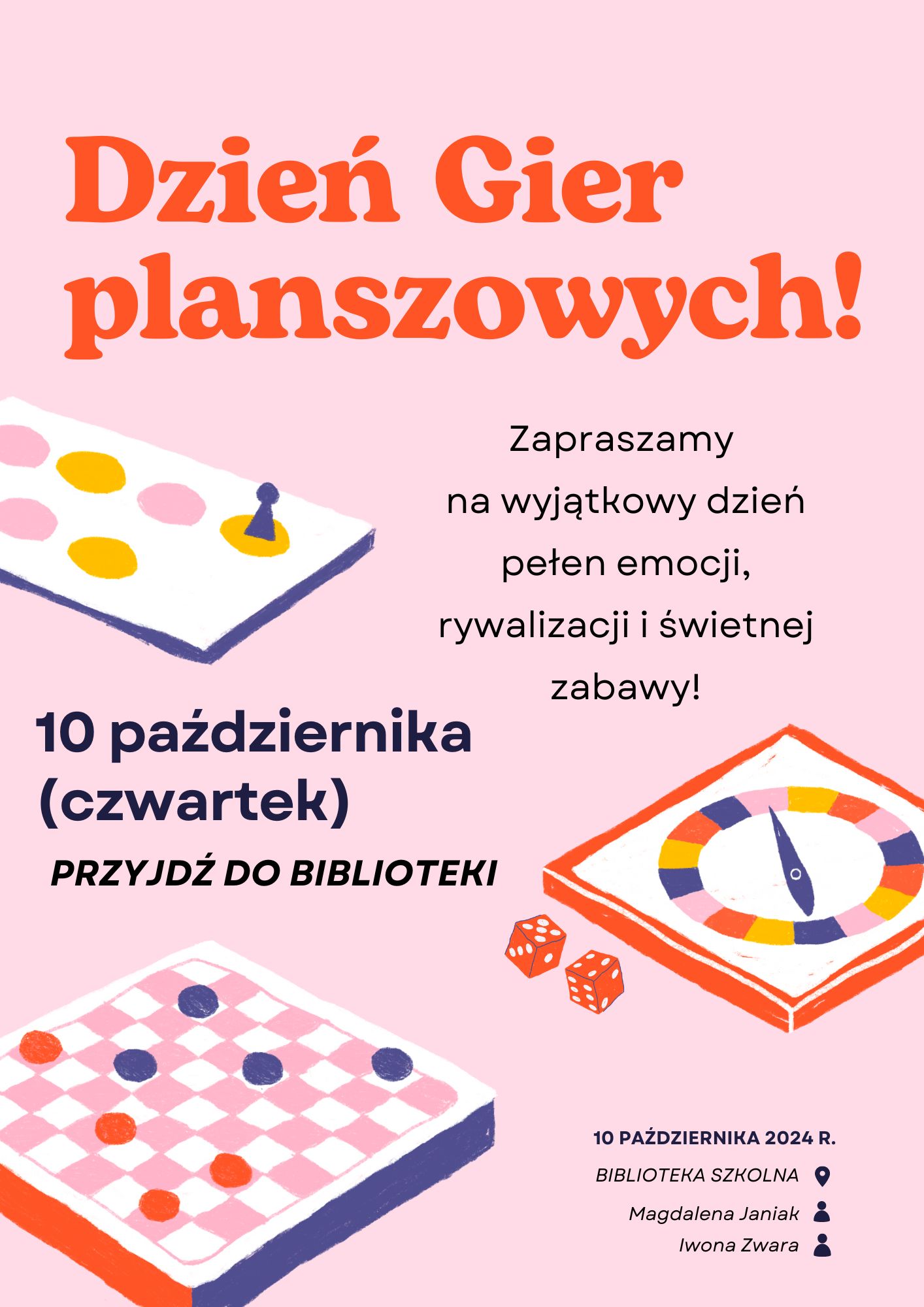 Serdecznie zapraszamy wszystkich uczniów na wyjątkowe wydarzenie – Dzień Gier Planszowych, który odbędzie się w naszej bibliotece szkolnej już w czwartek -10 października – w godzinach od 8.00 do 13.00. To fantastyczna okazja, aby w przyjaznej atmosferze wspólnie spędzić czas, rozwijając przy tym swoje umiejętności, a przede wszystkim – dobrze się bawić!