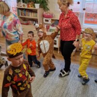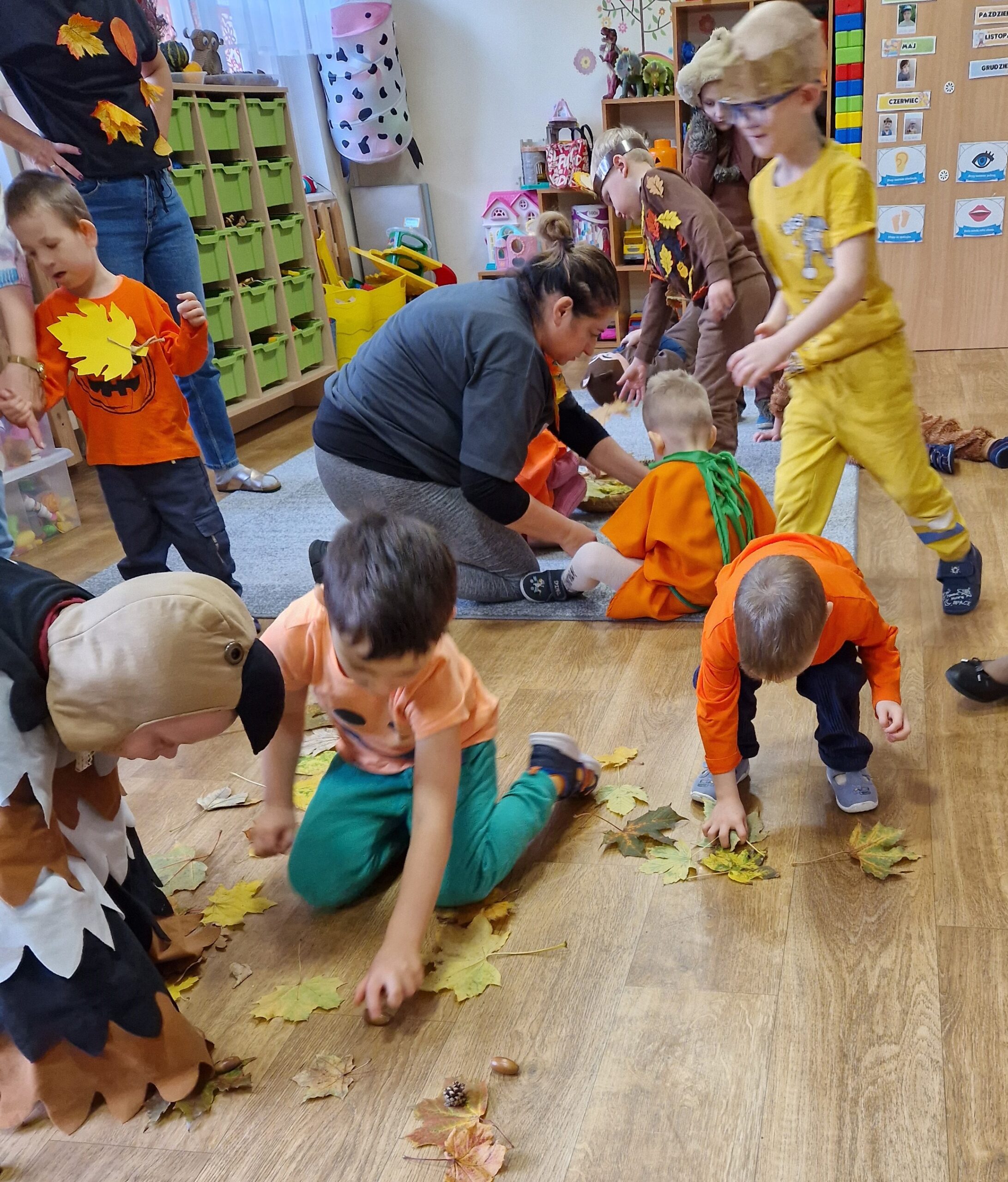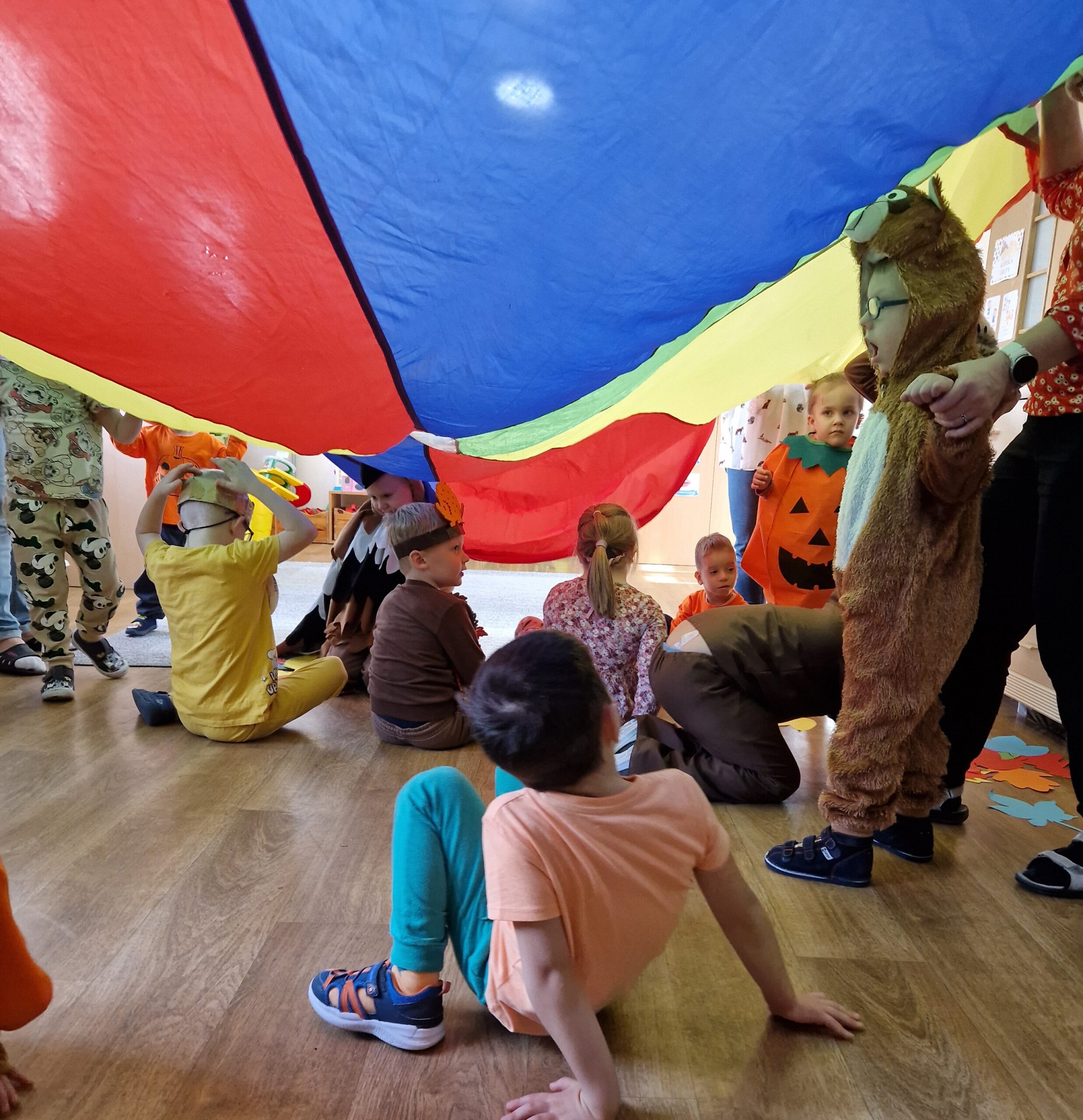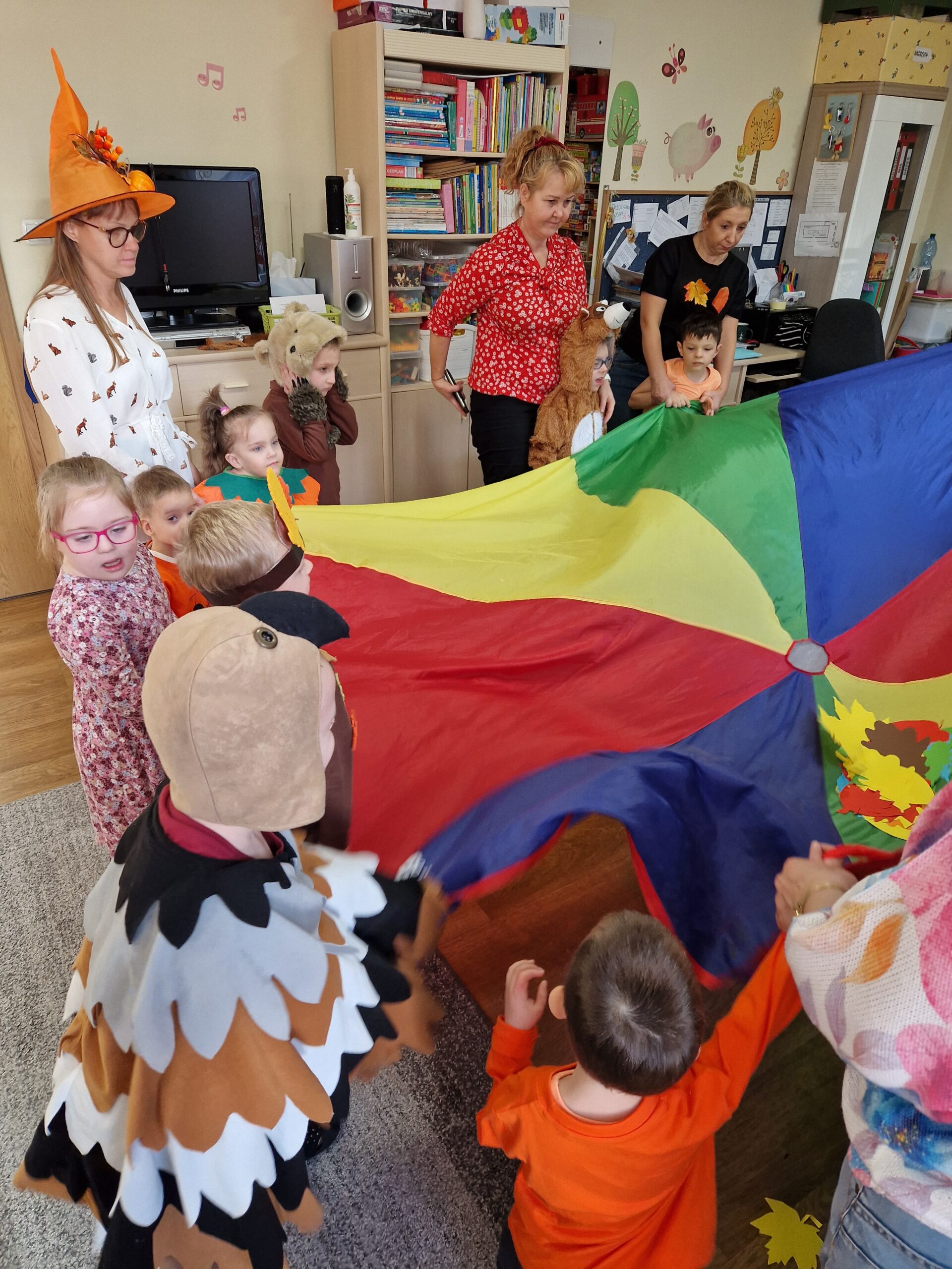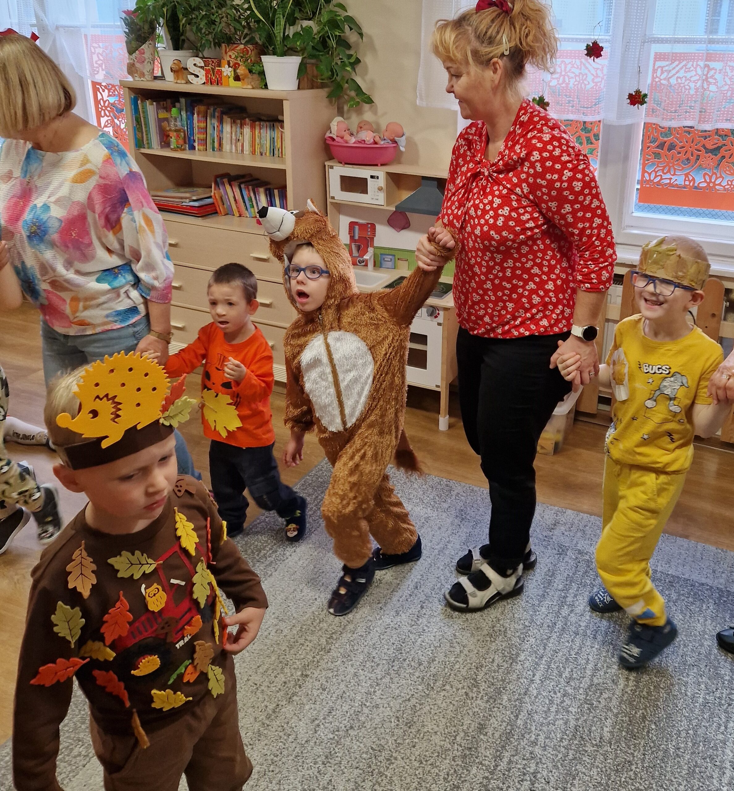 15 października 2024 roku u naszych przedszkolaków było bardzo wesoło i radośnie. Wszystkie dzieci bawiły się podczas Balu Jesieni. Przedszkolaki chętnie tańczyły przy jesiennych piosenkach, zbierały i oglądały dary jesieni: liście, kasztany, żołędzie i szyszki. Dużo radości sprawiła dzieciom zabawa chustą animacyjną. Dzieci miały na sobie piękne jesienne stroje, za przygotowanie których dziękujemy wszystkim Rodzicom.