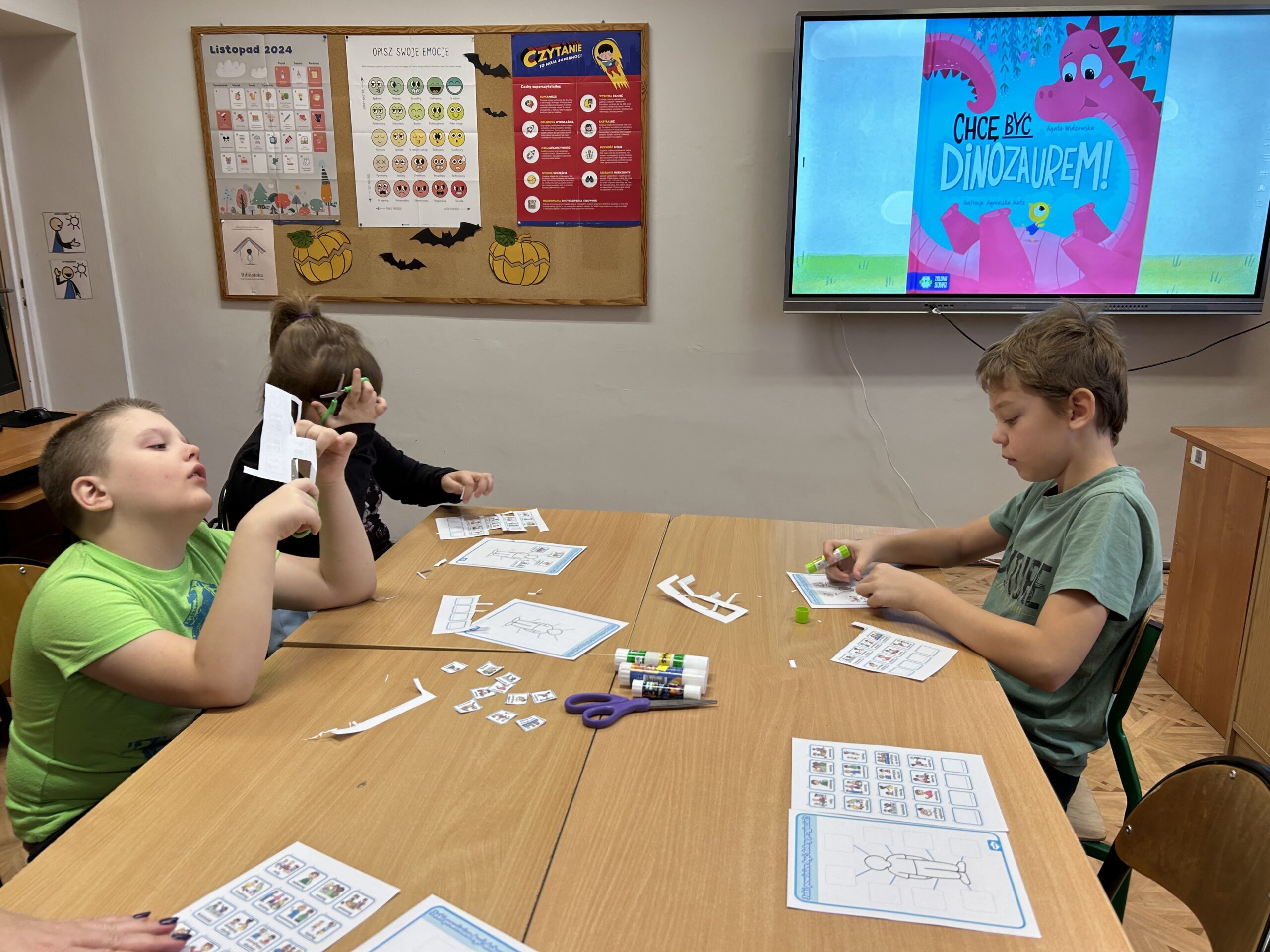 Podstawą zajęć była książka Agaty Widzowskiej pt. „Chcę być dinozaurem”, która opowiada historię niezwykłej przyjaźni dinozaura Stefana i kurczaka Czesia. Ta lektura posłużyła jako punkt wyjścia do rozmowy o tym, co czyni człowieka dobrym przyjacielem, a także była sposobem na wzbogacenie słownictwa i rozwój wyobraźni dzieci.