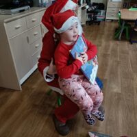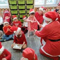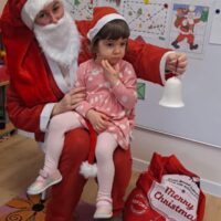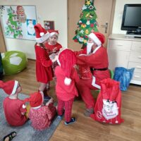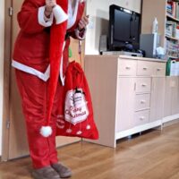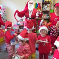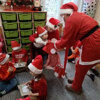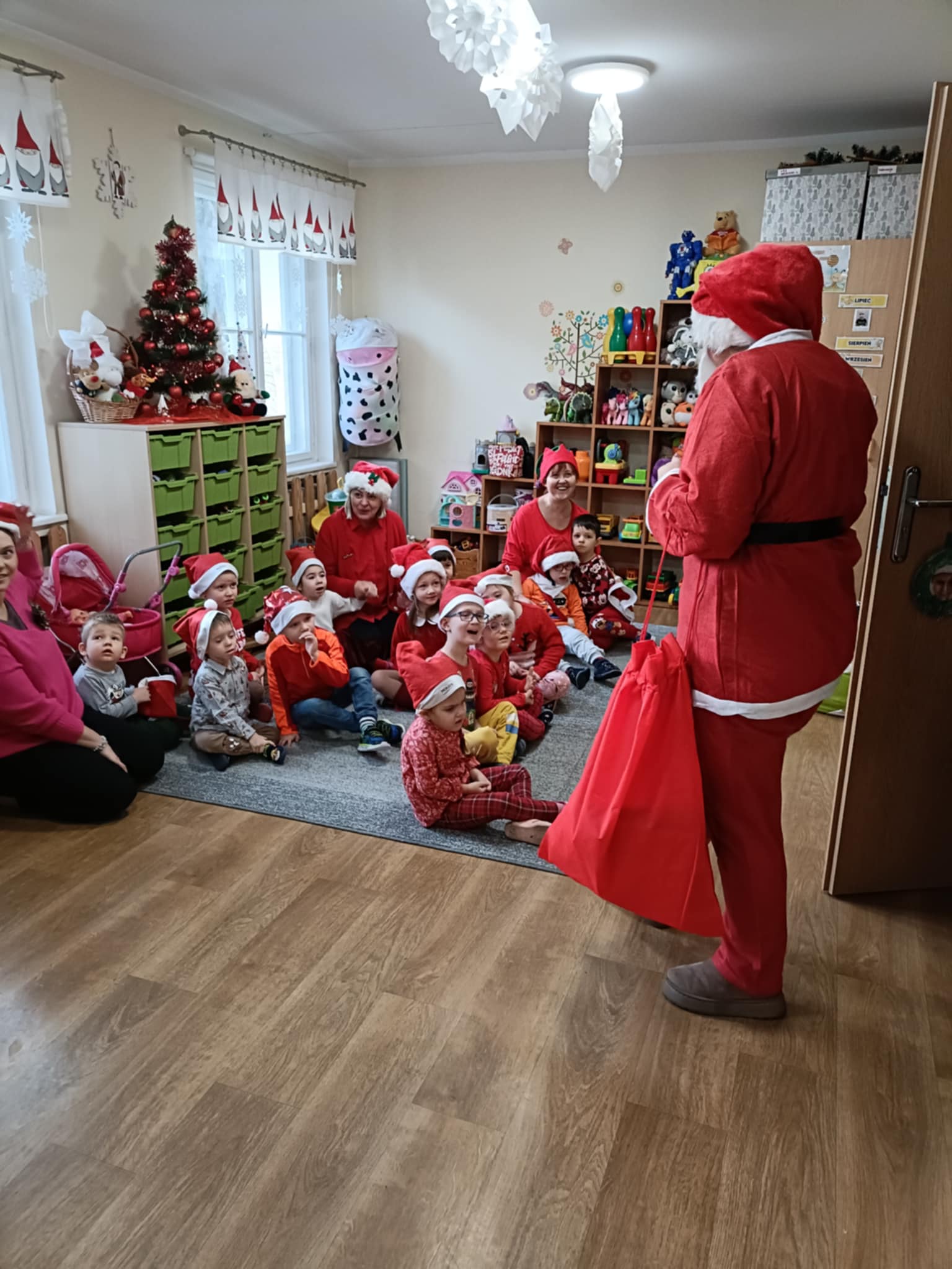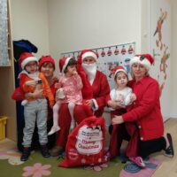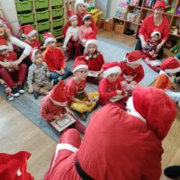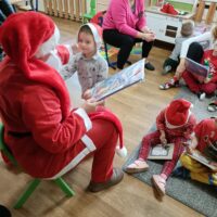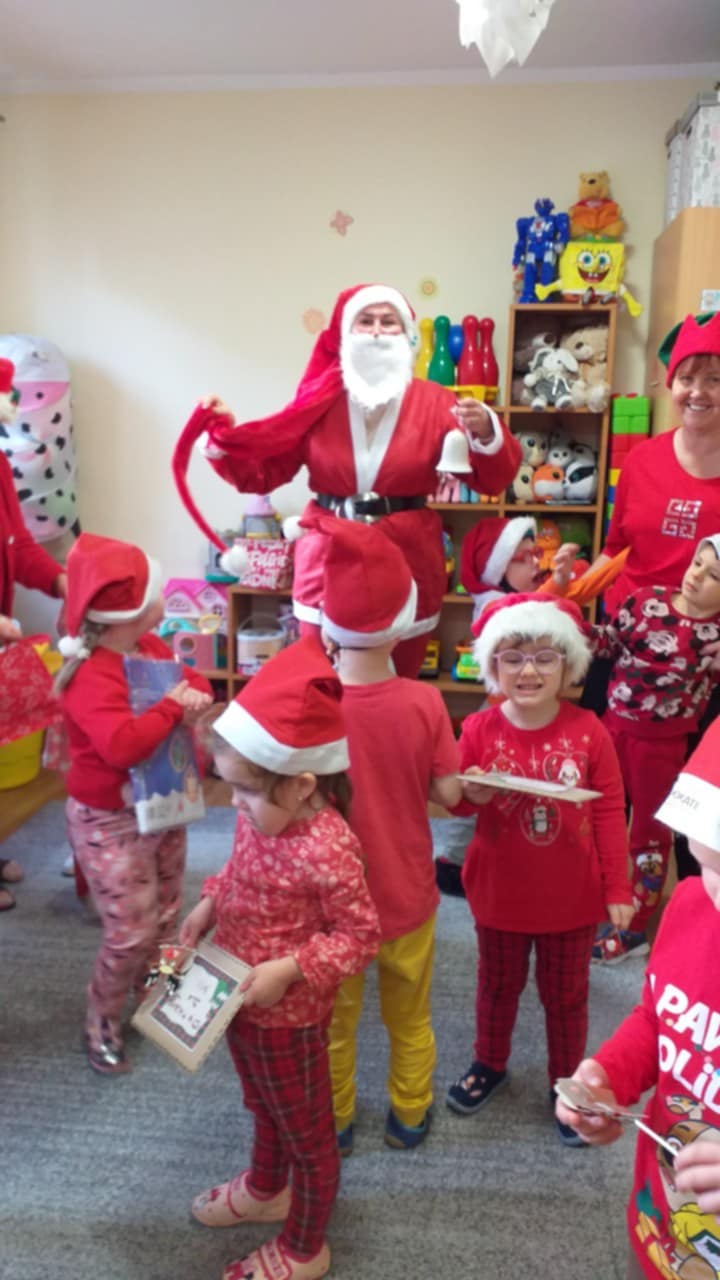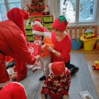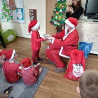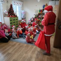 Dnia 06 grudnia do przedszkola zawitał wyjątkowy gość. Tego dnia nasze przedszkolaki ubrane były na czerwono, a na ich głowach widniały mikołajkowe czapeczki. Wszystkie  grupy zebrały się w jednej sali w przyjaznej i radosnej atmosferze.  W nastroju wielkiego oczekiwania usłyszały dzwoneczki i ujrzały Mikołaja z workiem pełnym prezentów. Po radosnym przywitaniu, Mikołaj rozmawiał z dziećmi, zachęcał je, aby były grzeczne, słuchały rodziców oraz pań w przedszkolu. Następnie wszystkim przedszkolakom rozdał prezenty, zaprosił do wspólnej zabawy  i wspólnego zdjęcia. Wizyta wyjątkowego gościa wprowadziła wszystkich w radosny klimat zbliżających się Świąt Bożego Narodzenia.