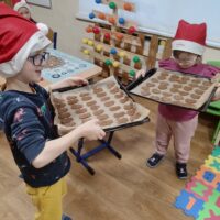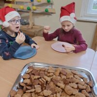 Waleczne Pszczółki w poniedziałek miały pracowity dzień – upiekły pierniczki. Od samego rano unosił się w przedszkolu korzenny zapach przypraw. Dzieci wałkowały ciasto i wykrawały pierniczki różnych kształtów. Po upieczeniu był czas na degustację. Wszystkim dzieciom bardzo smakowały wypieki. Prowadzenie Małgorzata Zajączkowska