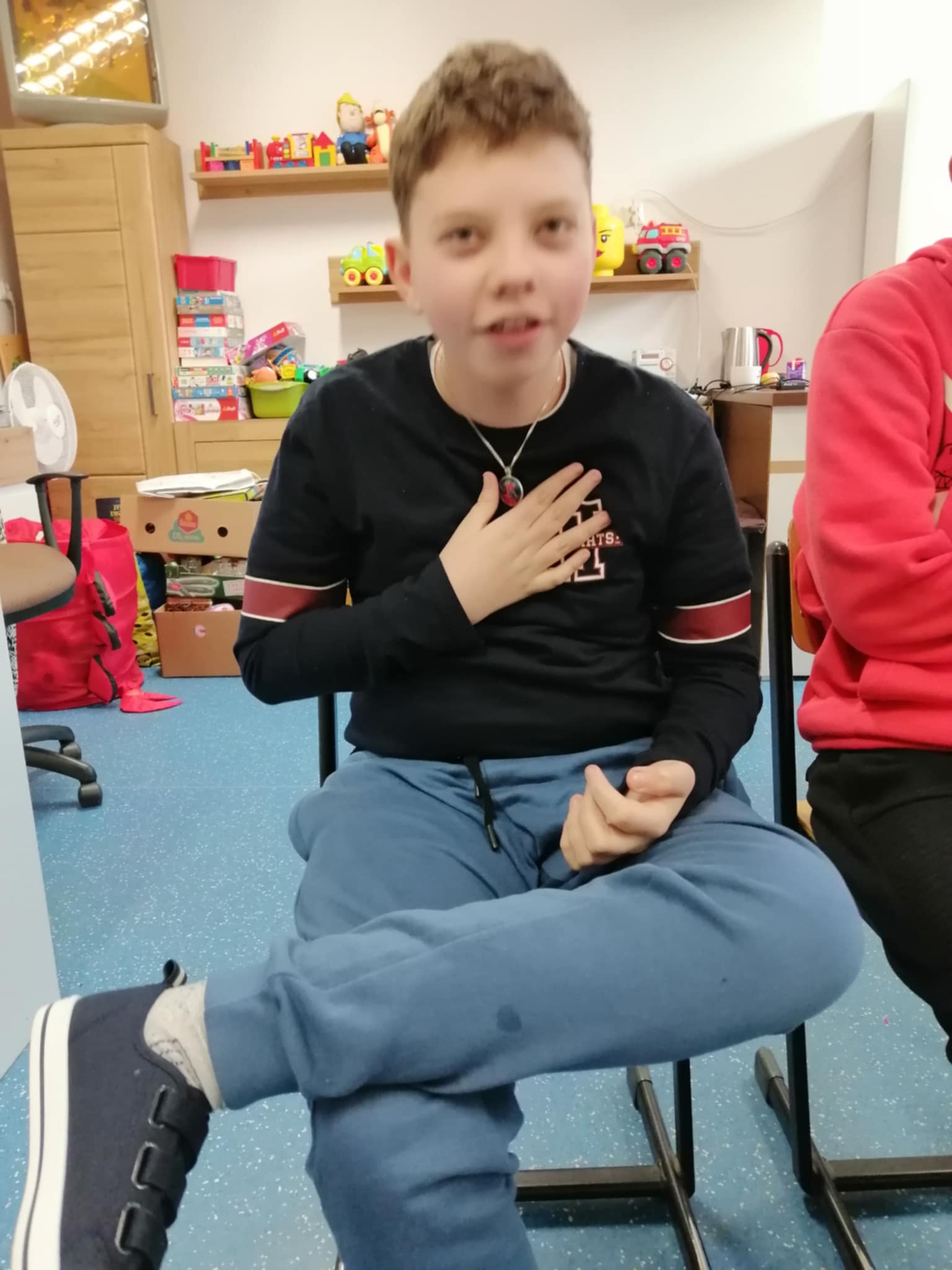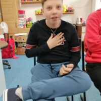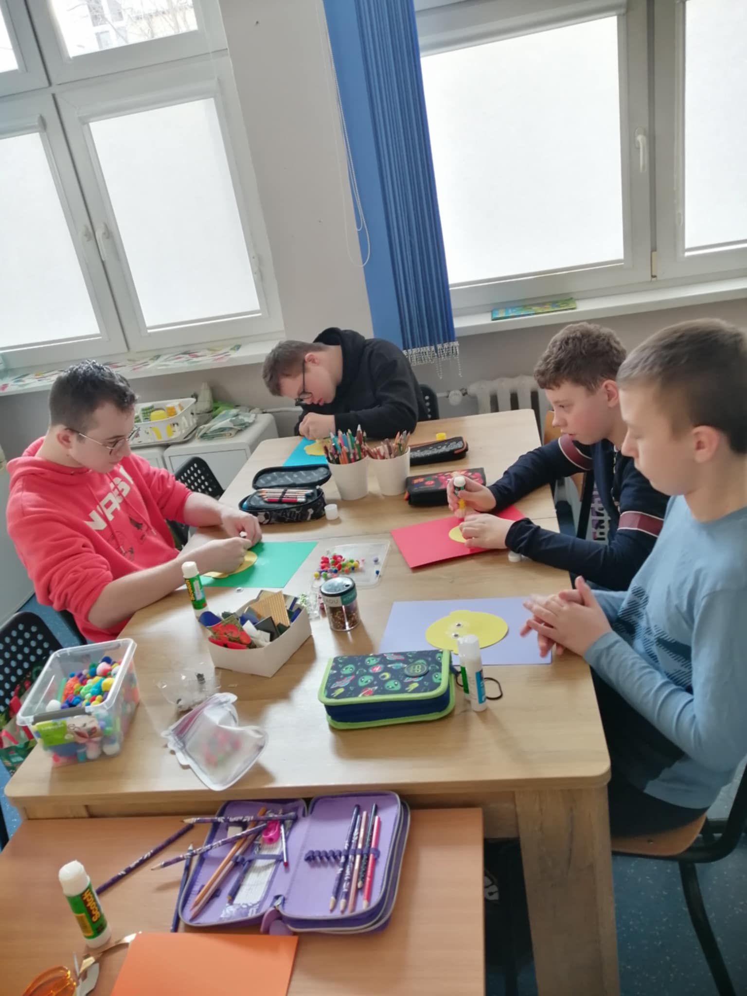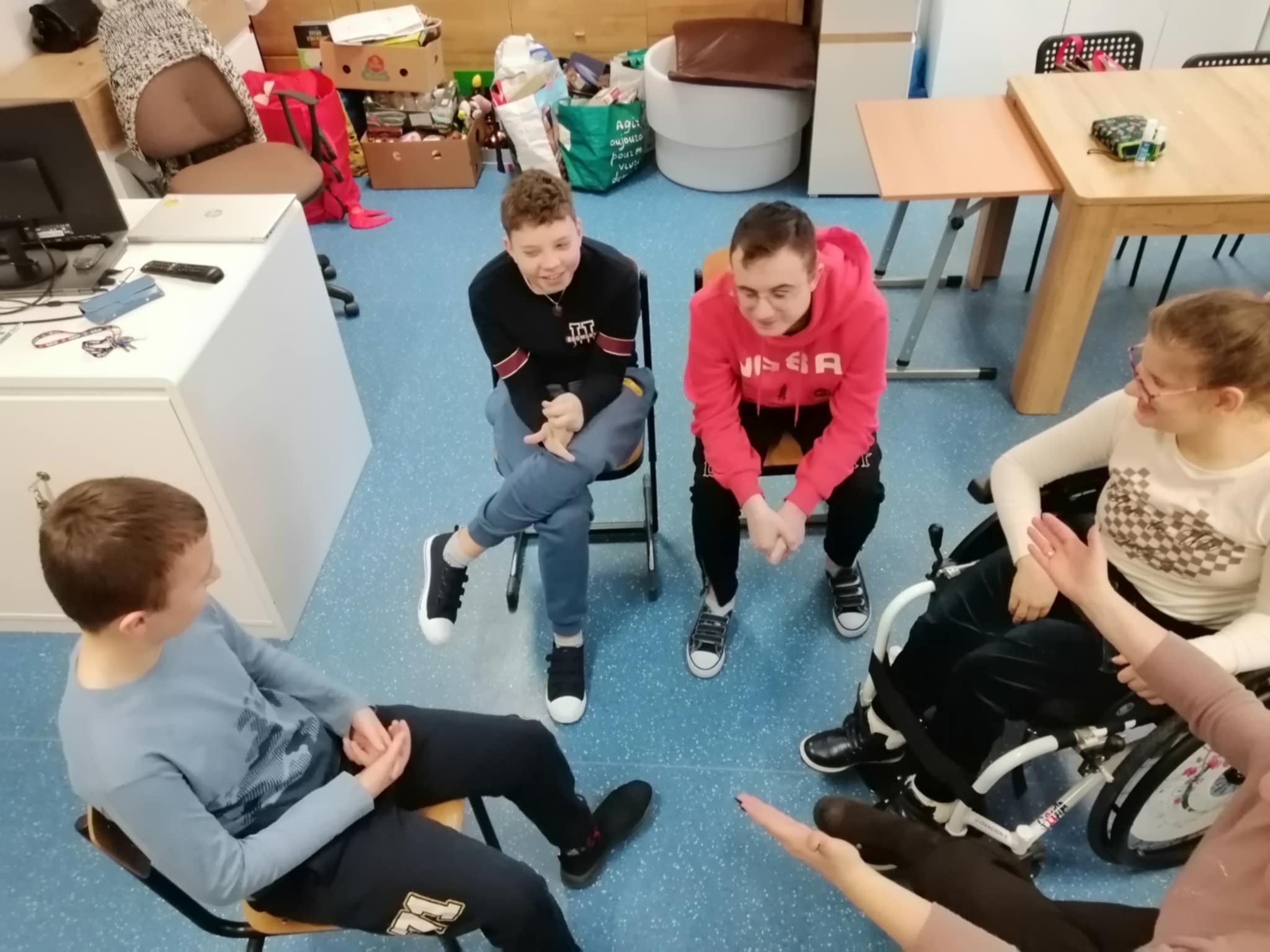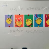 Podczas kolejnego spotkania, będącego realizacją zamierzeń innowacji pedagogicznej „Dajemy dzieciom siłę- zrozum emocje, zrelaksuj głowę” uczniowie klasy 8d zet oraz 4d zet nabywali umiejętność wyrażania wdzięczności i komplementowania innych. Na początku śmiechoterapią sprawiliśmy, że każdy z nas miał dobry humor. Tworząc portrety, z takim samopoczuciem, młodzież mogła spojrzeć na siebie i innych w radośniejszych barwach, wyrażając komplement w sposób kreatywny. Uczniowie uczyli się komplementowania siebie wzajemnie, określali również za co lubią samego siebie. Dzięki dzisiejszym zajęciom uczniowie zrozumieli wartość i potrzebę mówienia innym miłych słów. Jest to ważne w naszym życiu, ponieważ ma ogromny wpływ na samoocenę.