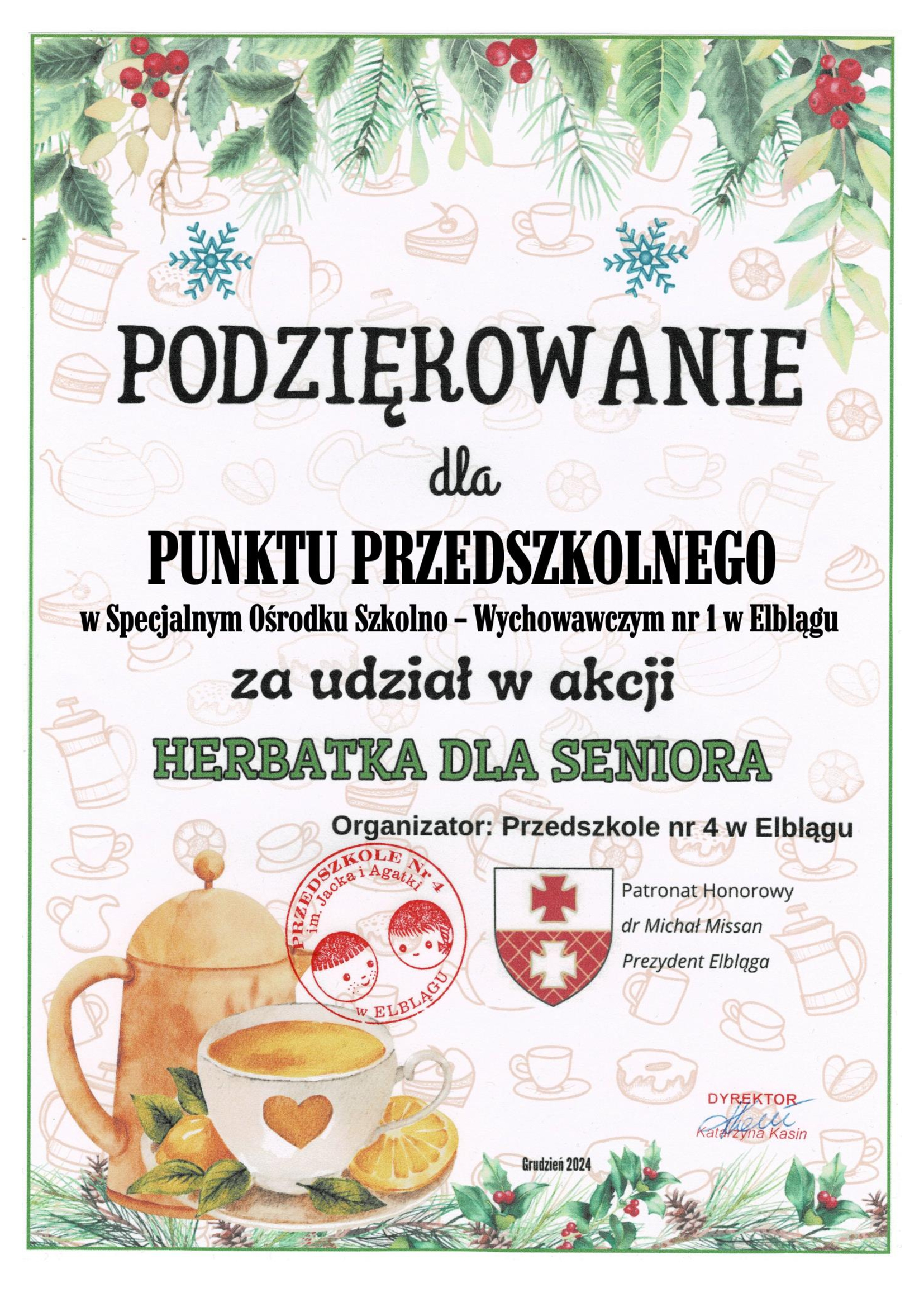 Punkt przedszkolny po raz kolejny wziął udział w akcji „Herbatka dla seniora” pod hasłem: ,,Od juniora dla seniora”. Rodzice, dzieci oraz pracownicy przedszkola przygotowali w grudniu dla seniorów świąteczne dary, które zostały dostarczone osobom starszym i potrzebującym pomocy.