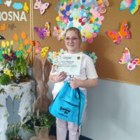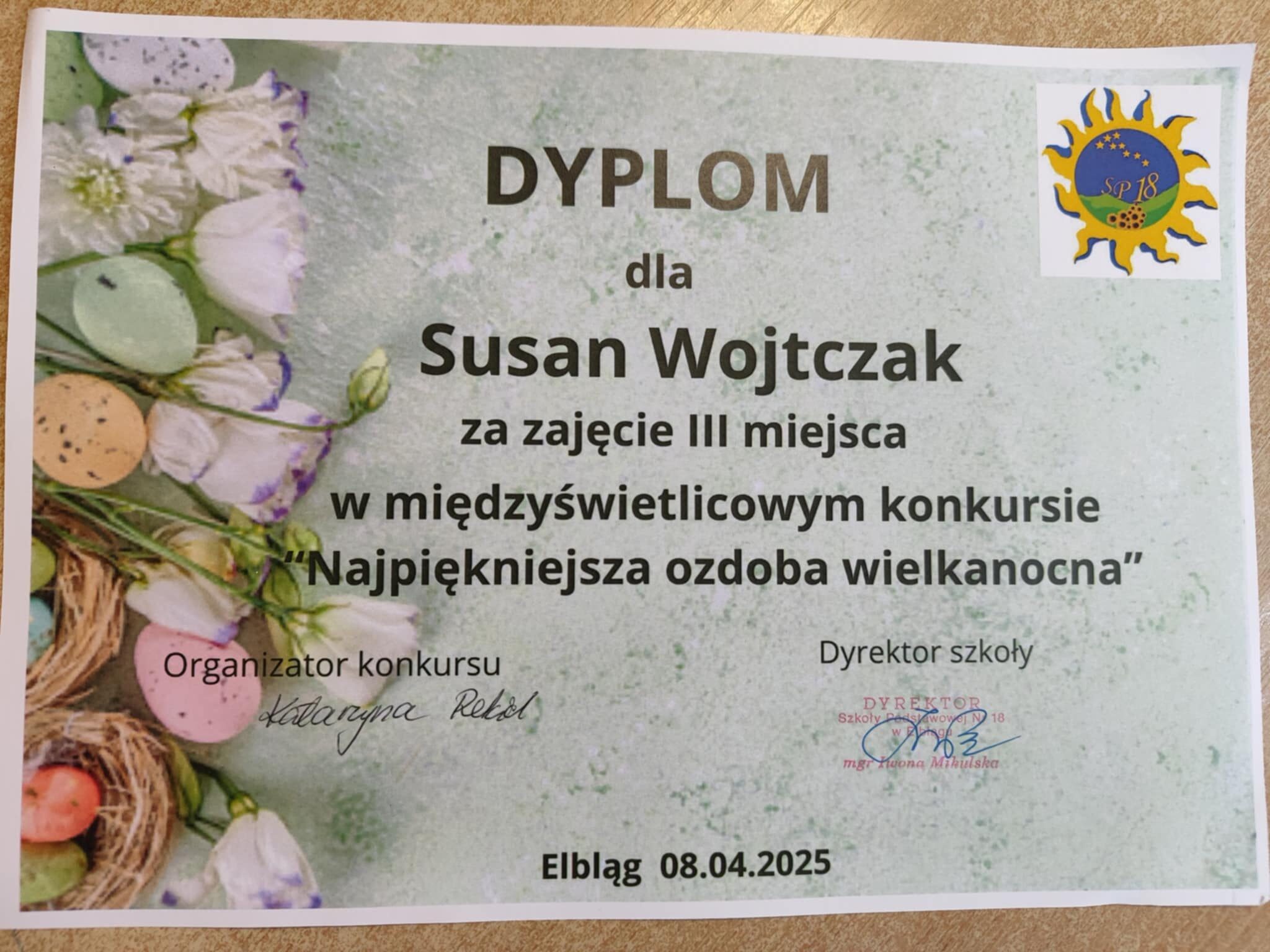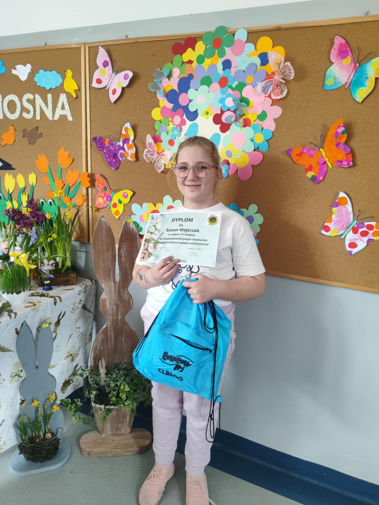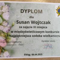 Gratulacje dla Susan Wojtczak, która zajęła III miejsce w międzyświetlicowym konkursie zorganizowanym przez Szkołę Podstawową nr 18 pt. „Najpiękniejsza ozdoba wielkanocna”.