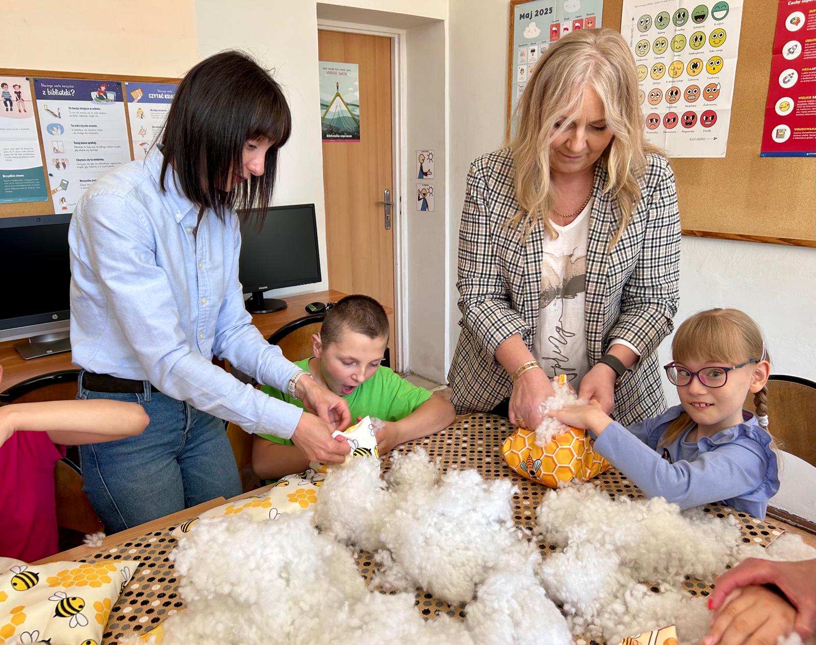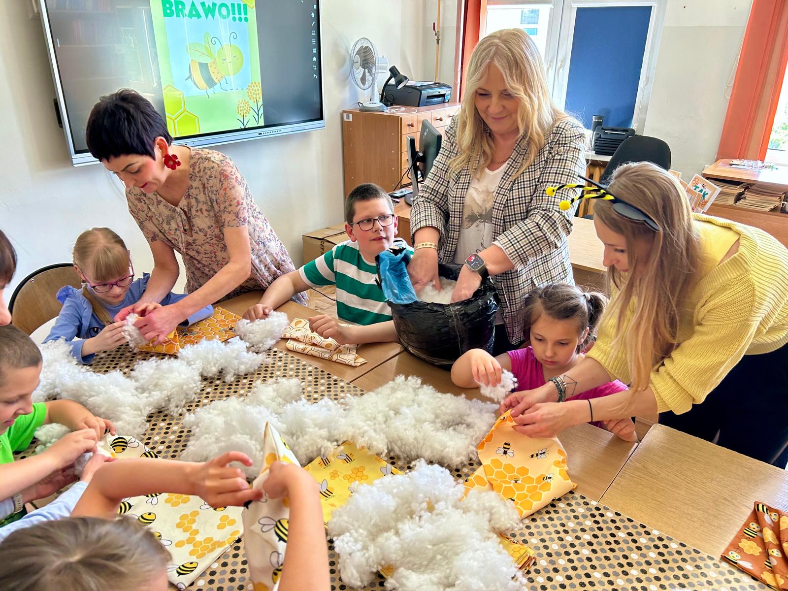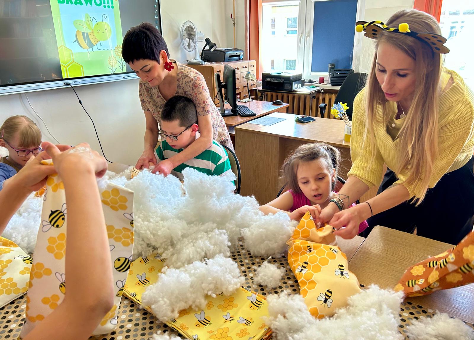 W części warsztatowej uczestnicy wykonali mięciutkie poduszki z motywem pszczół. Każda z nich została wykonana z dużym zaangażowaniem i sercem. Gotowe poduszki zostaną przekazane na cele dobroczynne. Nie zabrakło również wspólnej zabawy – dzieci śpiewały piosenkę o pszczółkach i zatańczyły wesoły taniec, wcielając się w role małych, pracowitych owadów.