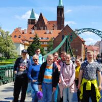 Kolejnym punktem dnia był rejs Parostatkiem po Odrze. Podziwialiśmy krajobrazy, piękne stare kamienice i mosty, których we Wrocławiu jest ok 100. Obiad ,to obowiązkowy element w grafiku. Dziś mieliśmy ucztę w najlepszej Pierogarnia w mieście. Krótki spacer i dotarliśmy do Hali Stulecia, gdzie z zachwytem podziwialiśmy pokaz tańczących fontann. To był cudowny dzień.