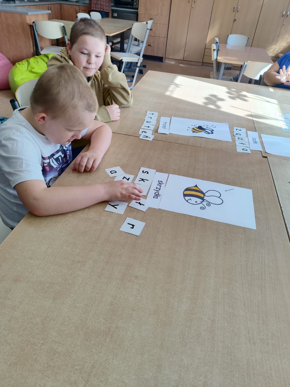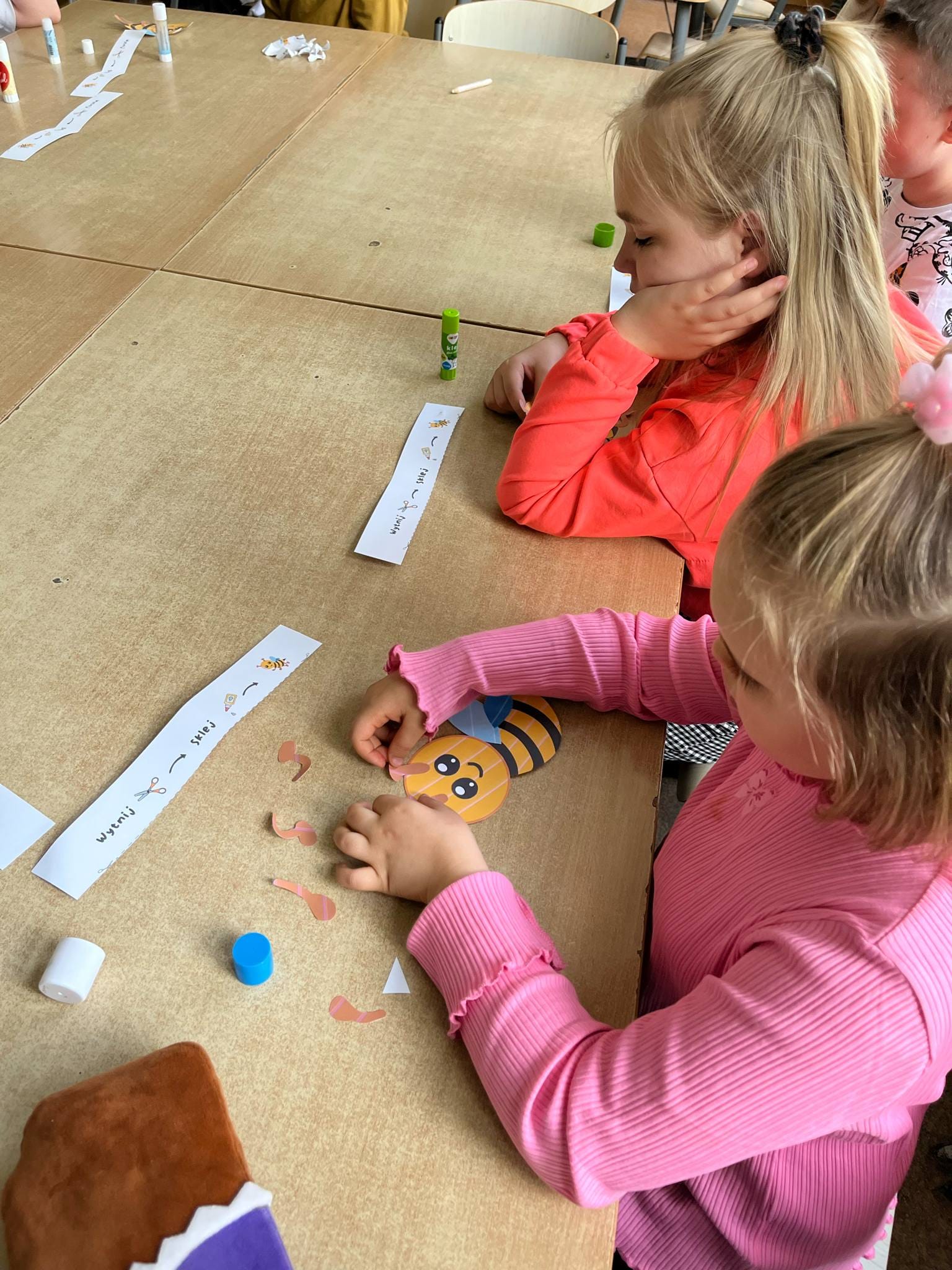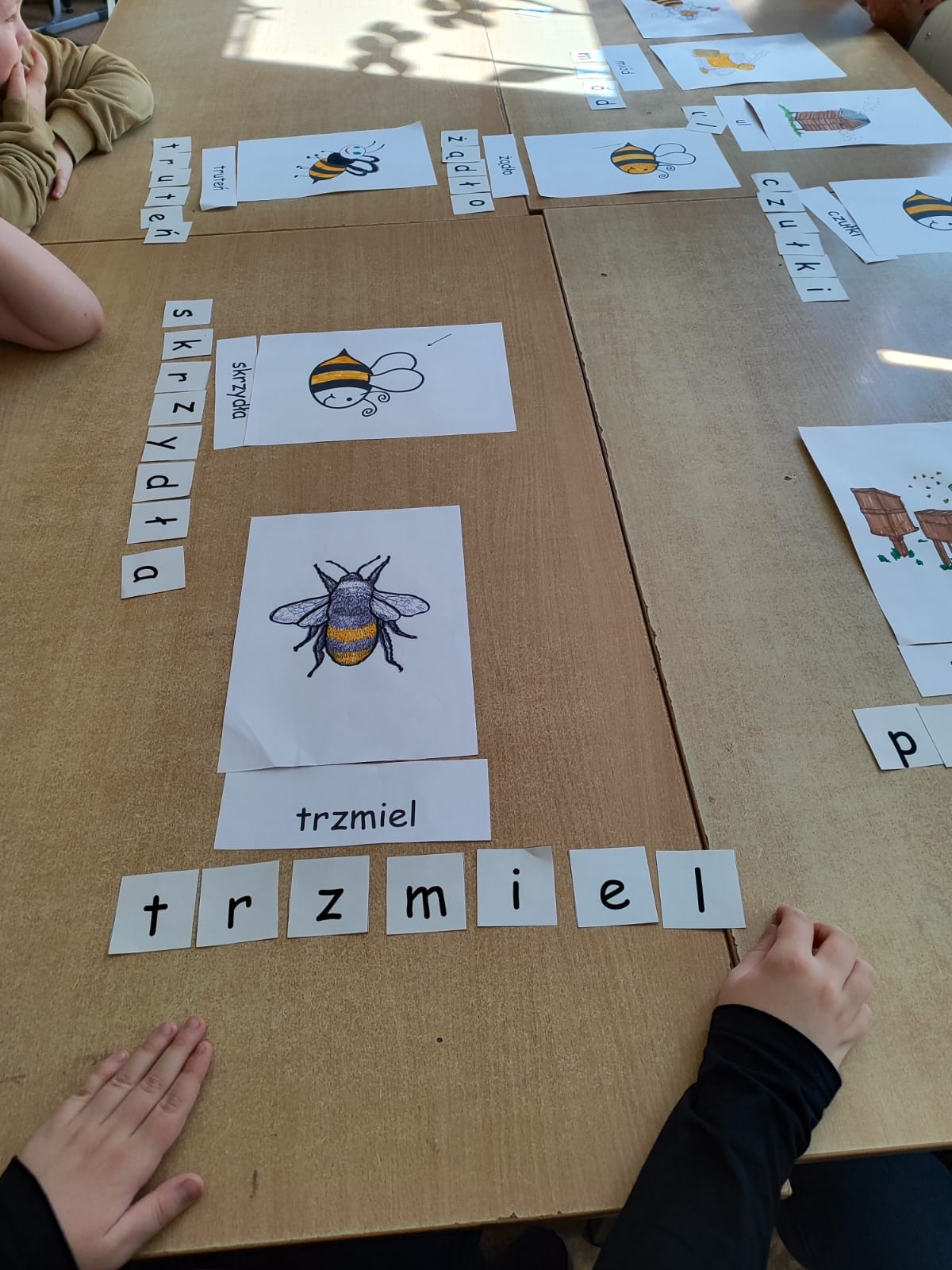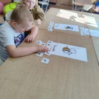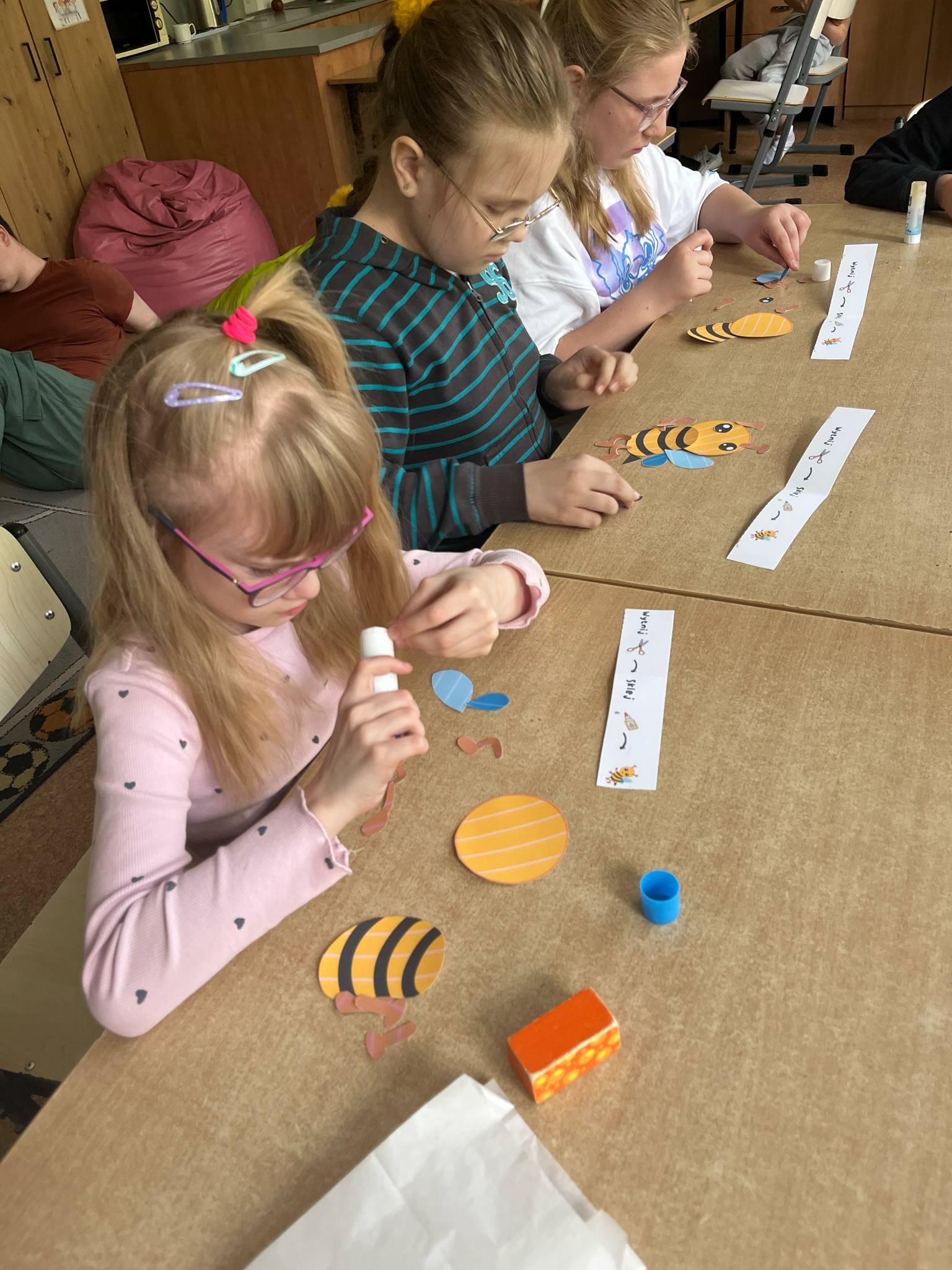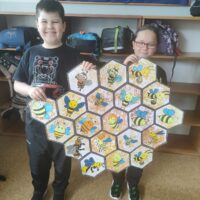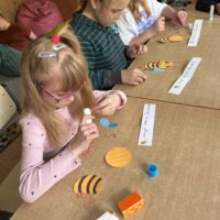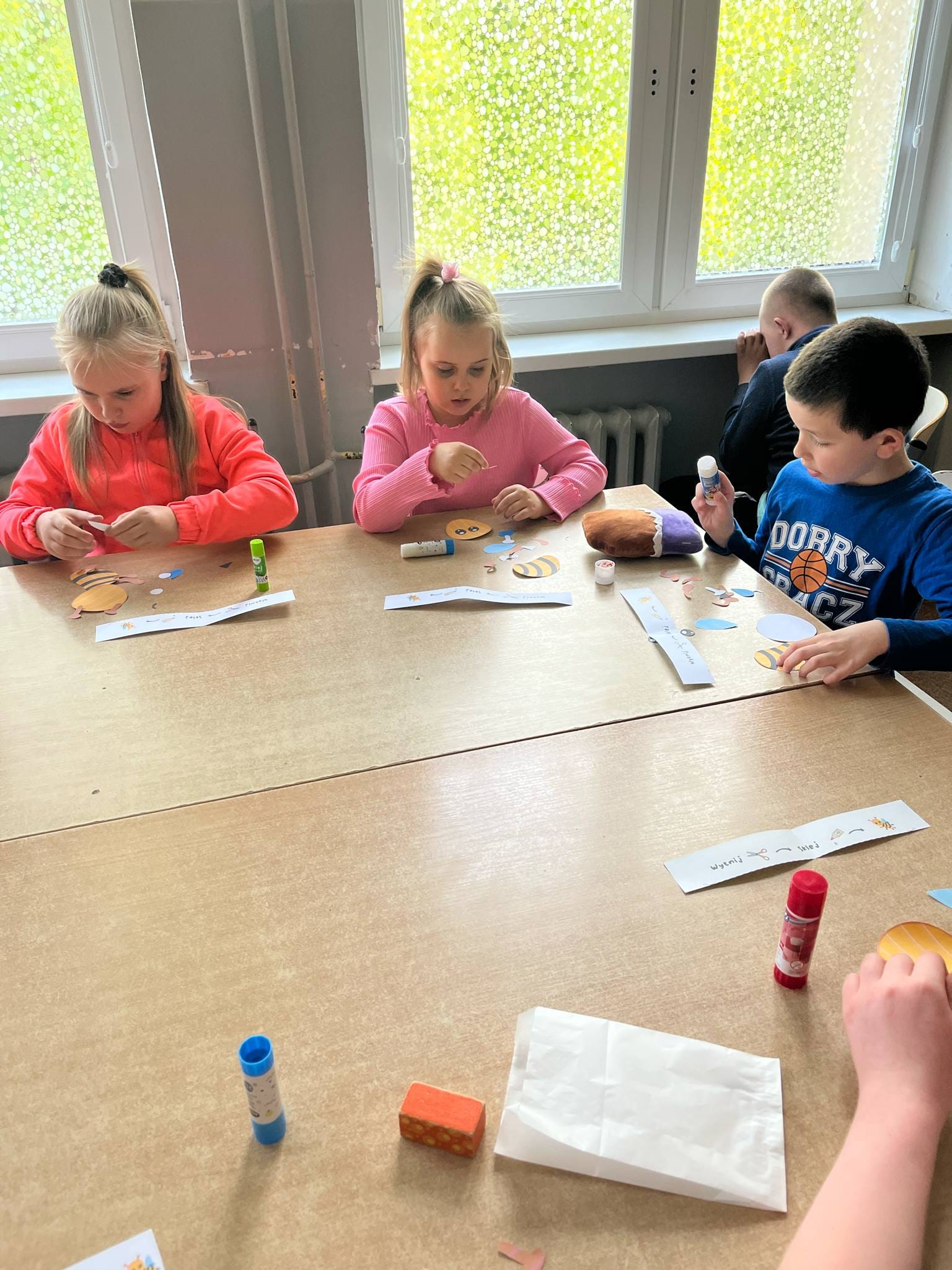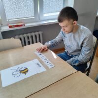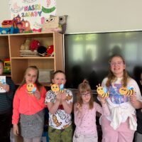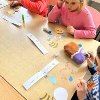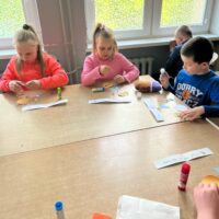 W świetlicy uczniowie tworzyli pszczółki z papieru oraz przestrzenne plastry miodu z opakowań z recyklingu. Przy okazji mierzyli się z ortograficznymi łamigłówkami – układali słowa z trudnością ortograficzną z rozsypanych liter. Każde zadanie rozwijało ich umiejętności językowe, a jednocześnie pozostawało atrakcyjne i dostosowane do ich możliwości.