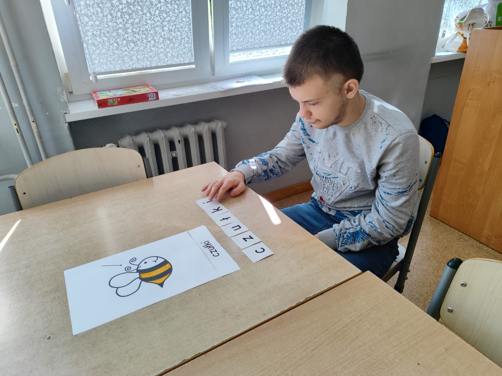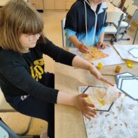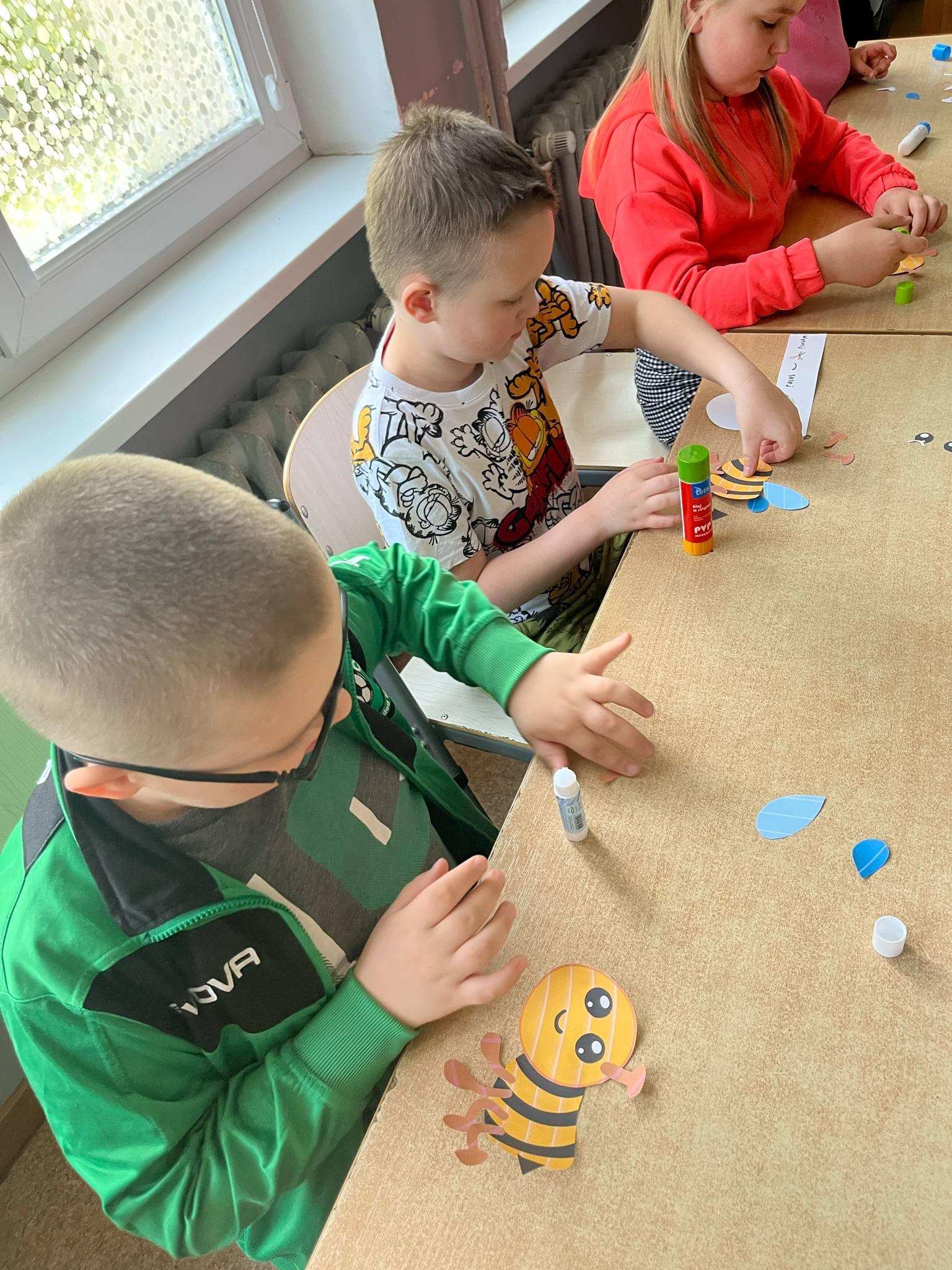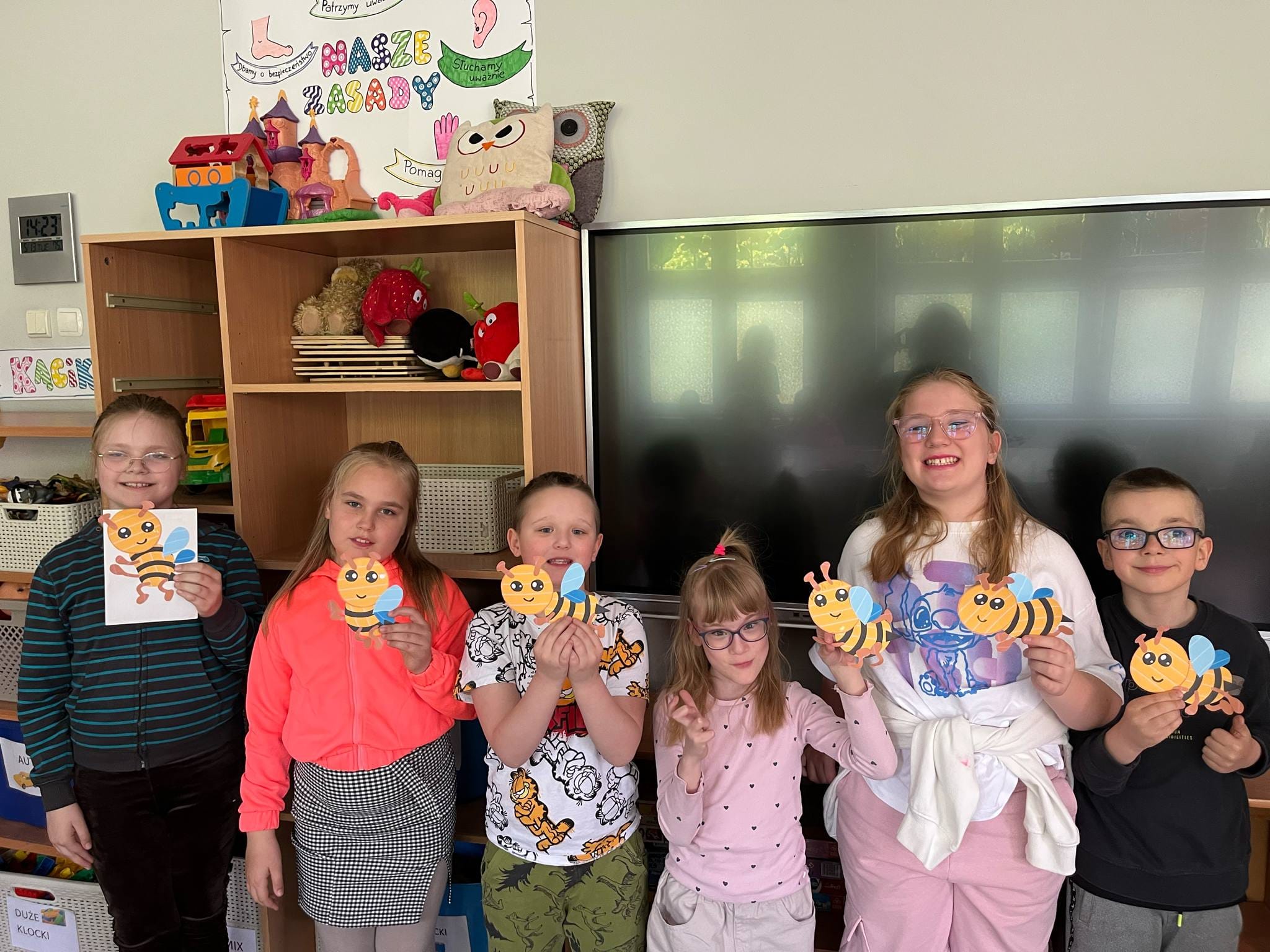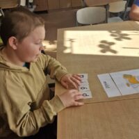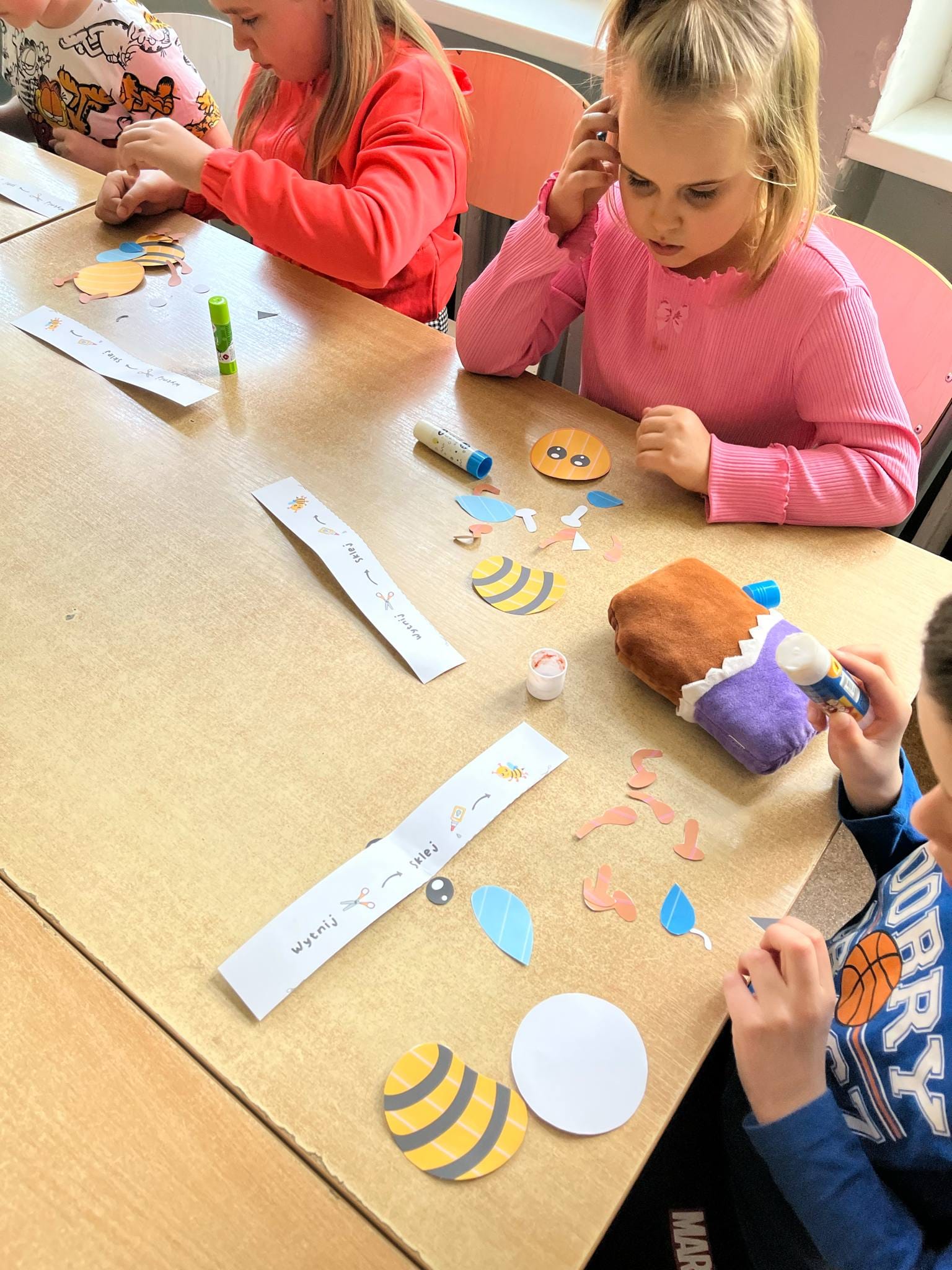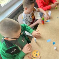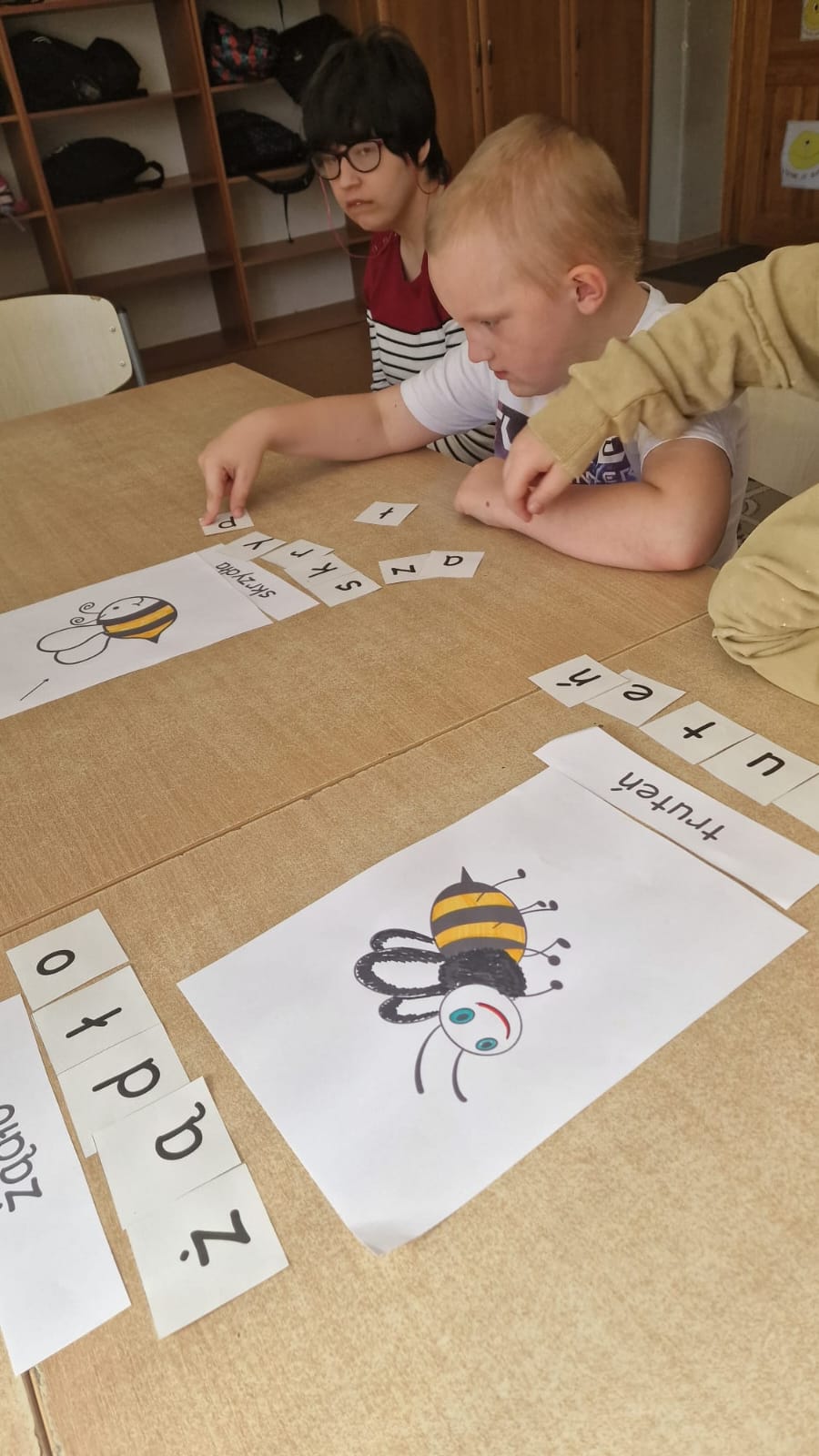 W świetlicy uczniowie tworzyli pszczółki z papieru oraz przestrzenne plastry miodu z opakowań z recyklingu. Przy okazji mierzyli się z ortograficznymi łamigłówkami – układali słowa z trudnością ortograficzną z rozsypanych liter. Każde zadanie rozwijało ich umiejętności językowe, a jednocześnie pozostawało atrakcyjne i dostosowane do ich możliwości.