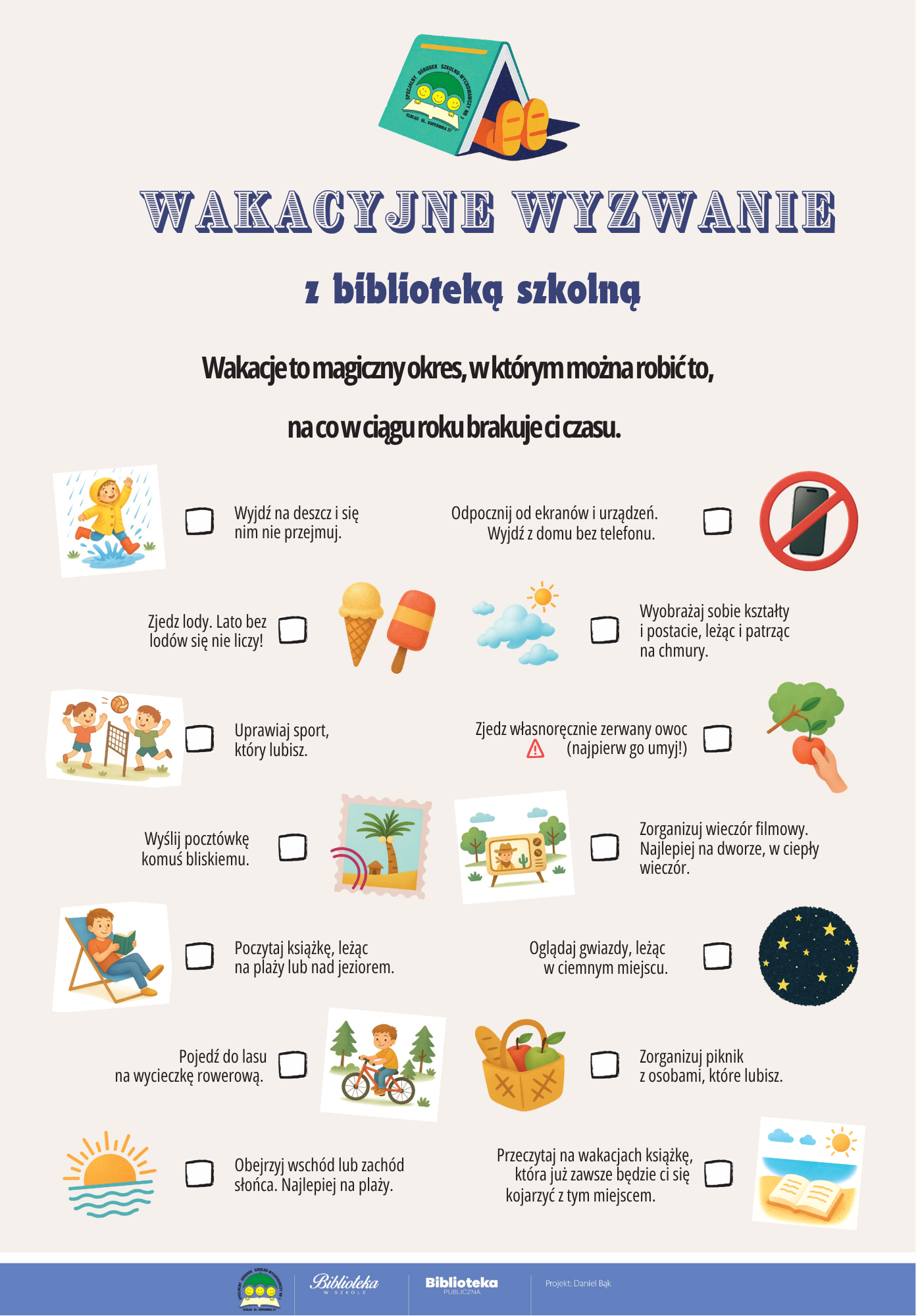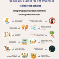 Na zakończenie roku przygotowaliśmy „Wakacyjne wyzwanie z biblioteką” – zestaw lekkich, przyjemnych zadań na lato, w którym nadal można wziąć udział! To świetna okazja, by spędzić czas w relaksujący sposób, odkrywając radość z codziennych chwil: spacerów, obserwowania przyrody czy czytania książki na świeżym powietrzu. Wyzwanie dostępne jest przez całe wakacje – zapraszamy wszystkich uczniów do udziału!