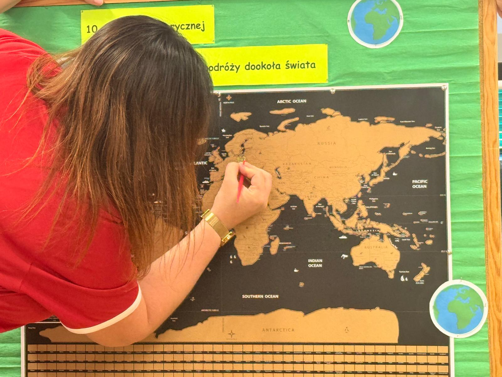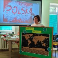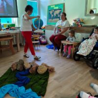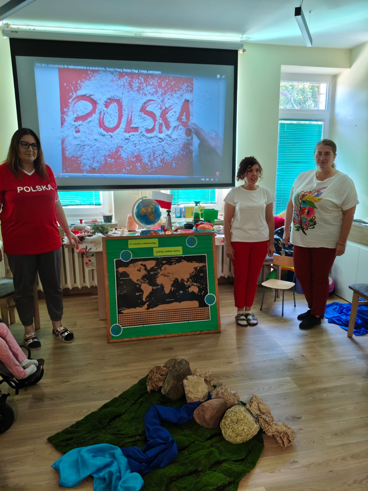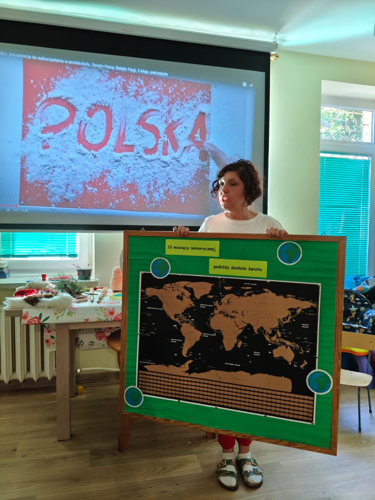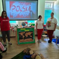 25 września uroczyście rozpoczęliśmy pierwsze zajęcia z cyklu „10 miesięcy sensorycznej podróży dookoła świata”. Pierwszym krajem, który odwiedziliśmy była Polska. Nasza podróż rozpoczęła się w górach u źródła rzeki Wisły i z jej nurtem podążaliśmy aż do Bałtyku. Odwiedziliśmy symbolicznie również Kraków, Warszawę i Toruń. Podróżując dzieci poznały Polskę wszystkimi zmysłami – dotykały skał, szyszek, soli, czerwonych korali, bursztynu, piasku, muszli. Słuchały odgłosów owiec, góralskiego śpiewu, hejnału z wieży mariackiej, dźwięków stalicy i szumu fal. Oglądały prezentację multimedialną o Polsce i symbolach narodowych, zabytkach, charakterystycznych miejscach. Wąchały i smakowały regionalnych potraw i przypraw: oscypki, sól, jabłko, miód, mleko, pierniki, śledzie. W ramach zajęć dzieci miały również możliwość usprawniania motoryki małej budując budowle z klocków, kolorowały symbole narodowe. Podsumowaniem zajęć było odnalezienie Polski na mapie świata.