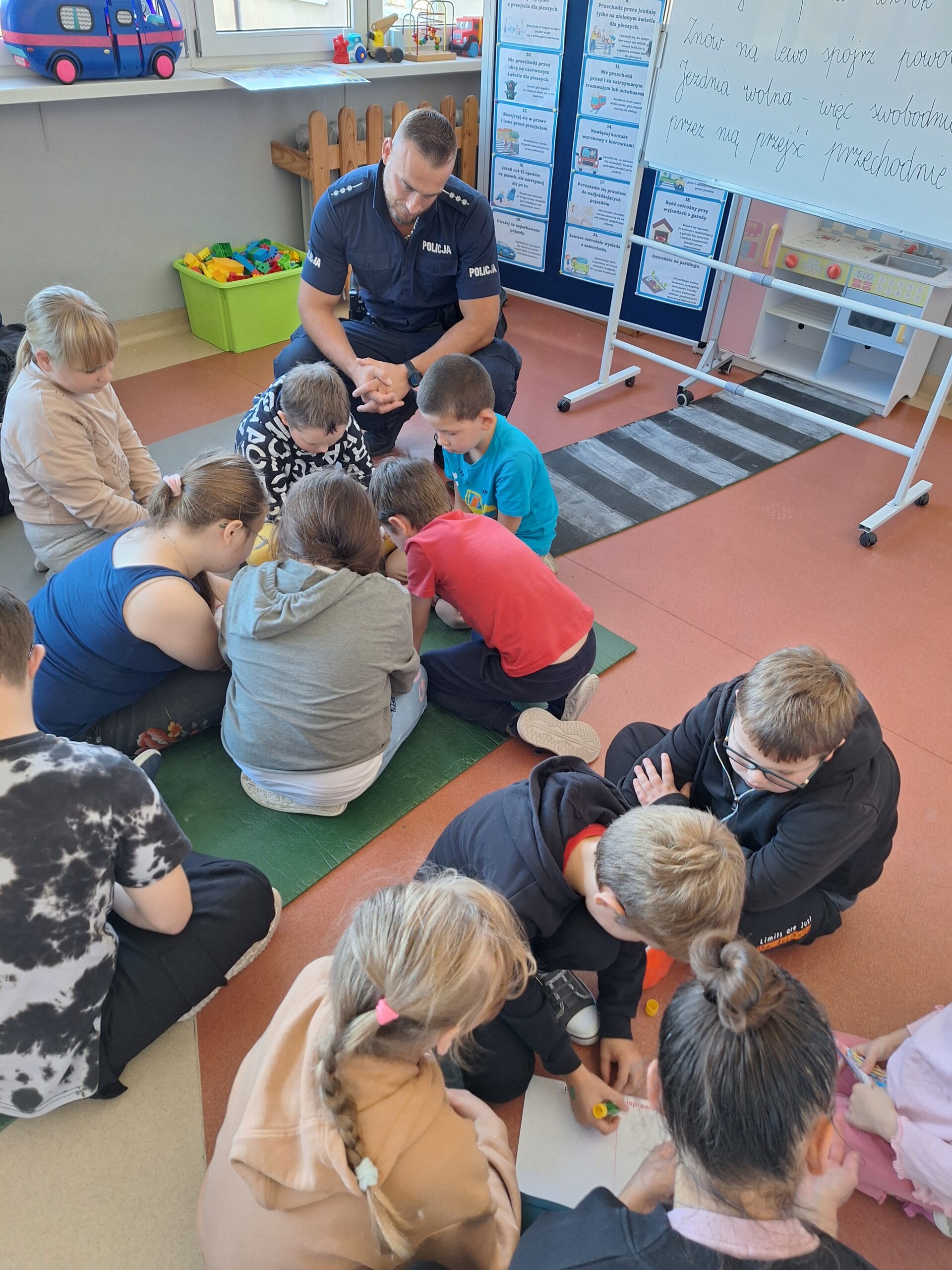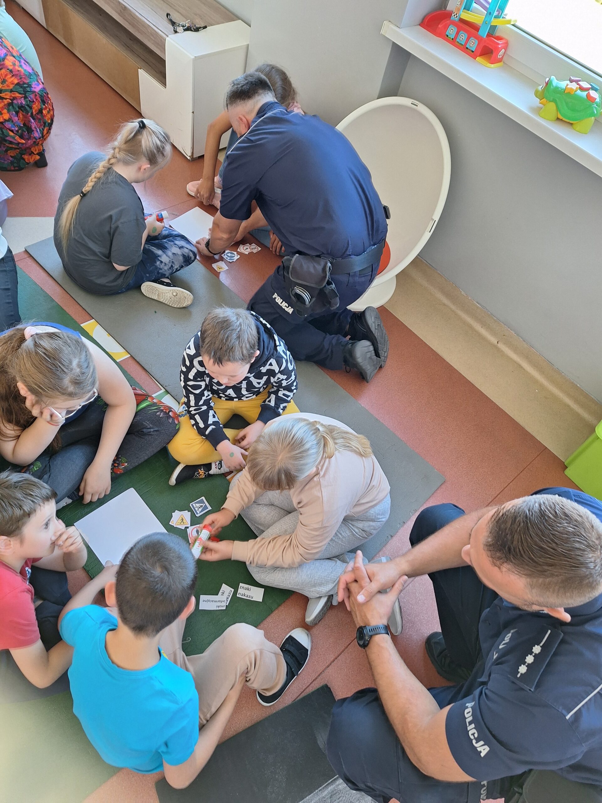 Podczas zajęć dzieci wspólnie z policjantami zastanawiały się, jakie są właściwe i niewłaściwe zachowania na drodze.