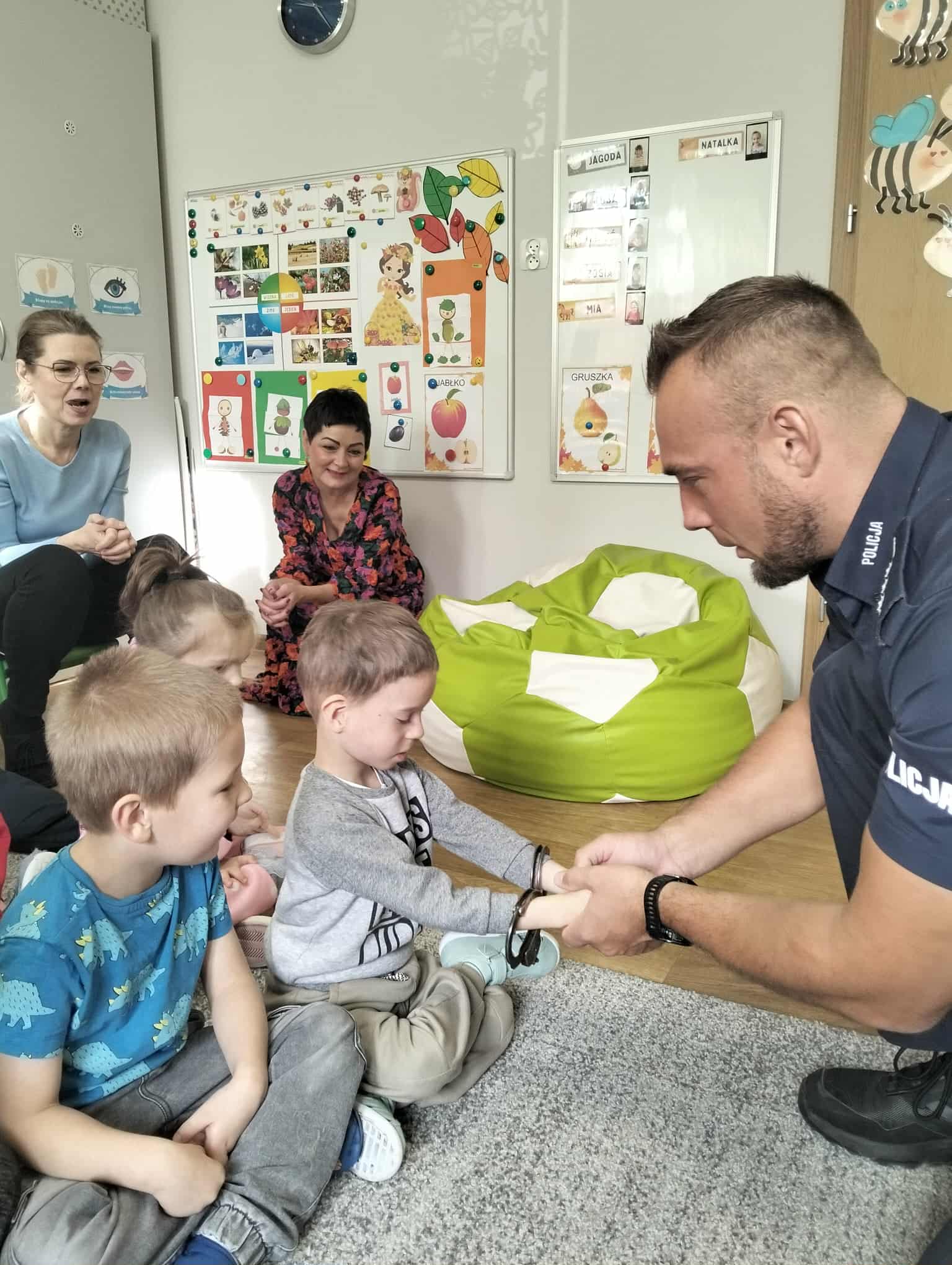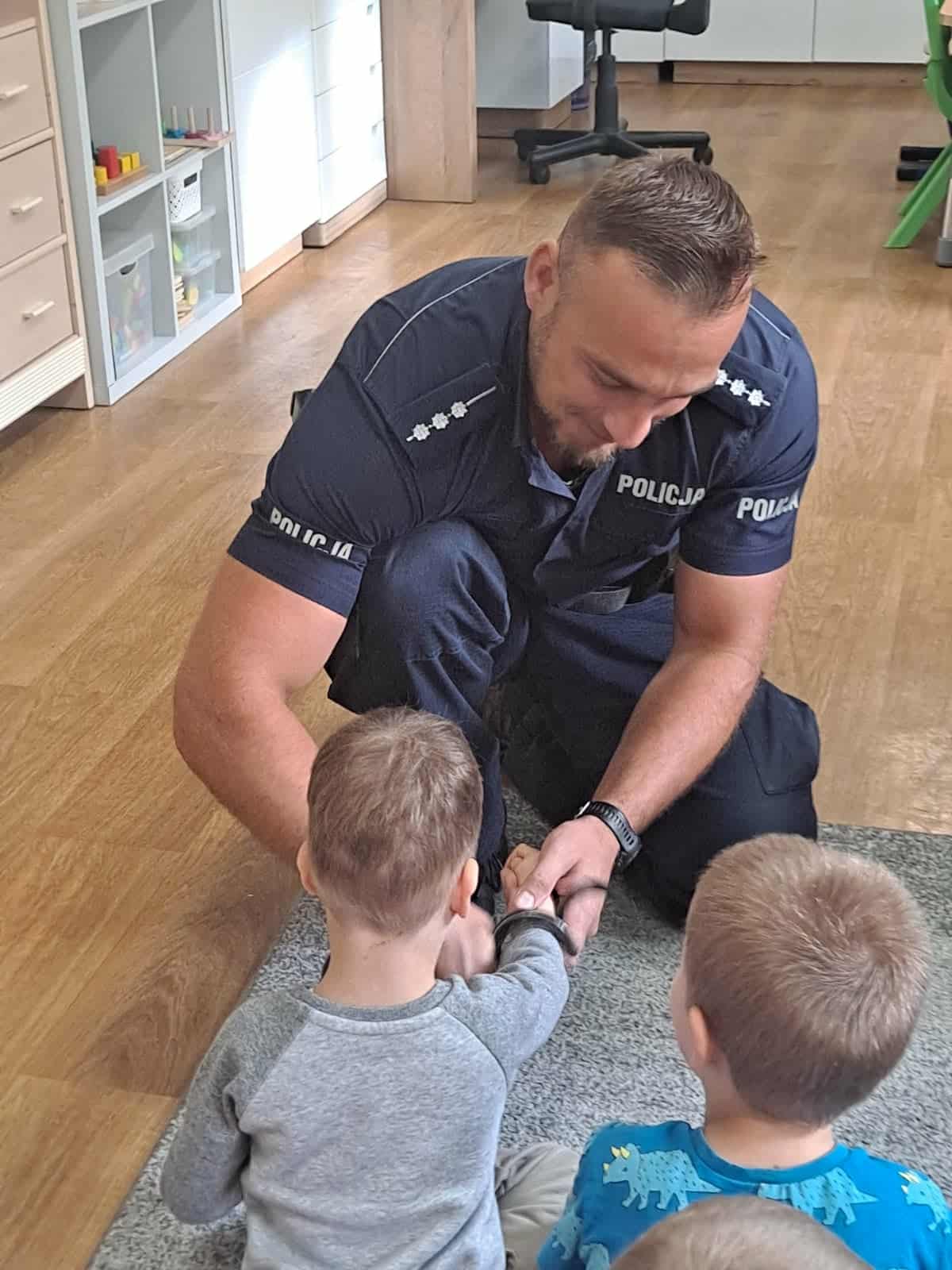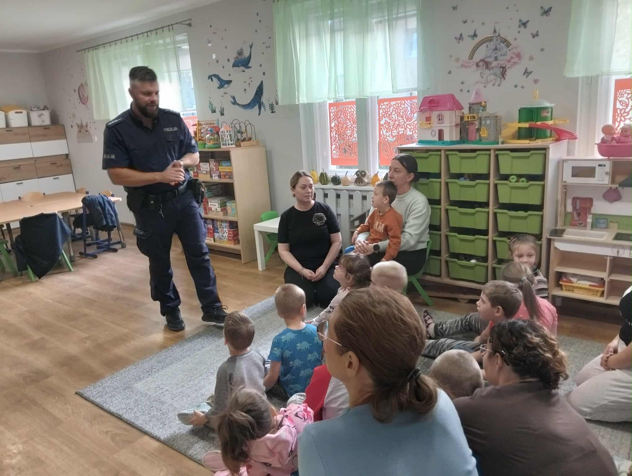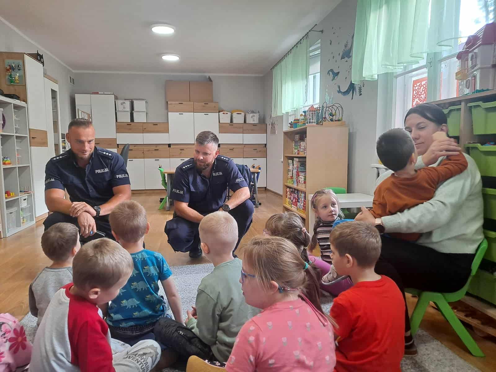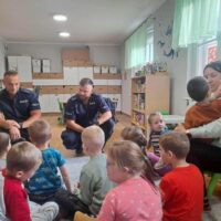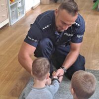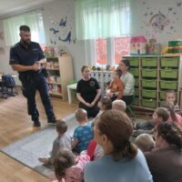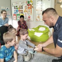W minionym tygodniu do naszego przedszkola przybyli policjanci z Komendy Miejskiej Policji w Elblągu. Głównym celem wizyty było przypomnienie podstawowych zasad bezpieczeństwa oraz zapoznanie dzieci z zawodem policjanta. Nasi goście przybliżyli dzieciom podstawowe zasady bezpiecznego poruszania się po drogach, przypomnieli numery alarmowe oraz zasady zachowania się podczas spotkania z nieznajomym. Nasze przedszkolaki dowiedziały się, jak bezpiecznie podróżować, jak ważne jest zapinanie pasów bezpieczeństwa podczas jazdy samochodem. Dużym zainteresowaniem cieszyła się prezentacja ubioru i wyposażenia policyjnego, niezbędnego podczas wykonywania pracy policjanta.