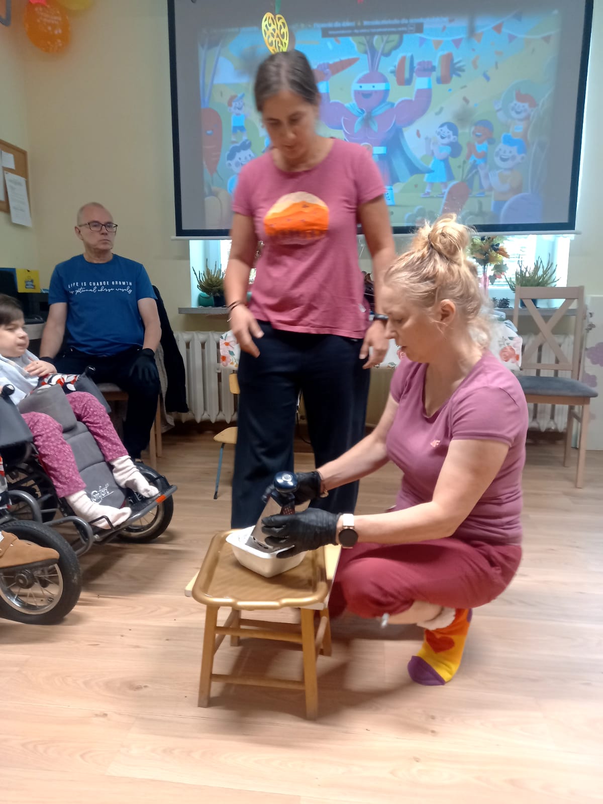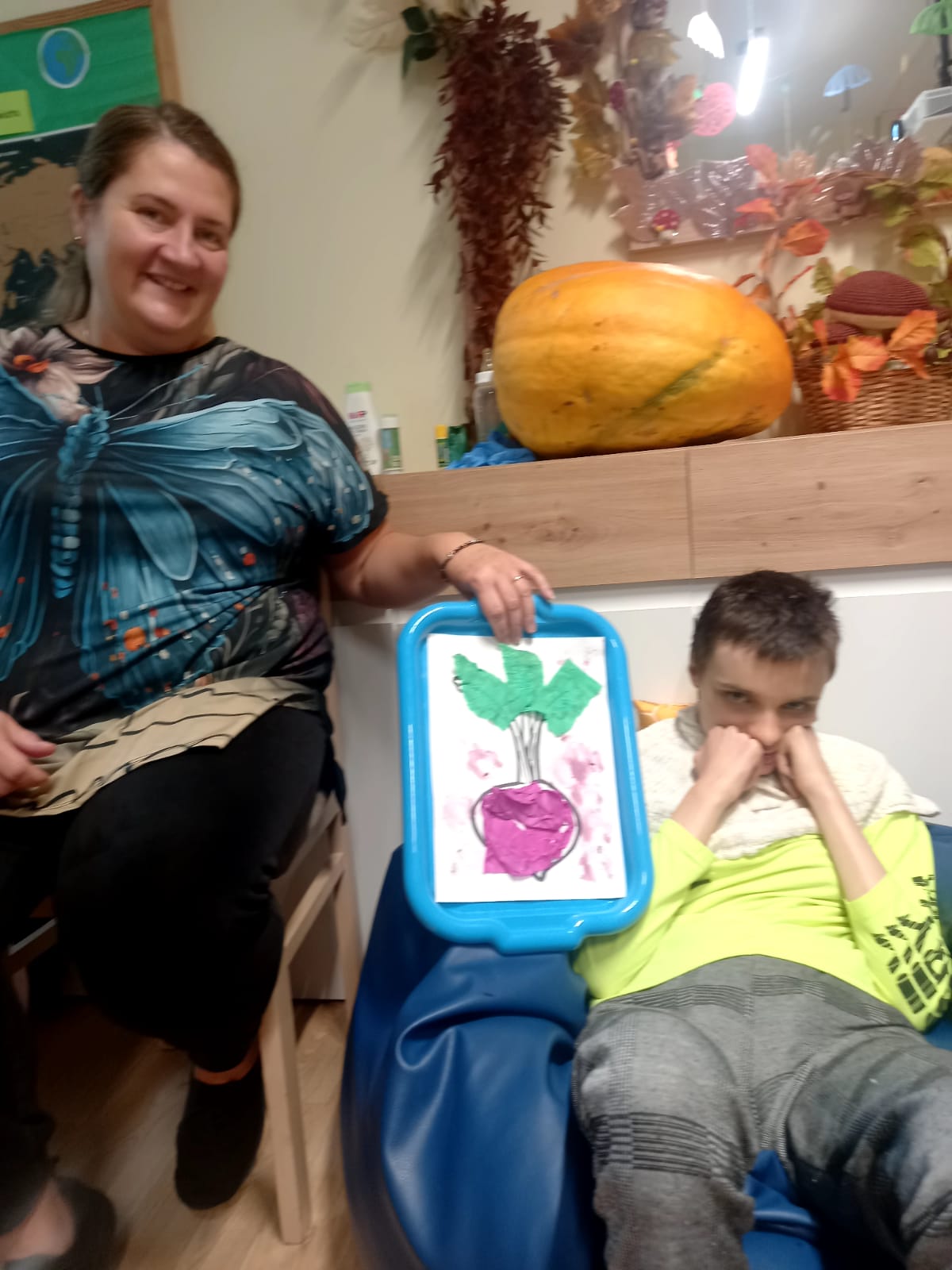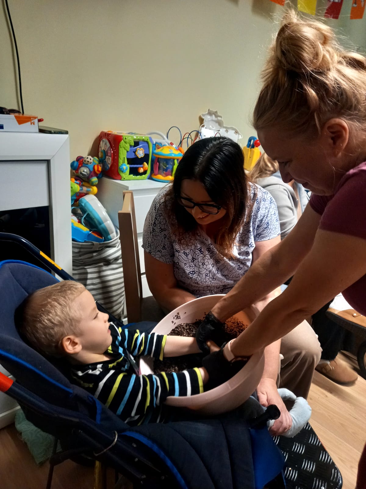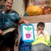 Już tradycyjnie uczniowie mieszkający w DPS uczestniczyli w zajęciach poświęconych warzywu jakim jest BURAK. Spotkanie miało za zadanie aby obejrzeć, zasmakować, dotknąć buraka w ciekawy sposób. W zadaniach było wyszukiwanie buraków w łusce z gryki, dotykanie potarkowanych buraków, wąchanie buraków prosto z ziemi. Uczniowie tworzyli z bibuły prace, pieczętując je burakiem. Na zakończenie tak intensywnego dnia pełnego wrażeń dzieci wzięły udział w procesie powstawania soku z buraka, słuchając dźwięków wyciskarki. Następnie relaksowały się degustując sok z buraka, musy buraczane i barszczyk ukraiński.