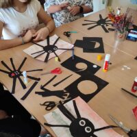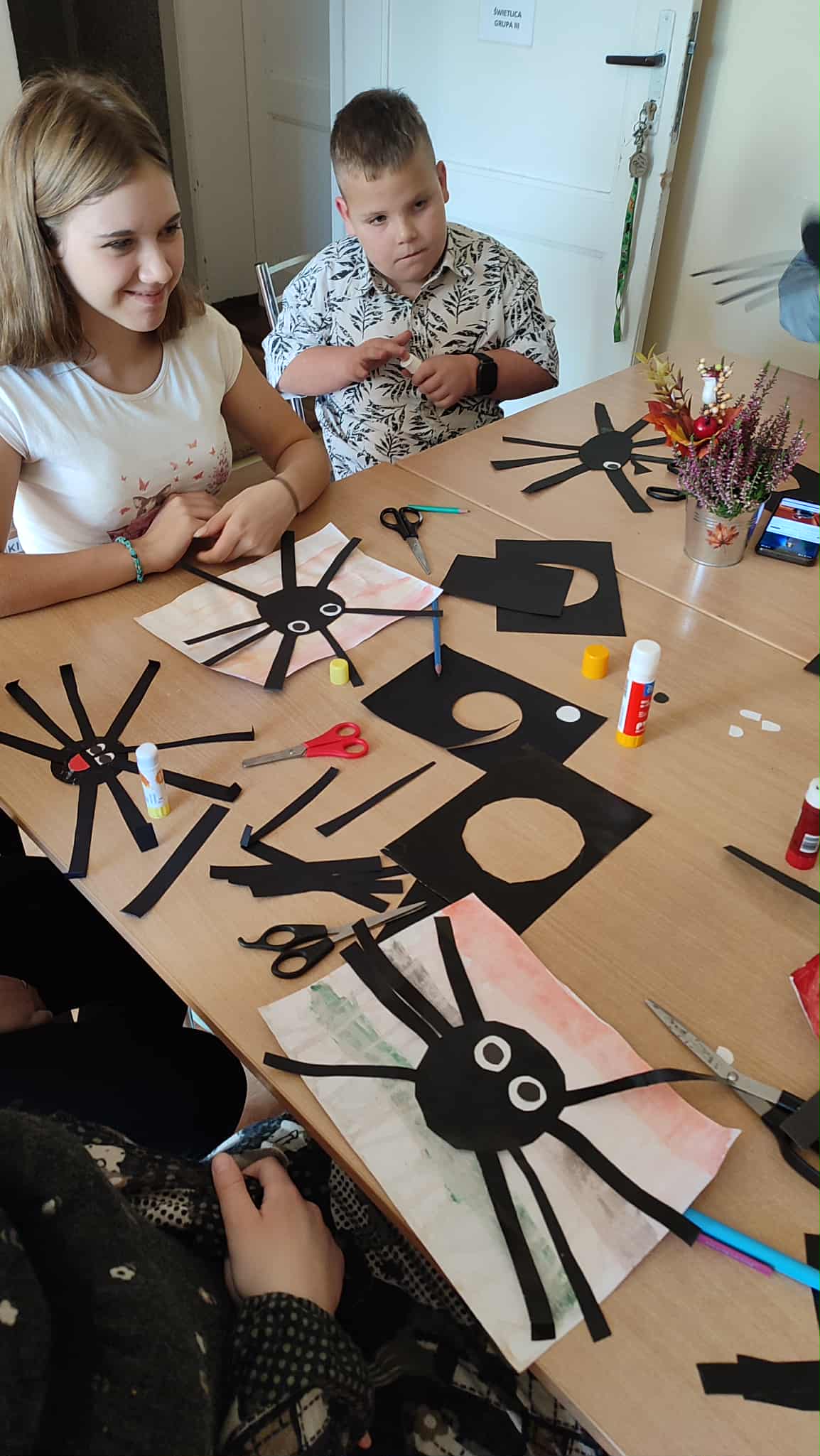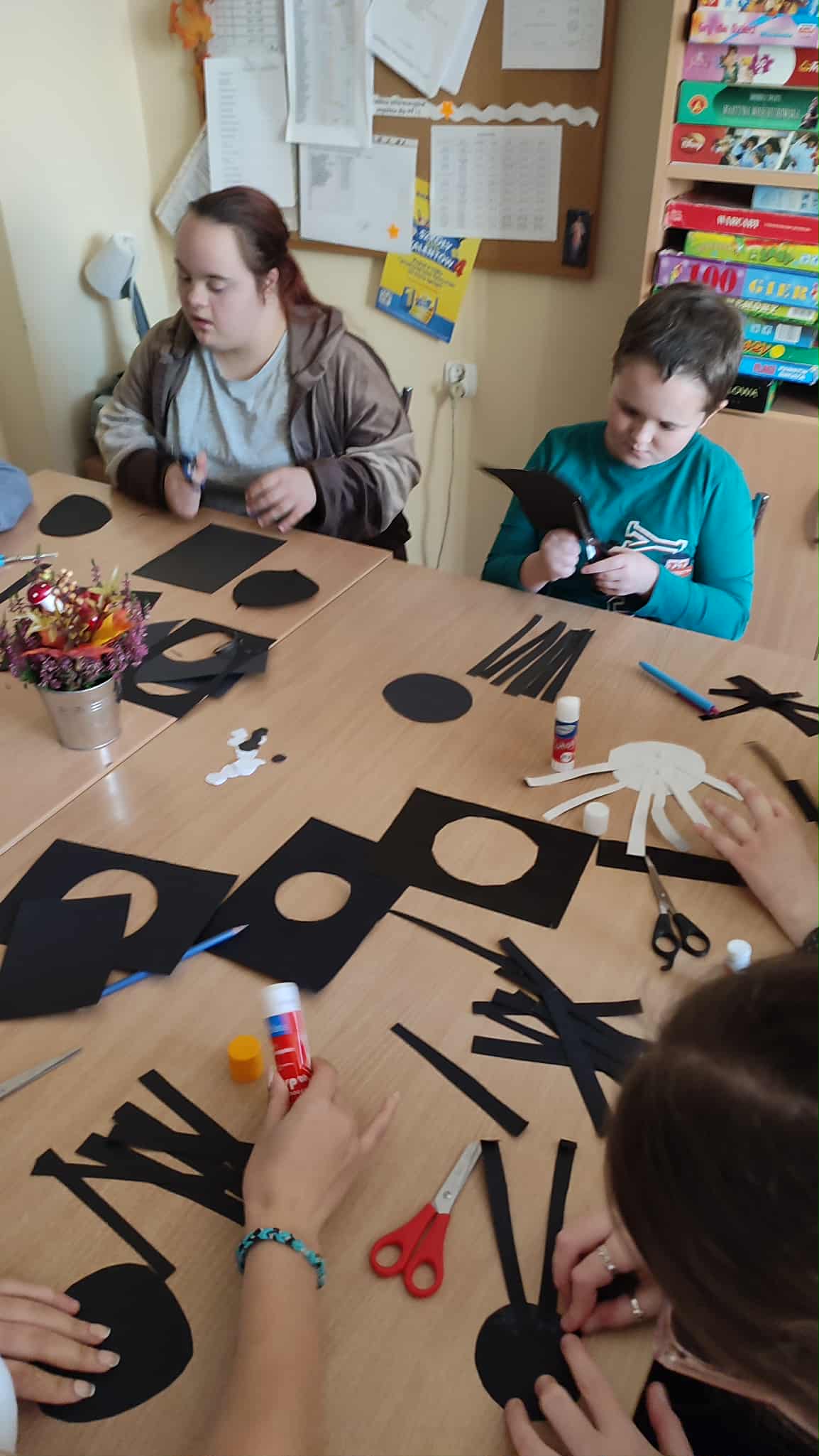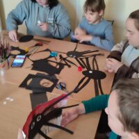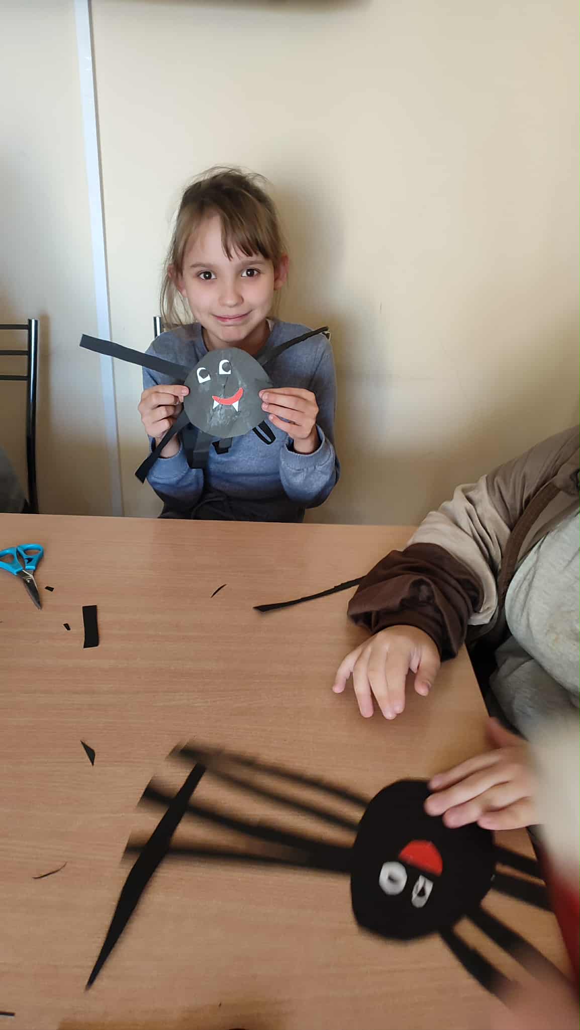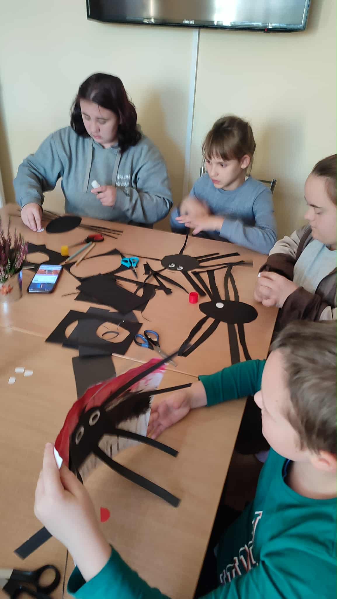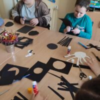 Wychowankowie II i III grupy uczestniczyli w zajęciach plastycznych realizowanych w ramach projektu,, Kreatywne Prace” Wychowankowie podczas zajęć wykonywali pracę przedstawiającą pająka z wykorzystaniem różnorodnych materiałów plastycznych( nożyczki, kartka czarnego papieru, klej). Dzieci rozwijały wyobraźnię, precyzję ruchów, zdolności manualne. Wspólnie z wychowawcami dzieci przygotowały pajęczynę z włóczki na której zawiesiły swoje prace. Zajęcia przebiegły w miłej i twórczej atmosferze.