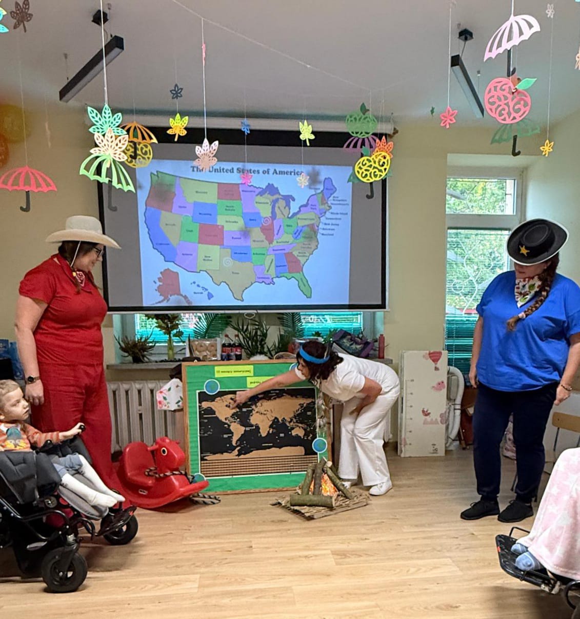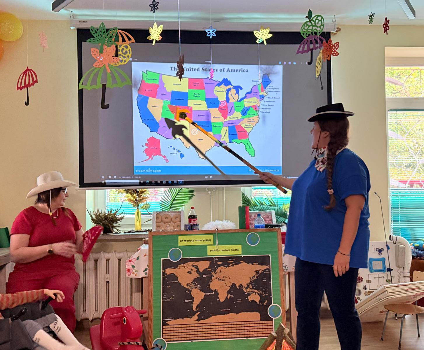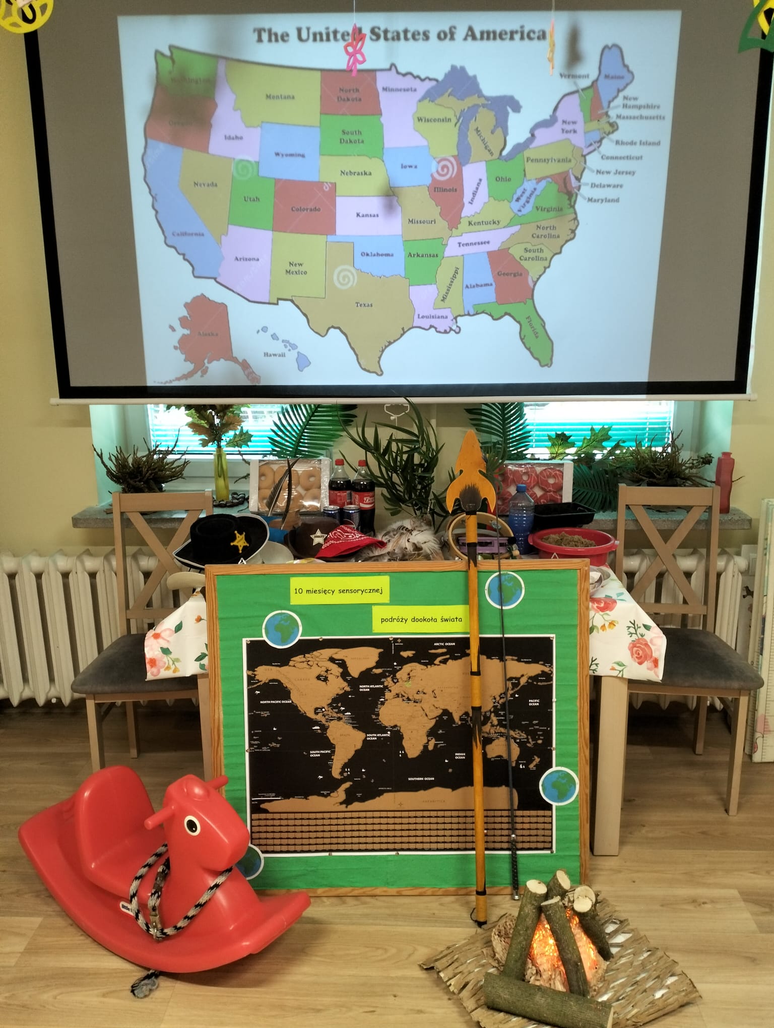W ramach innowacji uczniowie w DPS wyruszyli w kolejną niezwykłą przygodę. Tym razem ich celem były Stany Zjednoczone Ameryki – kraj różnorodności, muzyki, filmów, smaków i niezliczonych atrakcji. Zajęcia rozpoczęły się od piosenki o amerykańskich stanach, a następnie uczniowie wyruszyli w wirtualną podróż po kraju – odwiedzili Californię, Arizonę, Texas i Nowy Jork. W Los Angeles zawitali do Hollywood, gdzie poczuli prawdziwy klimat kina; posmakowali coca-coli i popcornu. Uczestnicy zamienili się w Indian, wysłuchali piosenki i przygotowali barwne pióropusze. W rytmie coutry uczniowie ruszyli tanecznym krokiem prosto do Texasu na smaczne pianki, które tam piecze się w ognisku. Ostatnim przystankiem na trasie był Nowy Jork, gdzie wsłuchaliśmy się w odgłosy dużego miasta. W części końcowej uczniowie przygotowali amerykańską flagę wykorzystując różne techniki plastyczne. Dzięki wyjątkowej podróży uczestnicy mieli okazję poznać wszystkimi zmysłami kulturę, muzykę i smaki Ameryki.