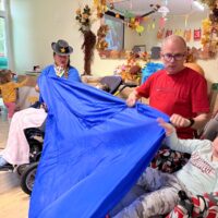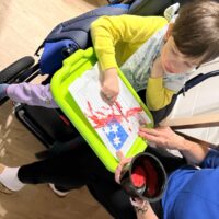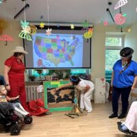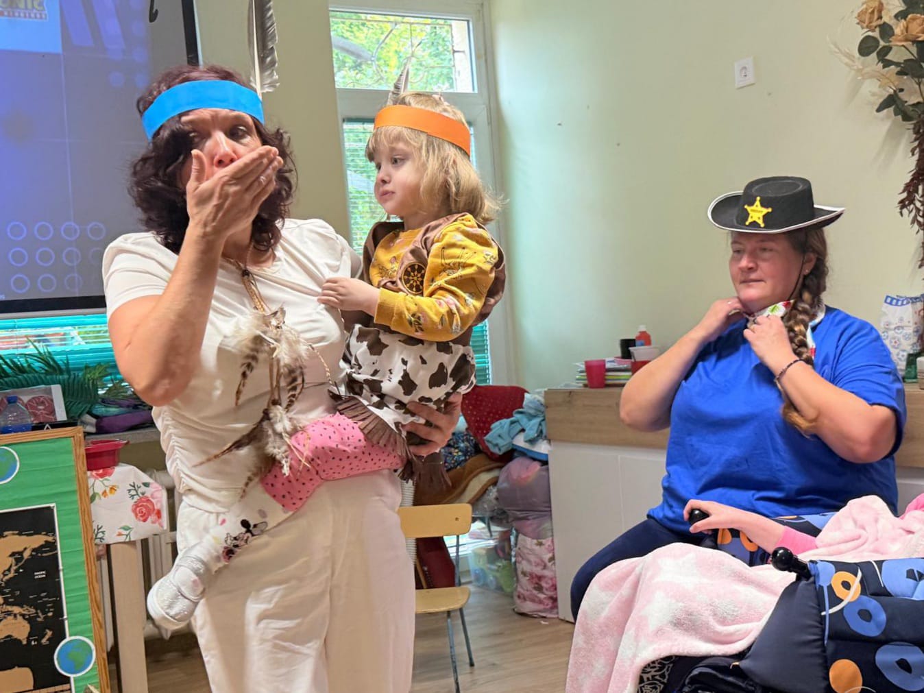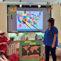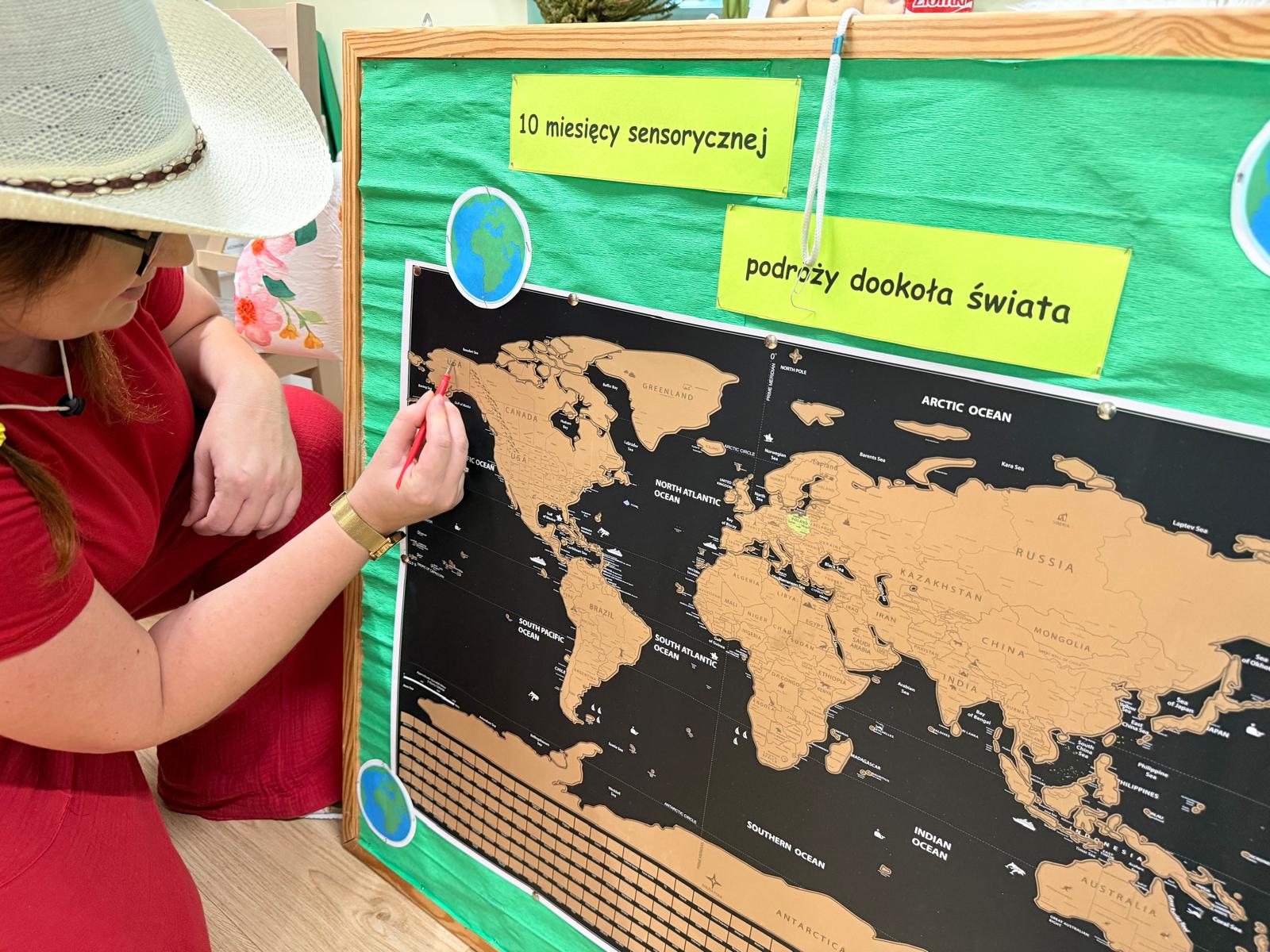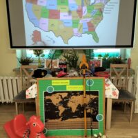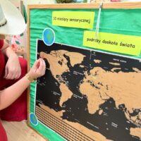 W ramach innowacji uczniowie w DPS wyruszyli w kolejną niezwykłą przygodę. Tym razem ich celem były Stany Zjednoczone Ameryki – kraj różnorodności, muzyki, filmów, smaków i niezliczonych atrakcji. Zajęcia rozpoczęły się od piosenki o amerykańskich stanach, a następnie uczniowie wyruszyli w wirtualną podróż po kraju – odwiedzili Californię, Arizonę, Texas i Nowy Jork. W Los Angeles zawitali do Hollywood, gdzie poczuli prawdziwy klimat kina; posmakowali coca-coli i popcornu. Uczestnicy zamienili się w Indian, wysłuchali piosenki i przygotowali barwne pióropusze. W rytmie coutry uczniowie ruszyli tanecznym krokiem prosto do Texasu na smaczne pianki, które tam piecze się w ognisku. Ostatnim przystankiem na trasie był Nowy Jork, gdzie wsłuchaliśmy się w odgłosy dużego miasta. W części końcowej uczniowie przygotowali amerykańską flagę wykorzystując różne techniki plastyczne. Dzięki wyjątkowej podróży uczestnicy mieli okazję poznać wszystkimi zmysłami kulturę, muzykę i smaki Ameryki.