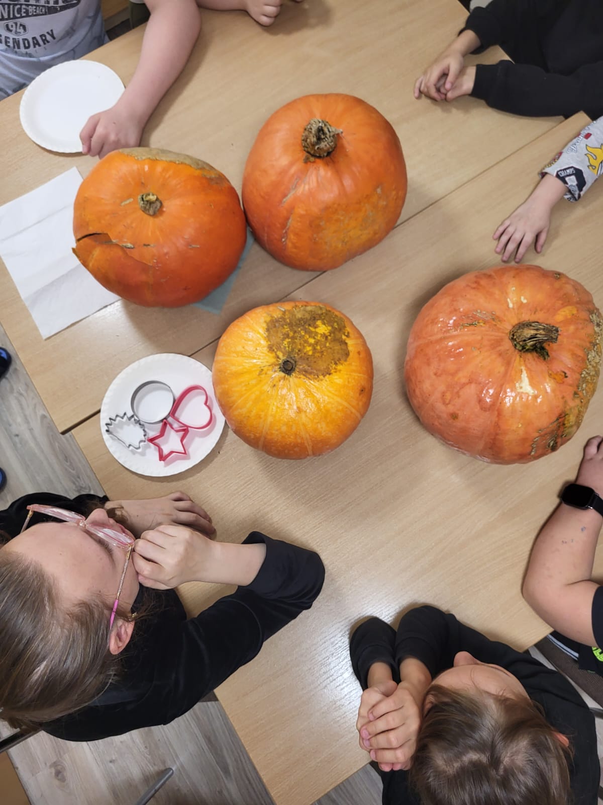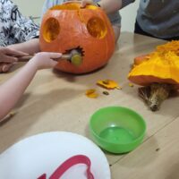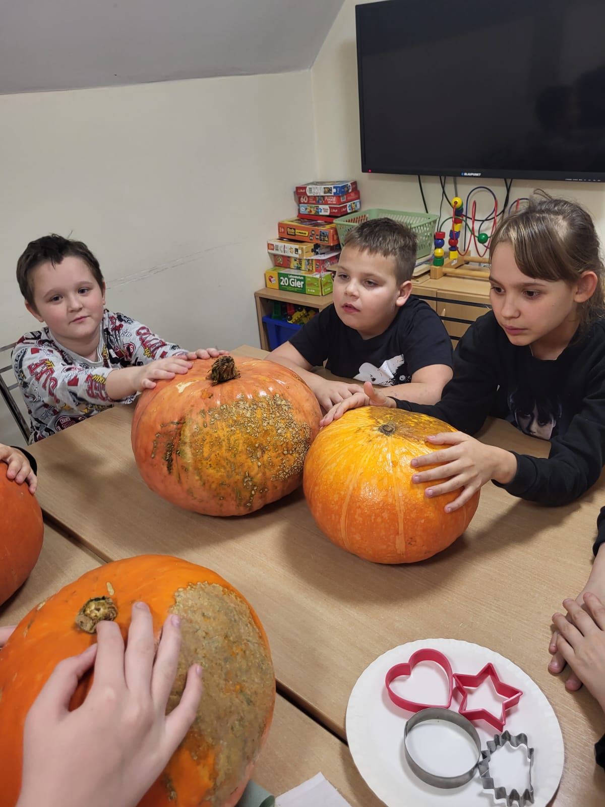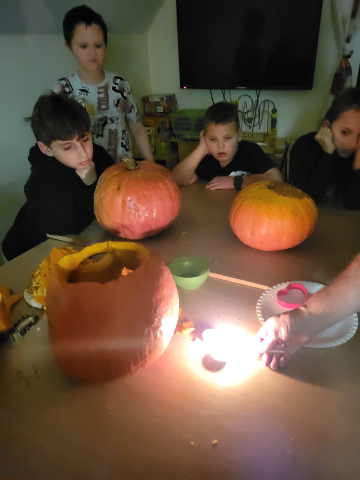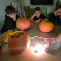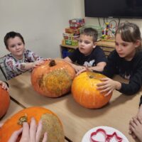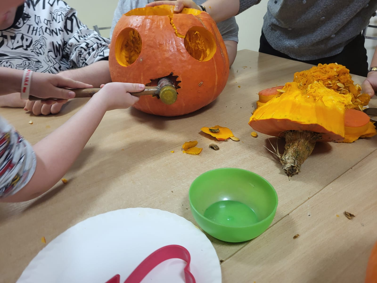 Ktoś powiedział, że zrobić i podświetlić dynię to pestka, ale wcale tak nie było. Grupa 1 i 2 podjęła próbę zmierzenia się z tym zadaniem. Ciężkie dynie wnieśliśmy na II piętro. Nie taka to „pestka”. Rozkroiliśmy pierwszą, coś się z niej wylało. Rozkroiliśmy drugą. Było w niej dużo miąższu i wiele pestek. Oddzieliliśmy pestki od miąższu, resztę wyjęliśmy. Wycięliśmy foremką dwoje oczu i inną foremką usta. Wstawiliśmy dwie świeczki, wychowawca je zapalił, zamknęliśmy wieko dyni, a ktoś inny zgasił światło. Wtedy dopiero zobaczyliśmy, że dynia stała się jak żywa.