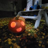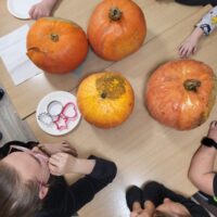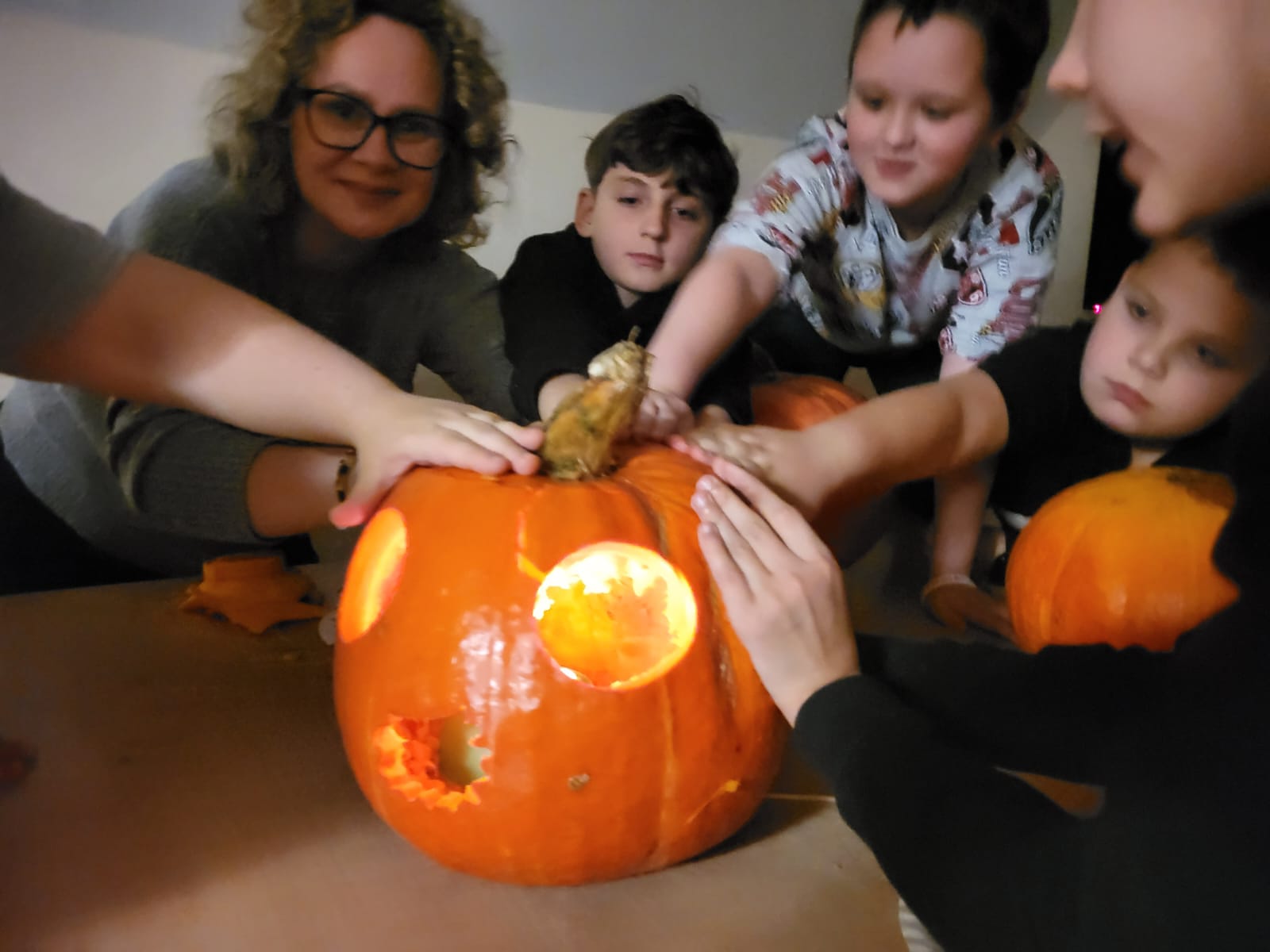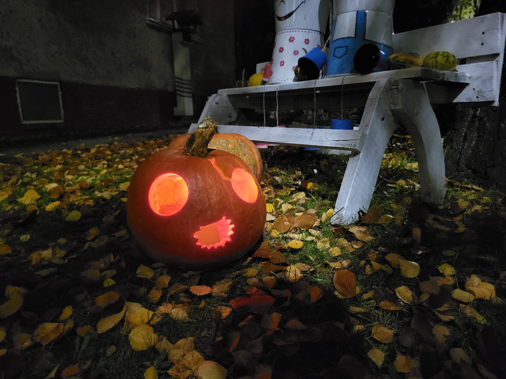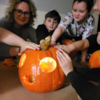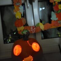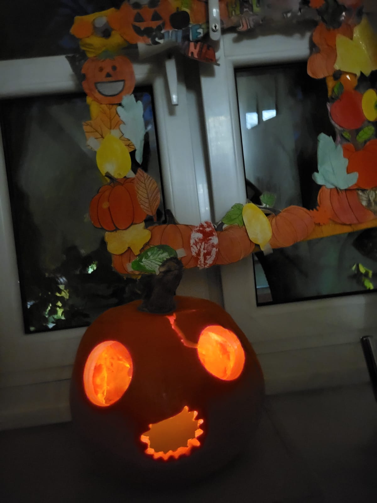 Ktoś powiedział, że zrobić i podświetlić dynię to pestka, ale wcale tak nie było. Grupa 1 i 2 podjęła próbę zmierzenia się z tym zadaniem. Ciężkie dynie wnieśliśmy na II piętro. Nie taka to „pestka”. Rozkroiliśmy pierwszą, coś się z niej wylało. Rozkroiliśmy drugą. Było w niej dużo miąższu i wiele pestek. Oddzieliliśmy pestki od miąższu, resztę wyjęliśmy. Wycięliśmy foremką dwoje oczu i inną foremką usta. Wstawiliśmy dwie świeczki, wychowawca je zapalił, zamknęliśmy wieko dyni, a ktoś inny zgasił światło. Wtedy dopiero zobaczyliśmy, że dynia stała się jak żywa.