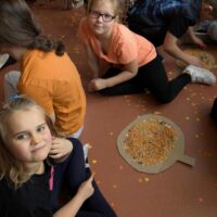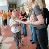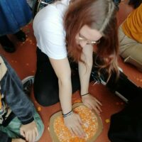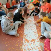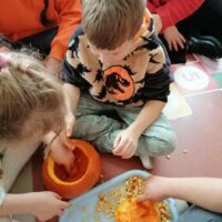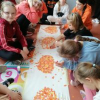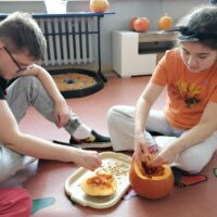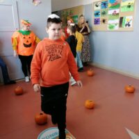 Na uczestników czekało mnóstwo atrakcji. Uczniowie mieli okazję wykazać się zdolnościami manualnymi, wyklejając papierowe dynie, wylepiając ziarnami i pestkami kartonowe wzory, a nawet wydrążając pestki i miąższ z wnętrza prawdziwych okazów. Korytarz szkolny zapełnił się unikalnymi, zabawnymi dyniowymi rzeźbami i pomysłowymi pracami.