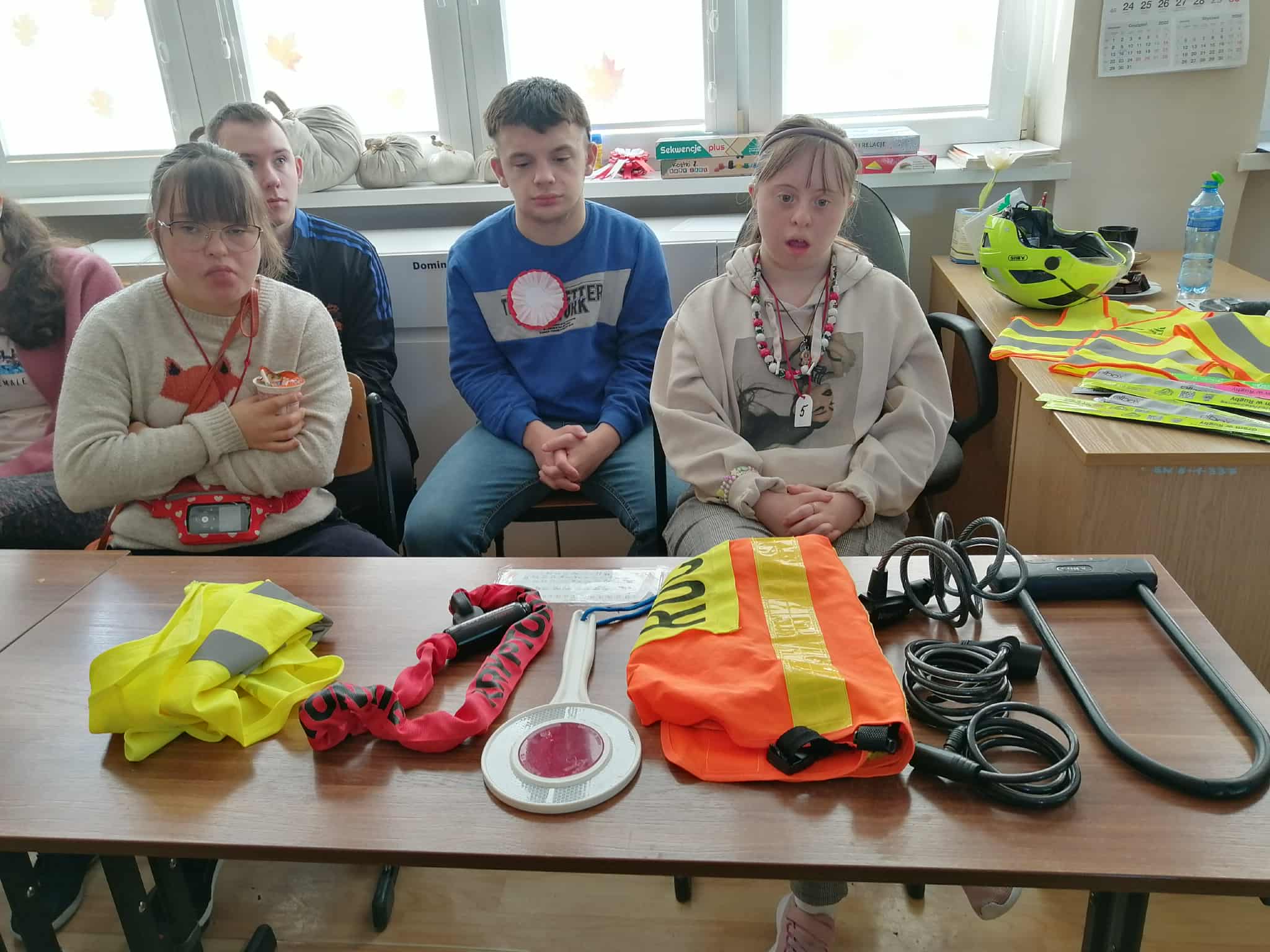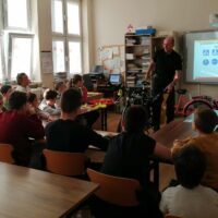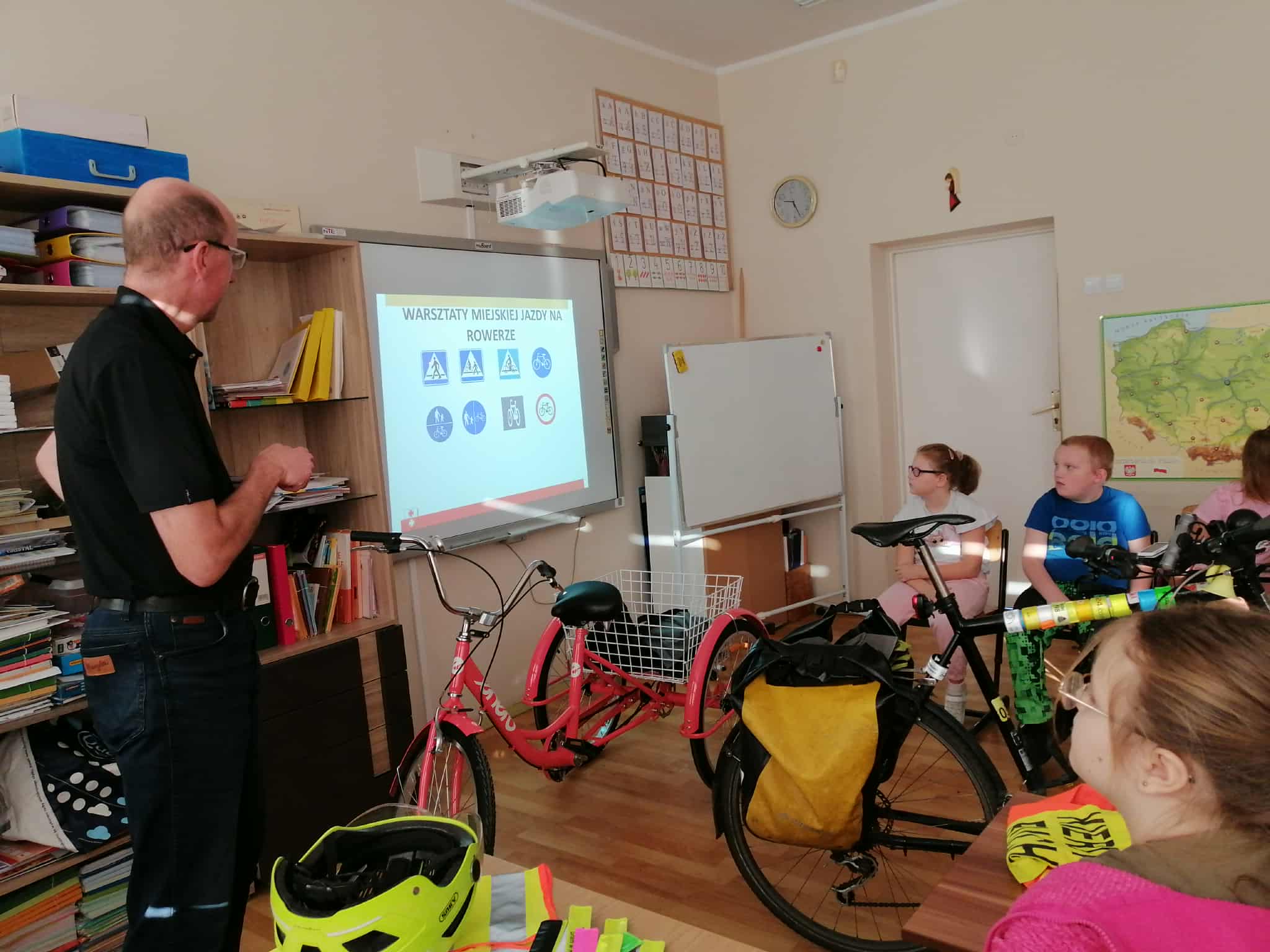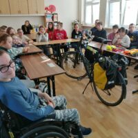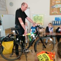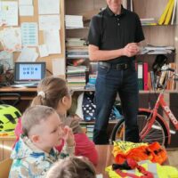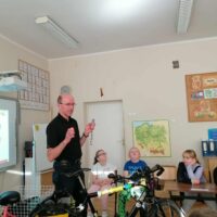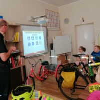 Dnia 6 listopada w ramach projektu „Na trzech kołach przez świat” oraz otrzymanego grantu z Fundacji Inter Cars, odbyło się spotkanie z przedstawicielem Urzędu Miasta ds. bezpieczeństwa ruchu rowerowego i pieszego- Panem Markiem Kammem. Celem zajęć było przypomnienie zasad bezpiecznego poruszania się po drogach oraz zwrócenie uwagi na znaczenie odpowiedniego wyposażenia rowerzysty.
