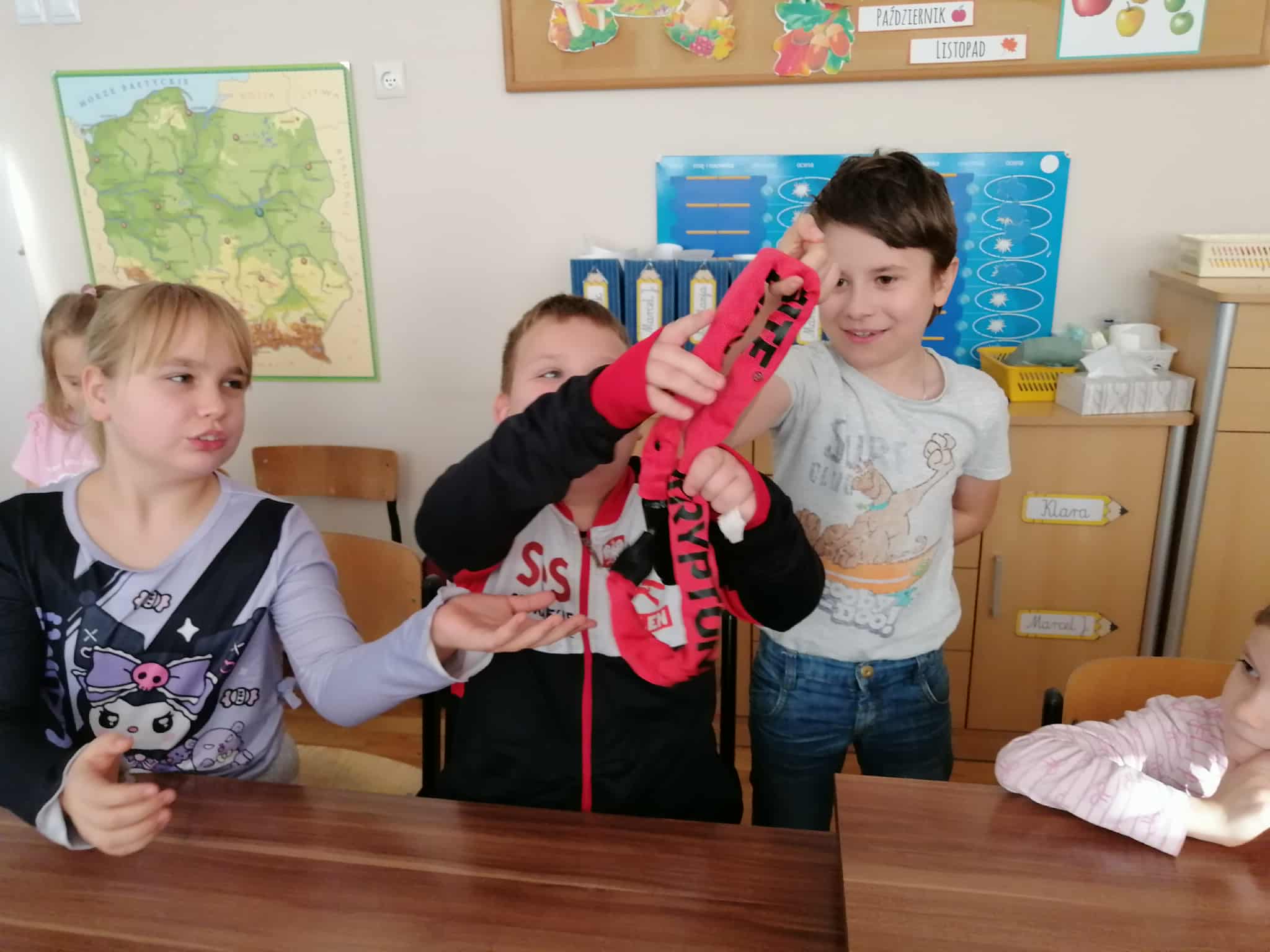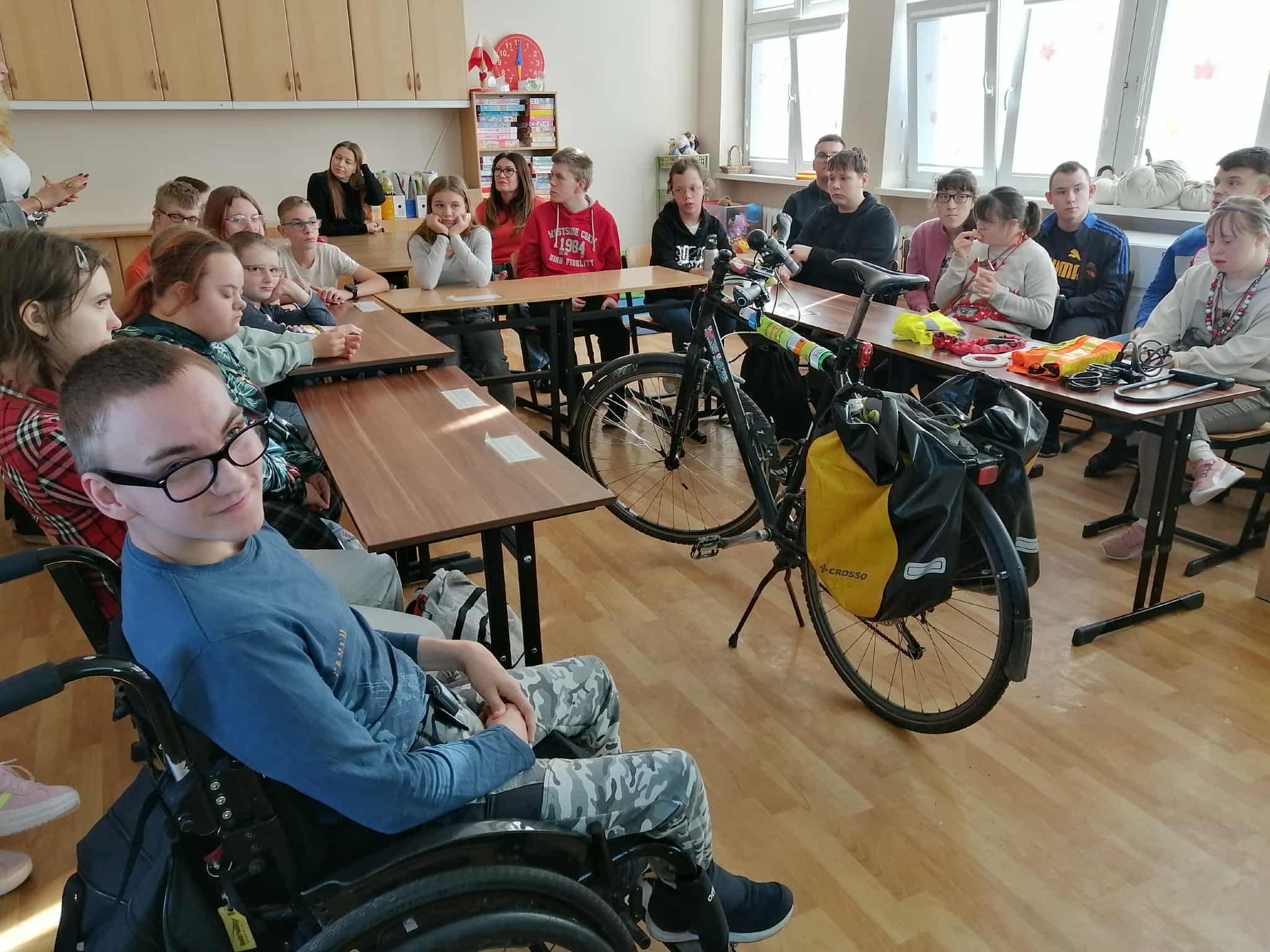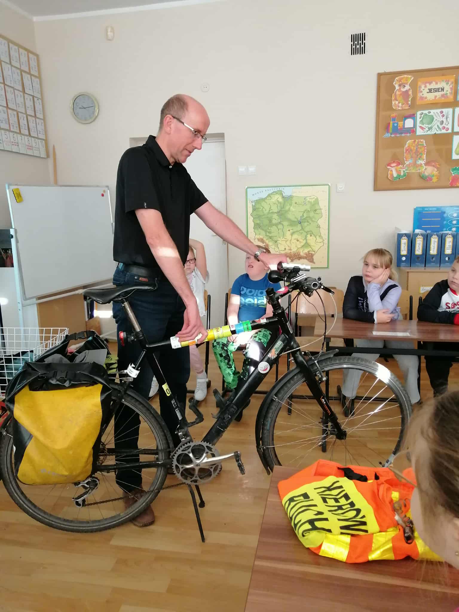 Dnia 6 listopada w ramach projektu „Na trzech kołach przez świat” oraz otrzymanego grantu z Fundacji Inter Cars, odbyło się spotkanie z przedstawicielem Urzędu Miasta ds. bezpieczeństwa ruchu rowerowego i pieszego- Panem Markiem Kammem. Celem zajęć było przypomnienie zasad bezpiecznego poruszania się po drogach oraz zwrócenie uwagi na znaczenie odpowiedniego wyposażenia rowerzysty.