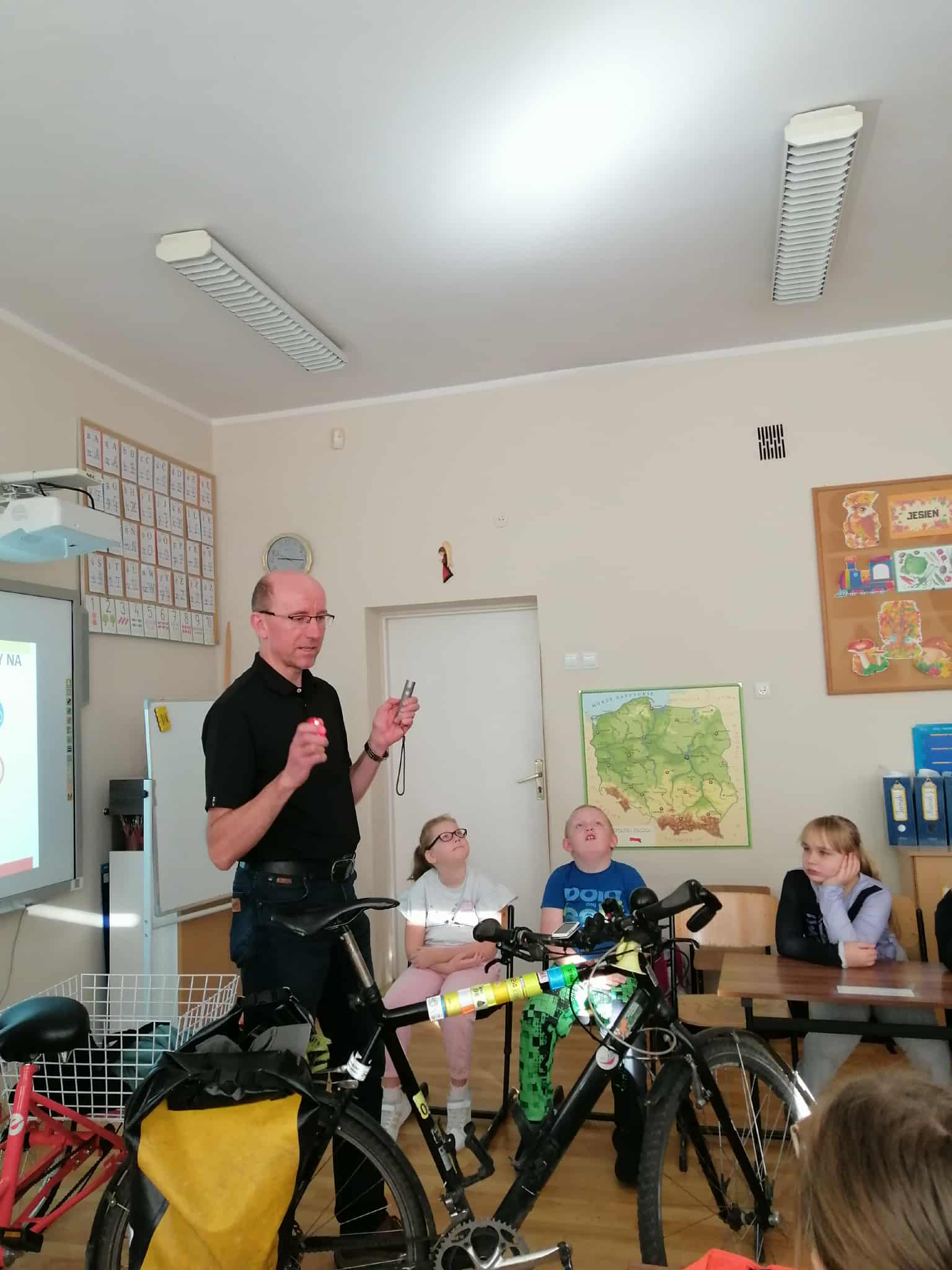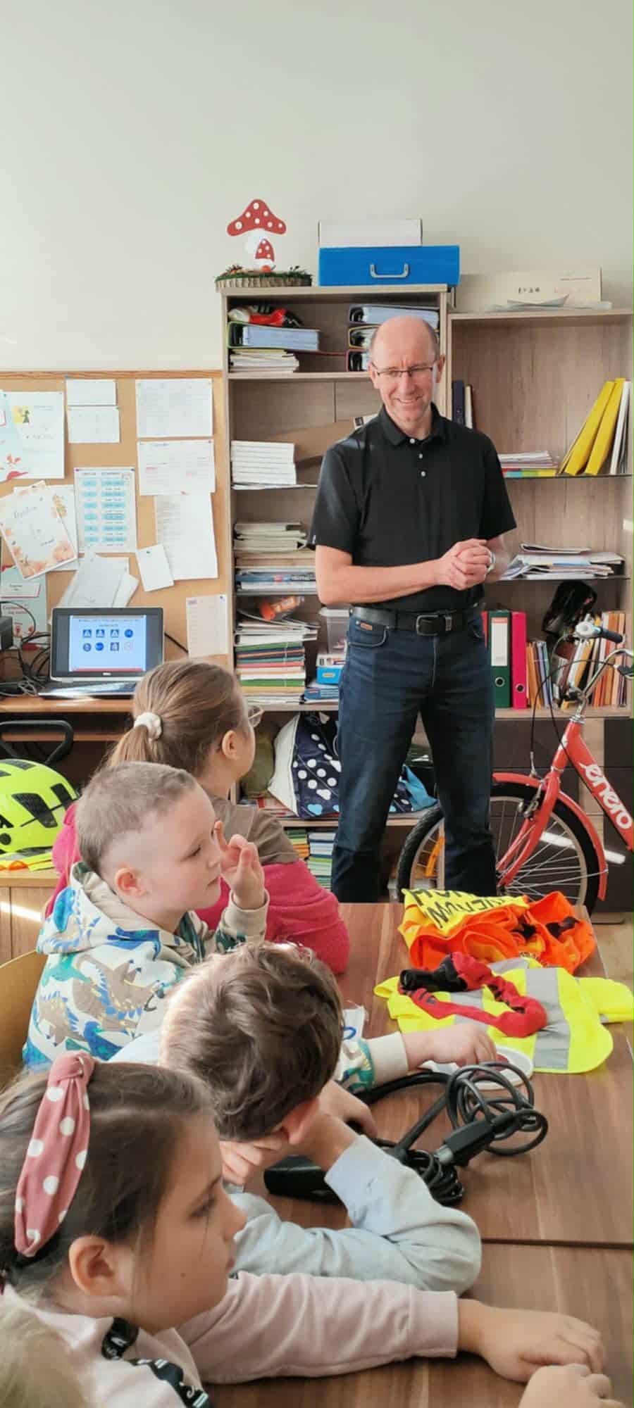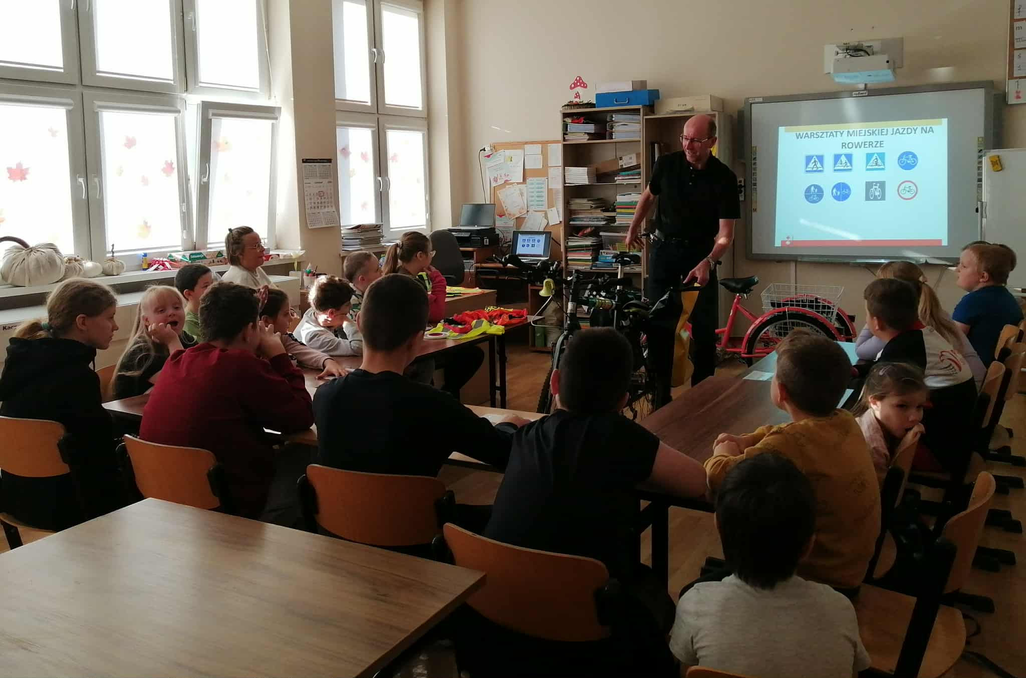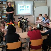 Podczas spotkania uczniowie obejrzeli ciekawą prezentację na temat przepisów ruchu drogowego dotyczących pieszych i rowerzystów. Gość opowiadał o tym, jak ważne jest noszenie odblasków, kamizelek oraz kasku ochronnego, a także o tym, jak właściwie przygotować rower do jazdy.