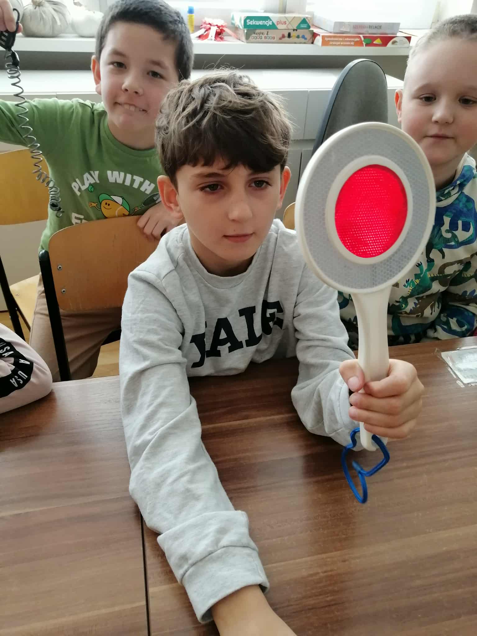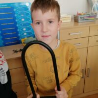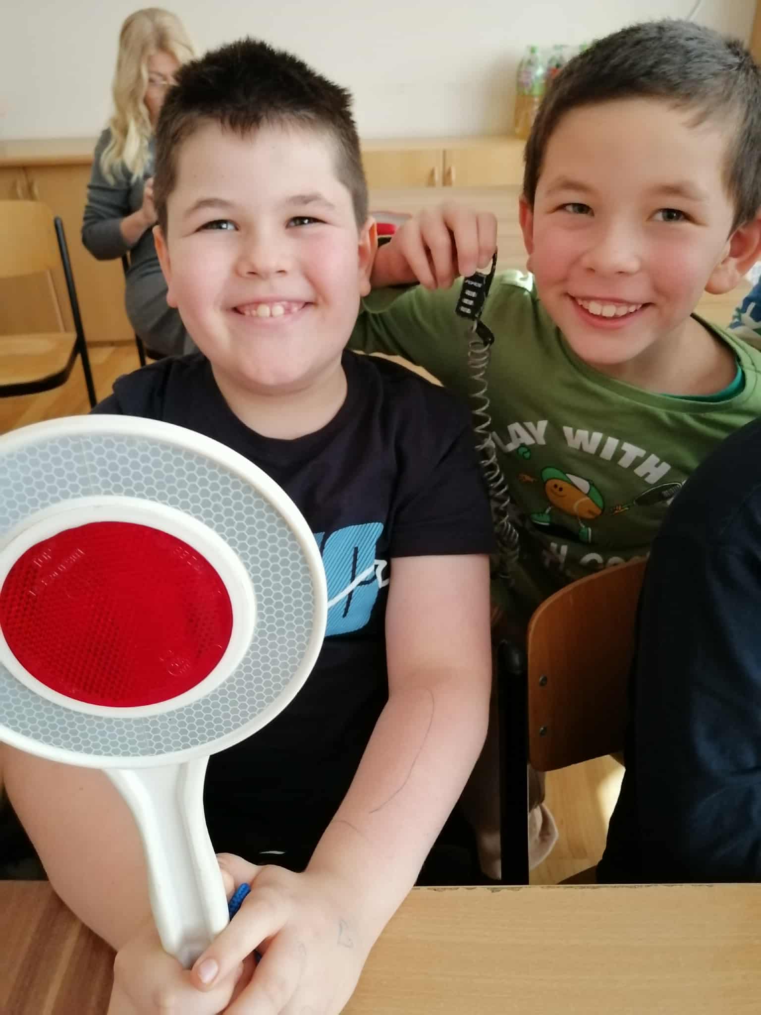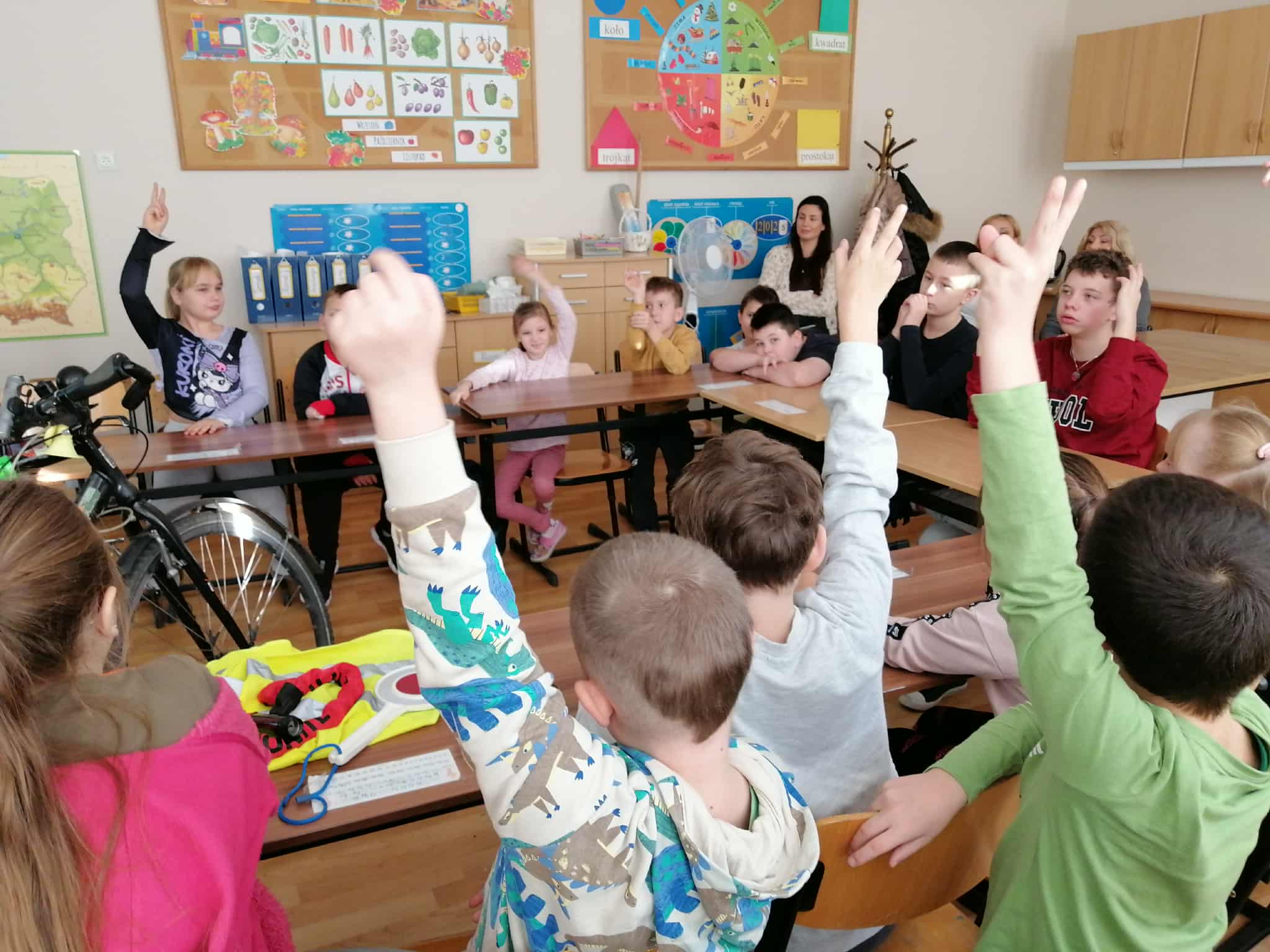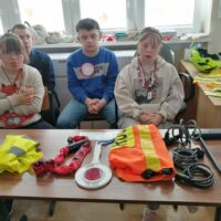 Podczas spotkania uczniowie obejrzeli ciekawą prezentację na temat przepisów ruchu drogowego dotyczących pieszych i rowerzystów. Gość opowiadał o tym, jak ważne jest noszenie odblasków, kamizelek oraz kasku ochronnego, a także o tym, jak właściwie przygotować rower do jazdy.