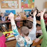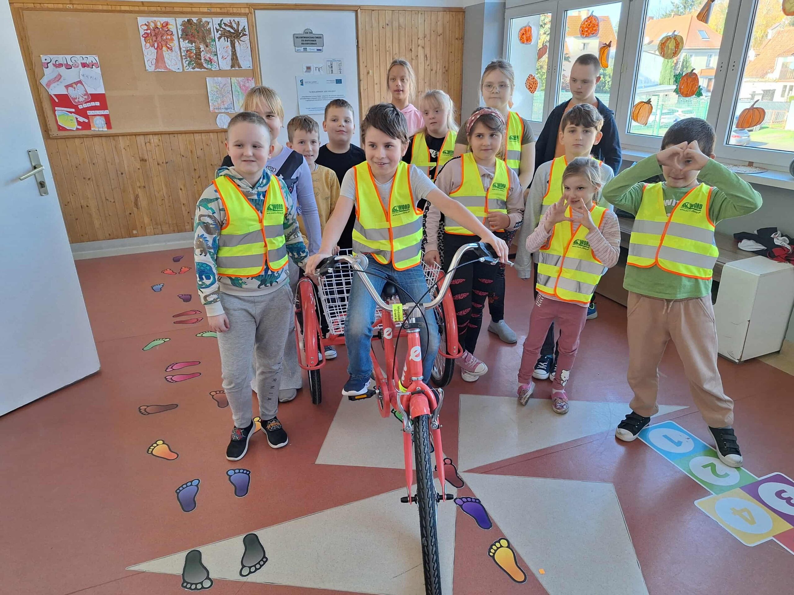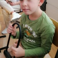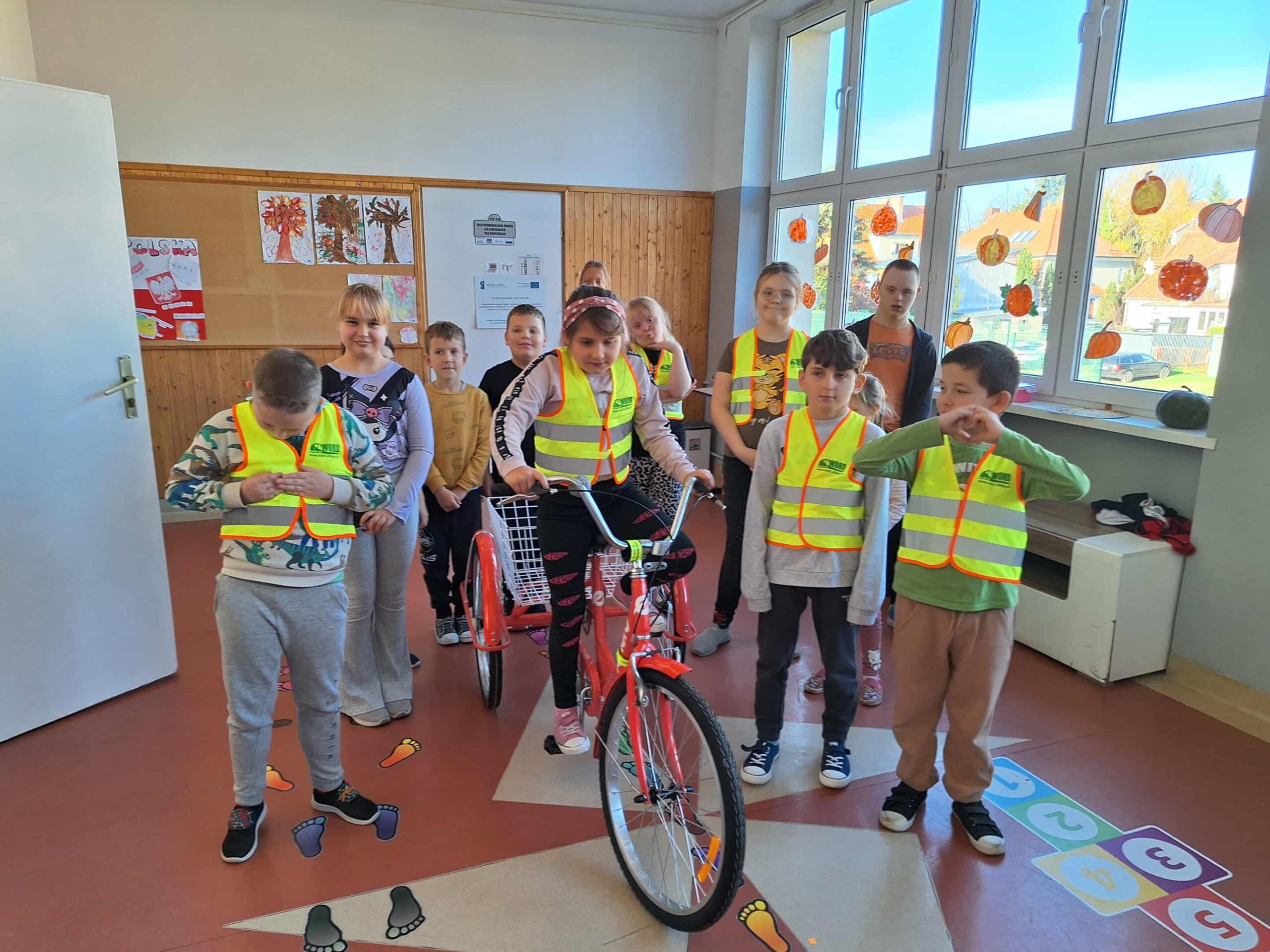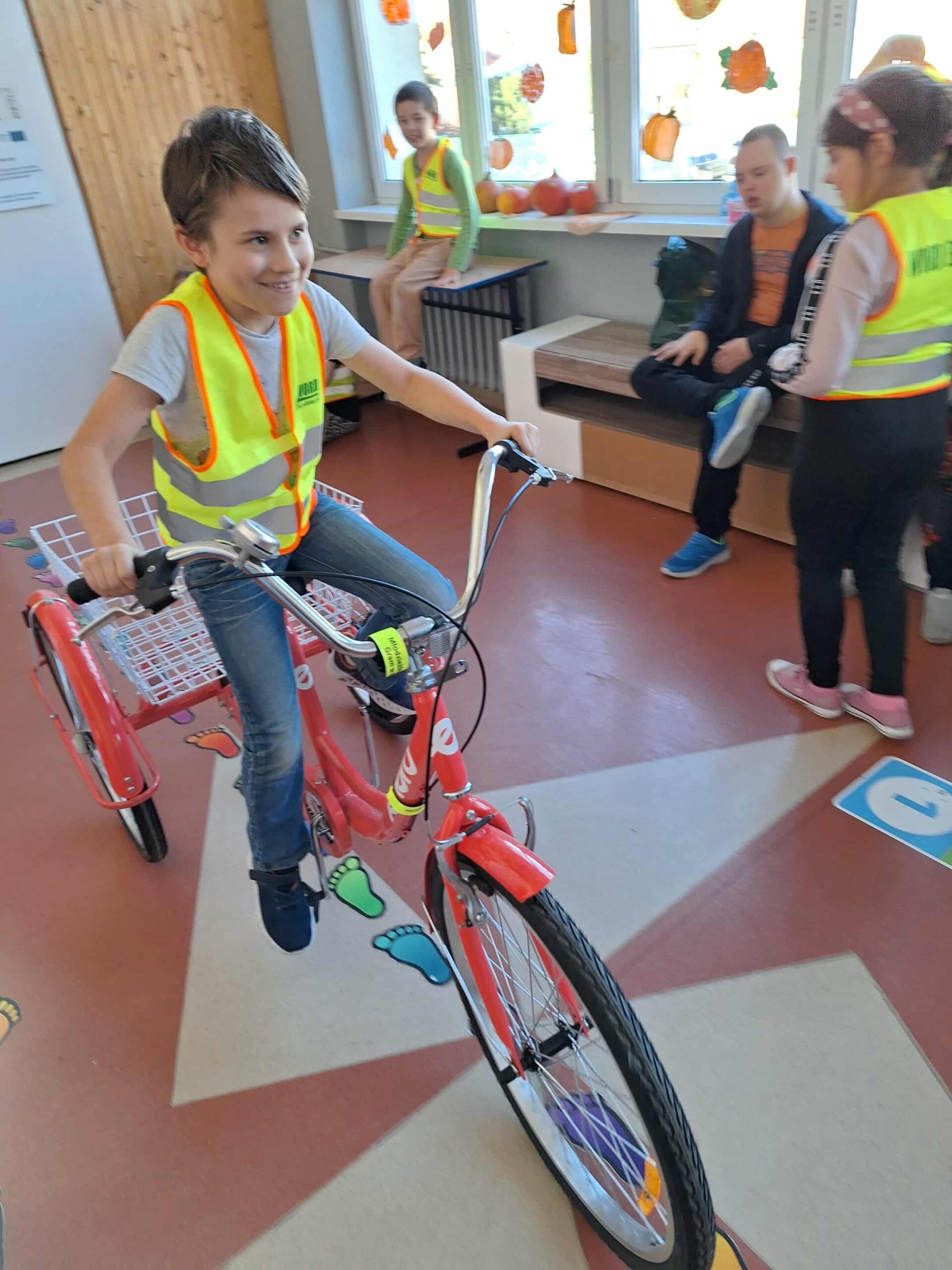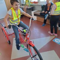 Po części teoretycznej odbyły się zajęcia praktyczne. Uczestnicy mieli okazję samodzielnie założyć kamizelkę odblaskową i kask rowerowy, a następnie spróbować swoich sił w jeździe na rowerze trójkołowym. Ćwiczenia pozwoliły utrwalić zasady bezpiecznego poruszania się po ścieżkach rowerowych i chodnikach.